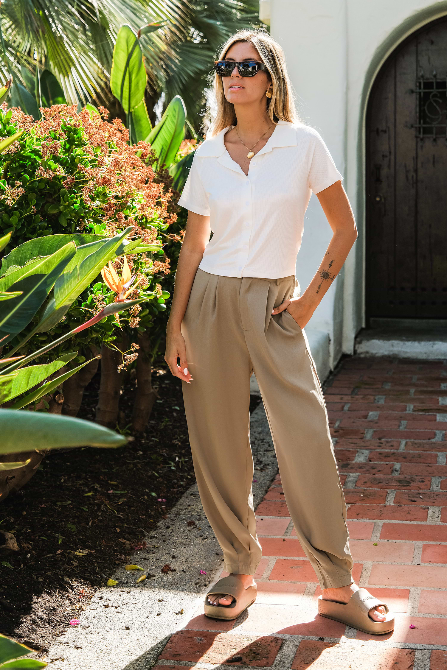 Pantalones caqui con pernera cónica y cintura con botones