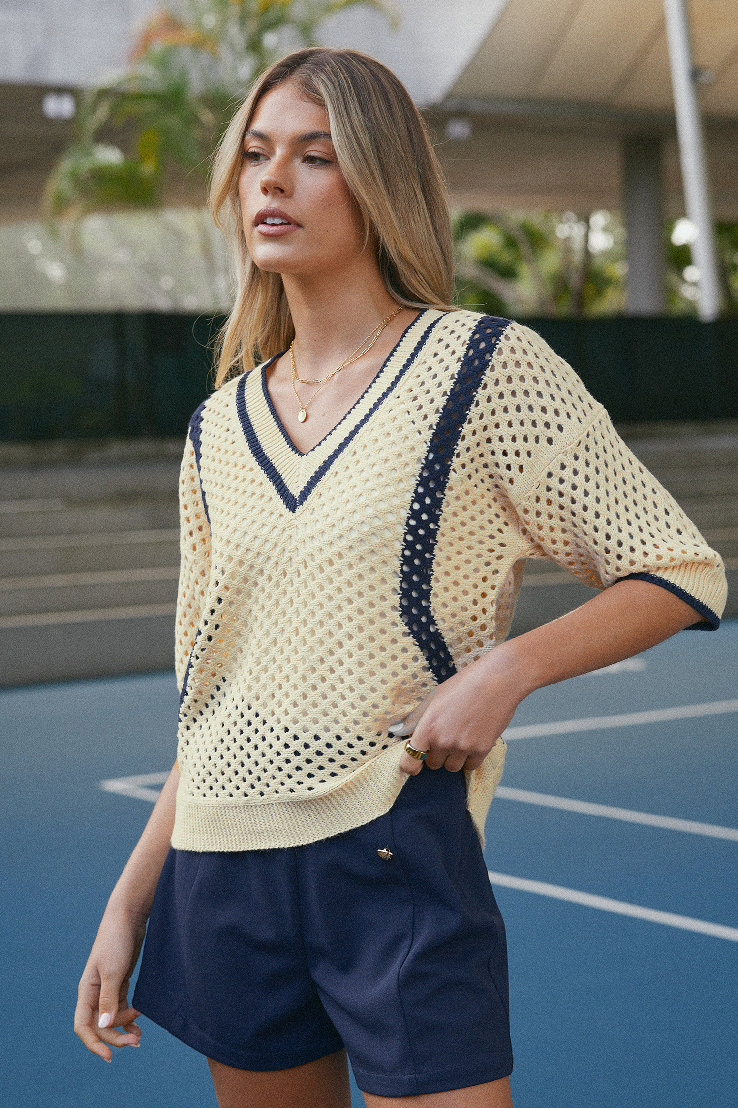 Neutral con un toque diferente. El suéter de punto abierto de media manga con bloques de color caqui presenta llamativos detalles en contraste negro que agregan un toque atrevido a su diseño relajado.