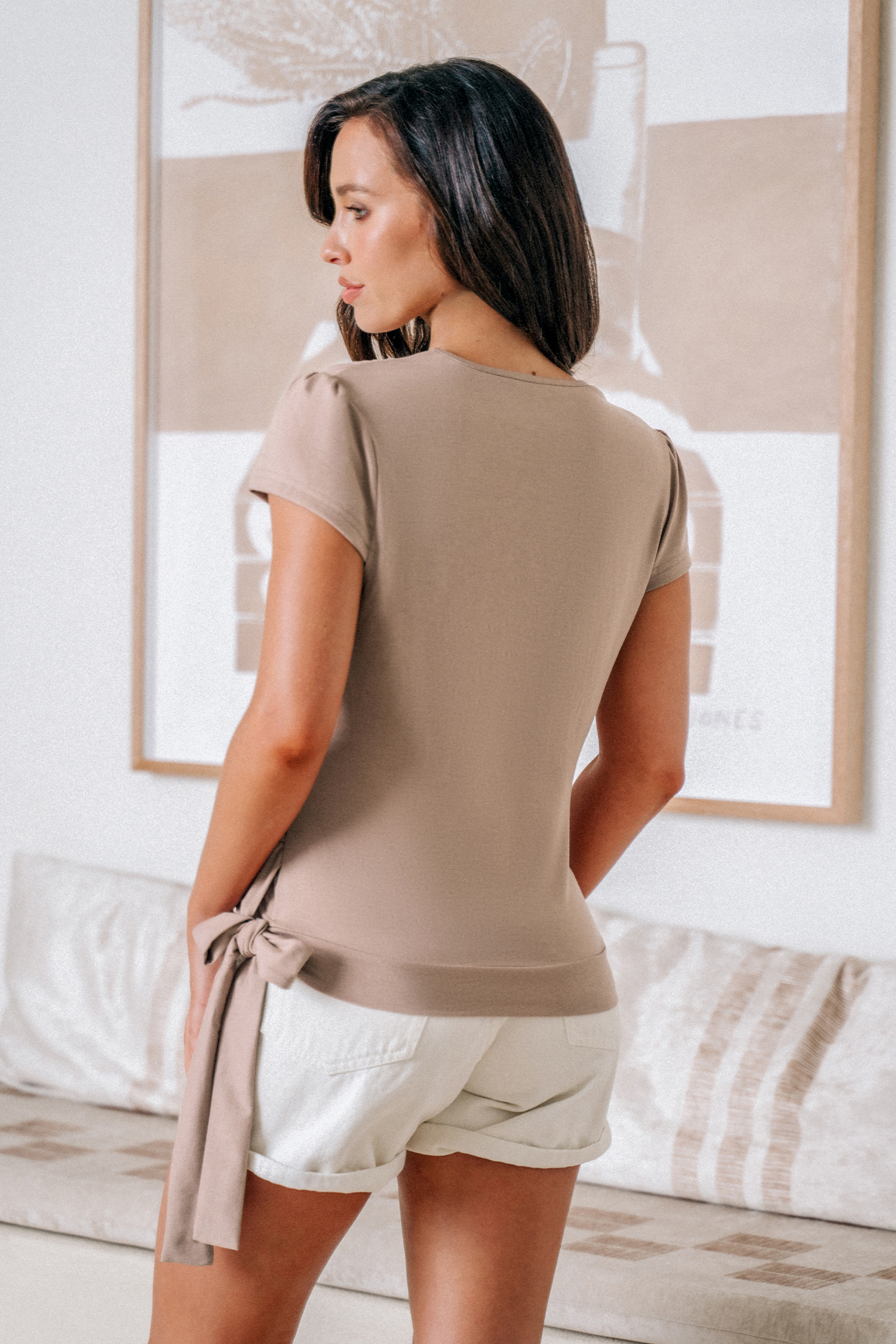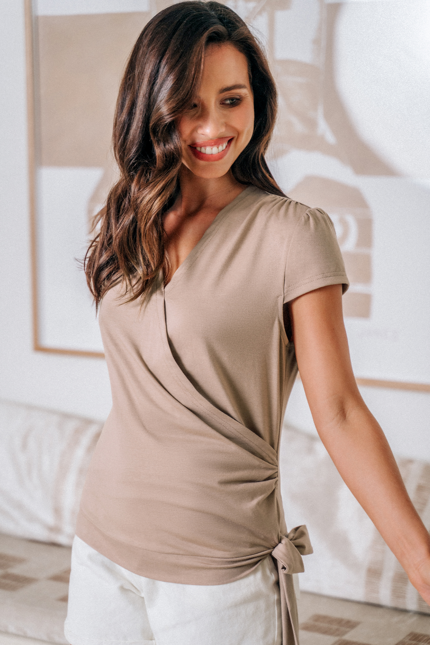 Top de punto con mangas con volantes y sobrepelliz caqui