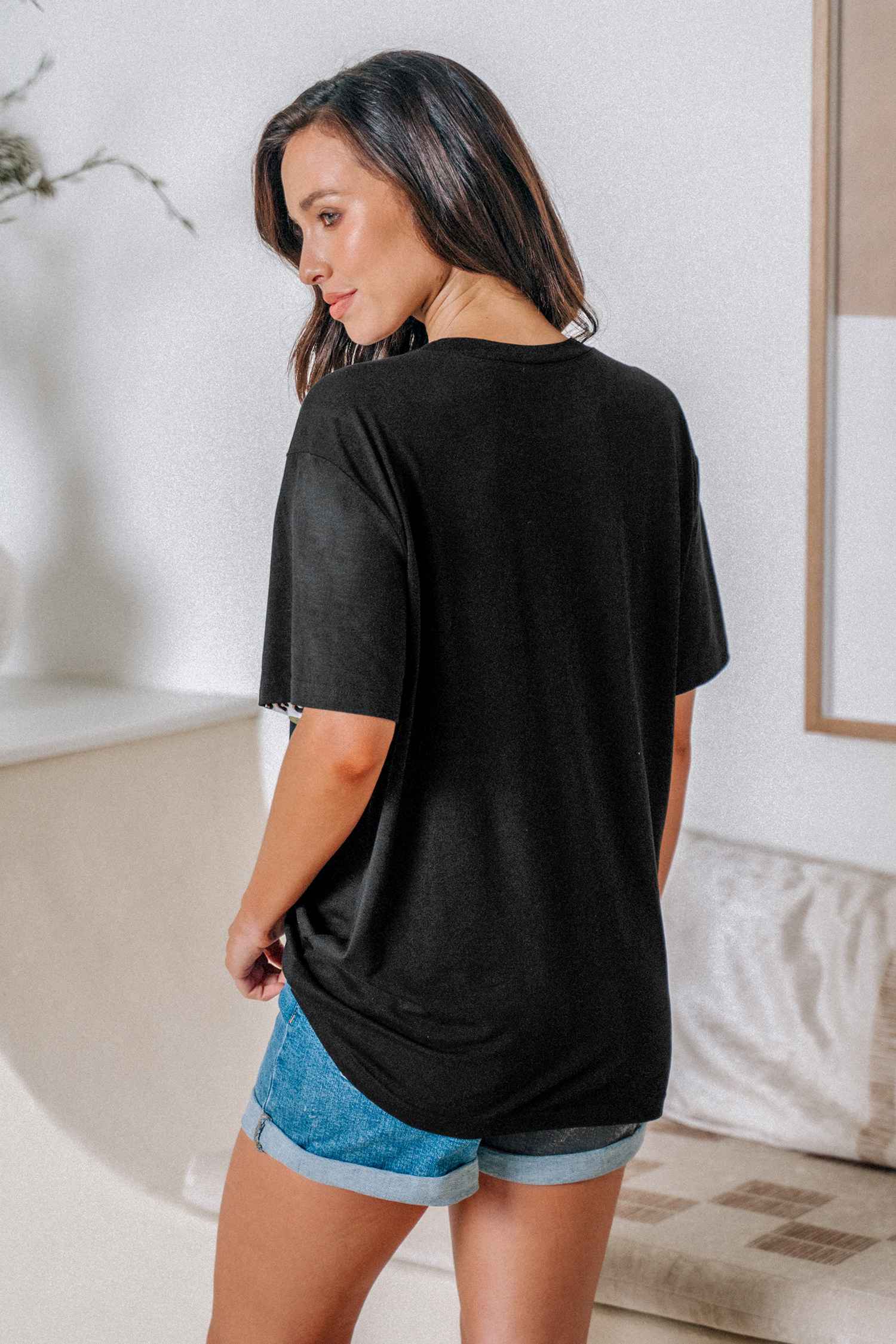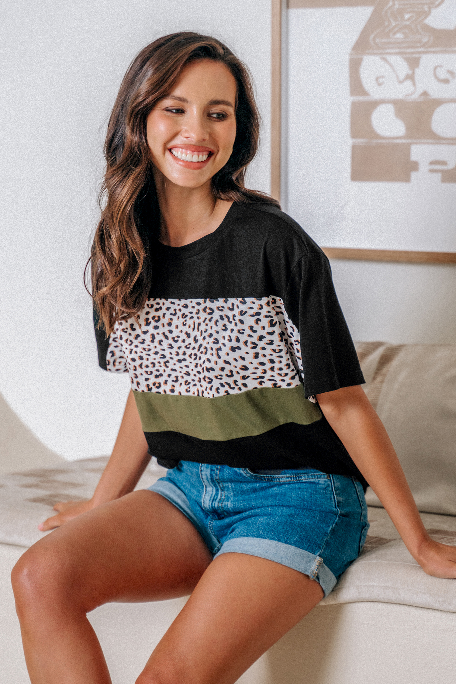 Camiseta de punto de manga corta con bloques de color de leopardo