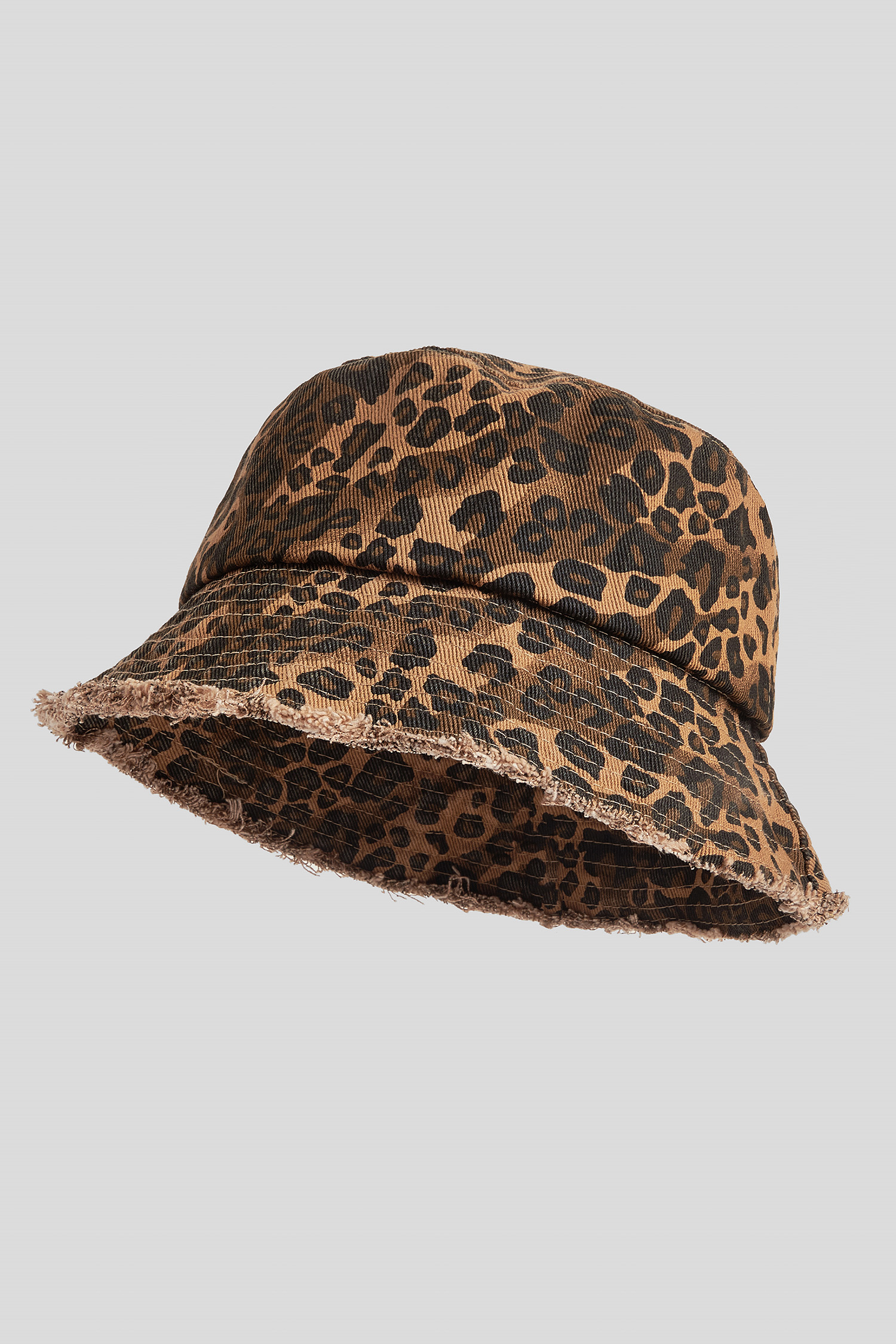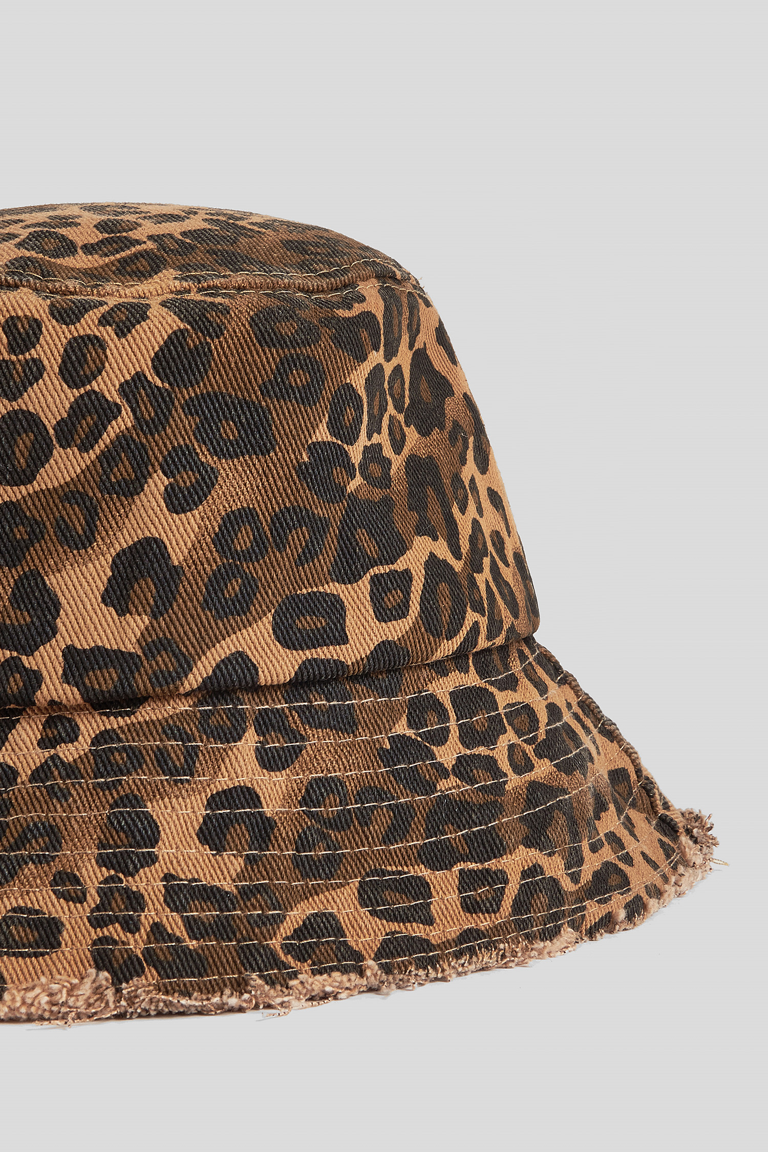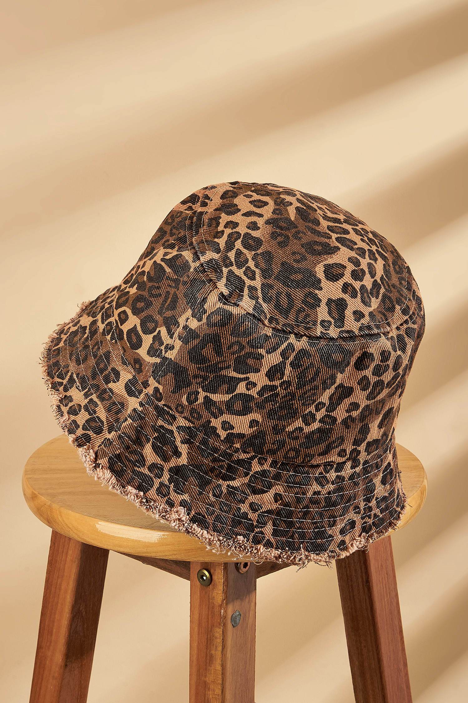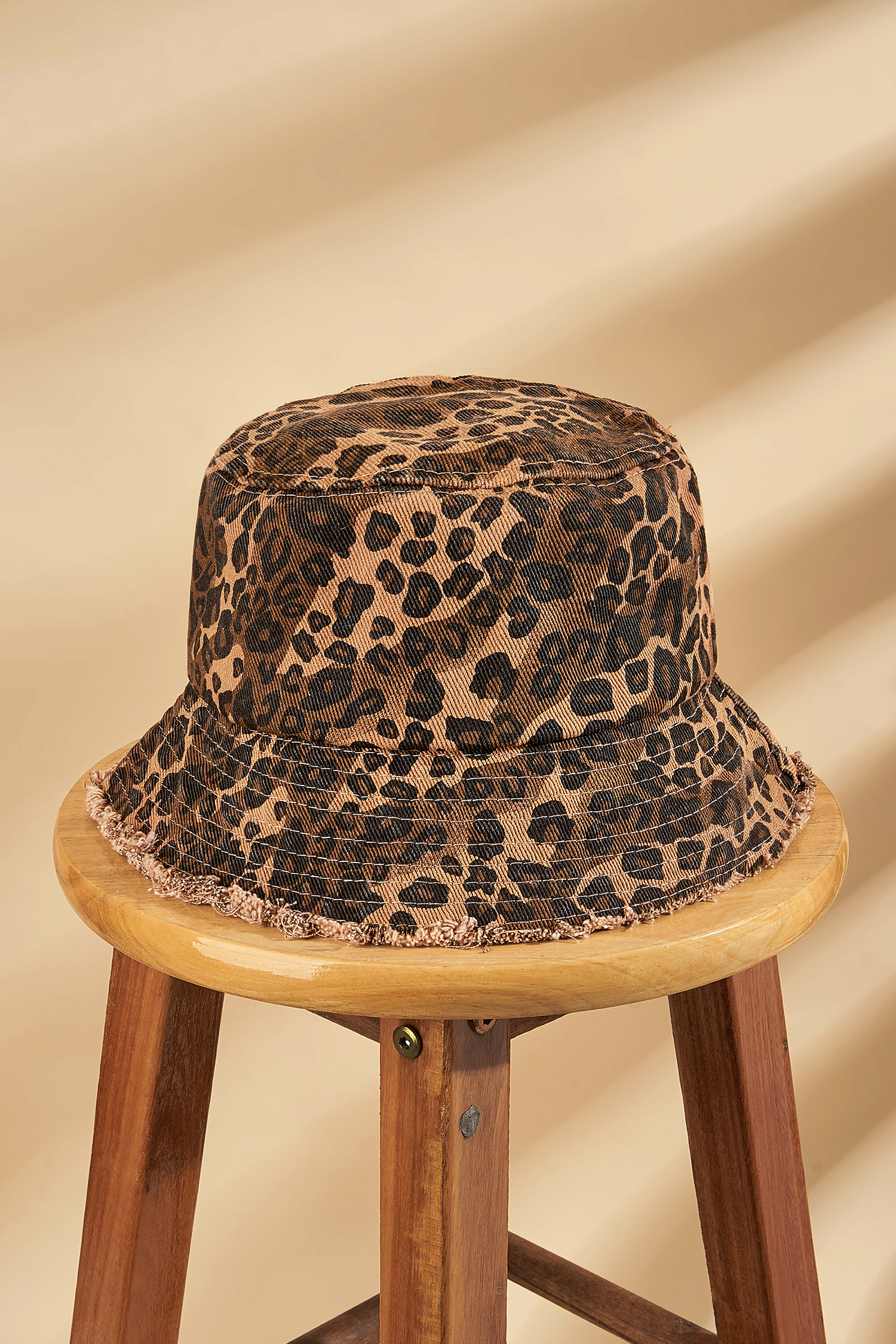 Sombrero de pescador con ribete deshilachado y estampado de leopardo