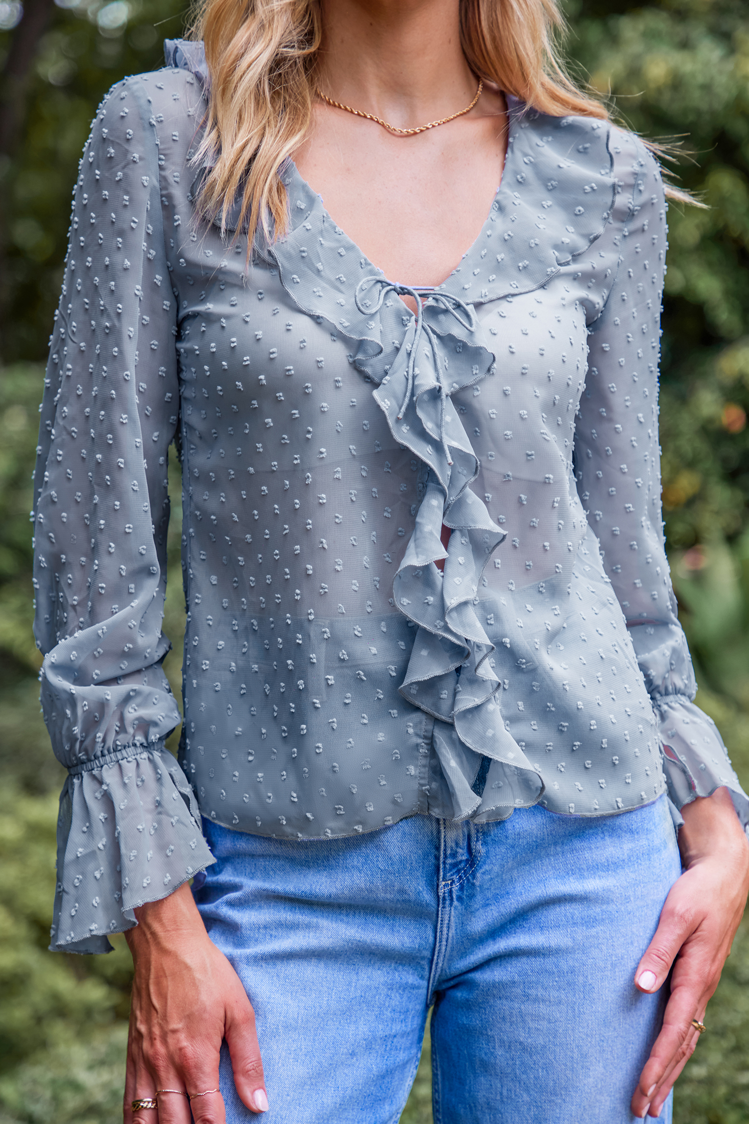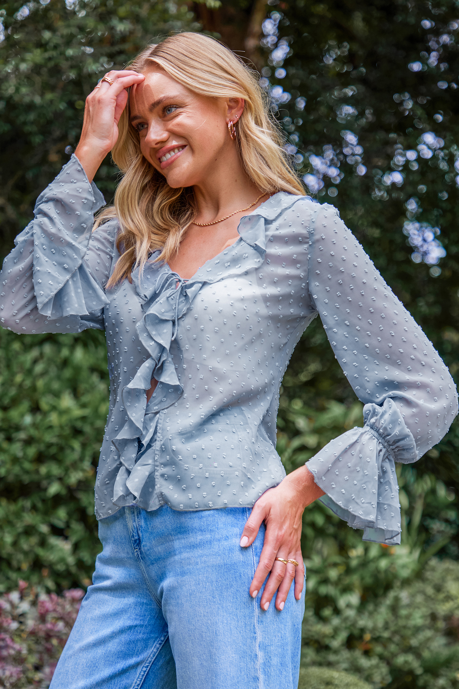 Blusa de lunares suizos con volantes y mangas tipo blusón azul claro