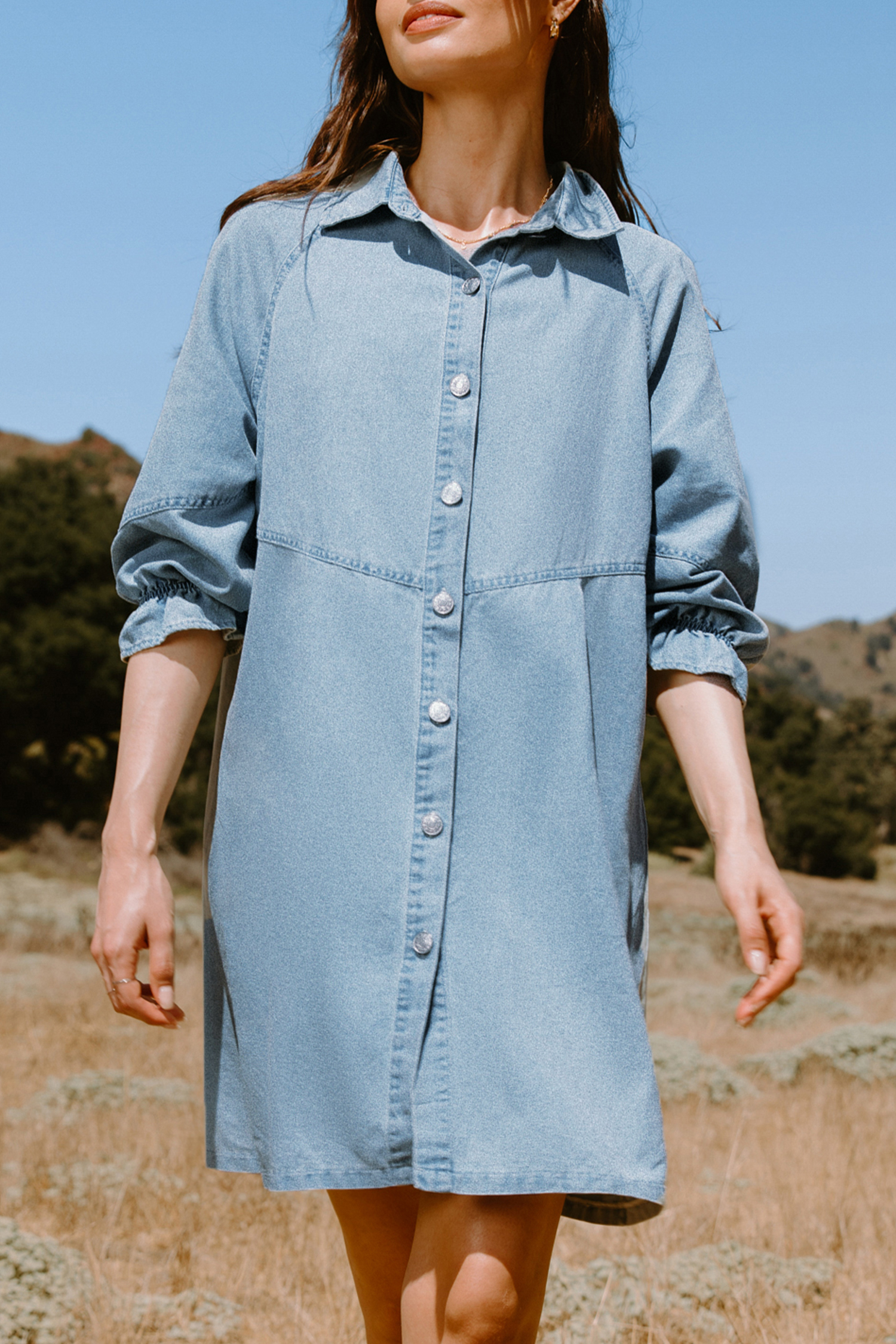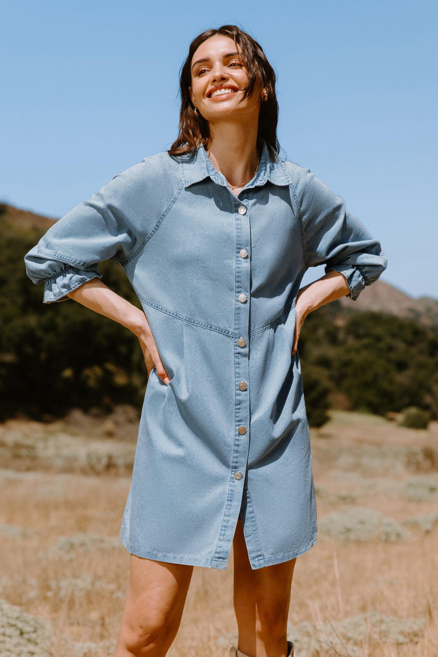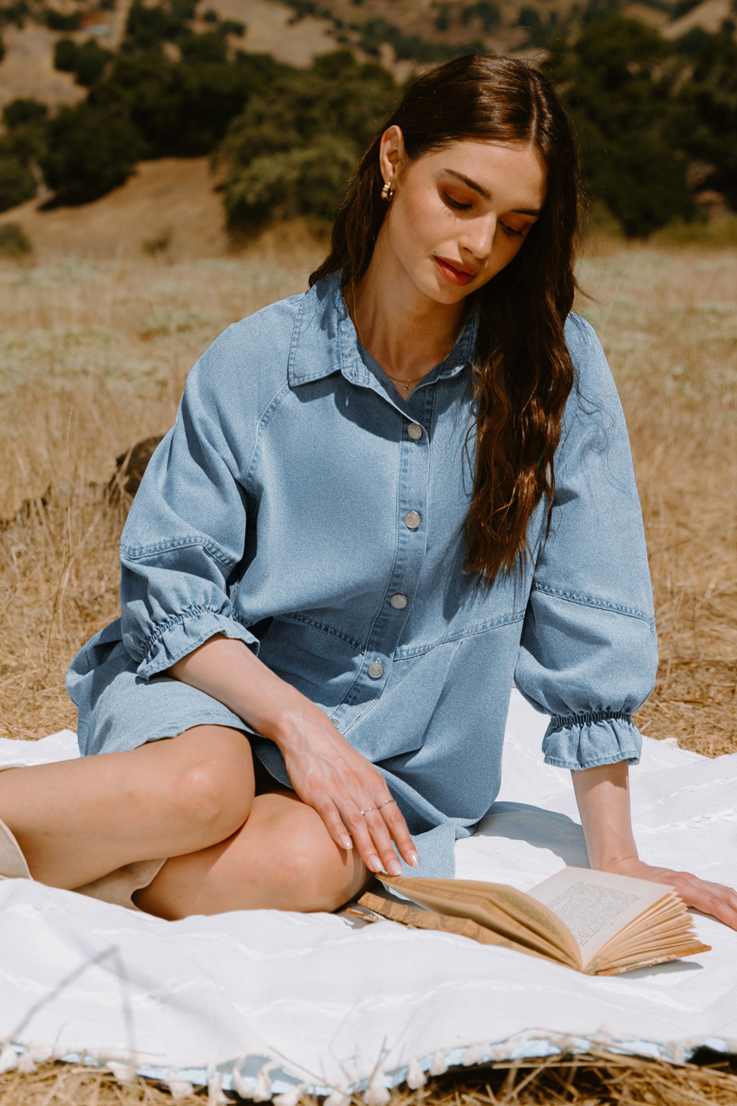Vestido camisero corto con botones y cuello de mezclilla azul claro