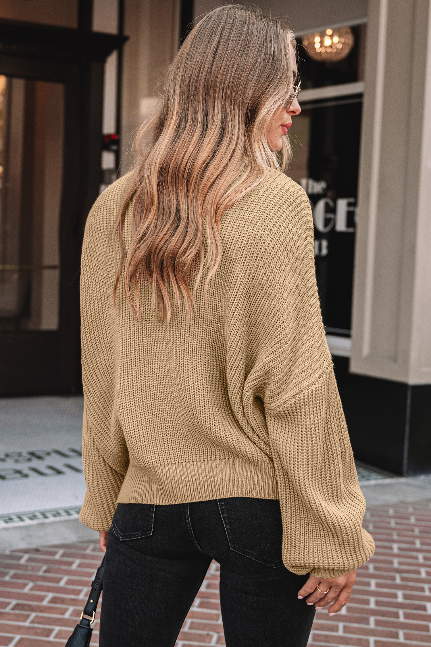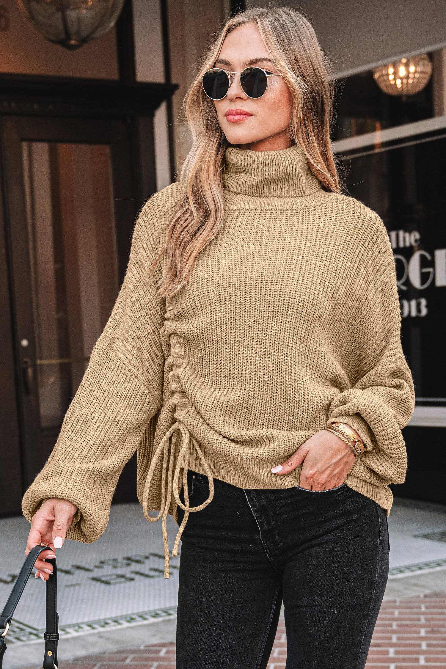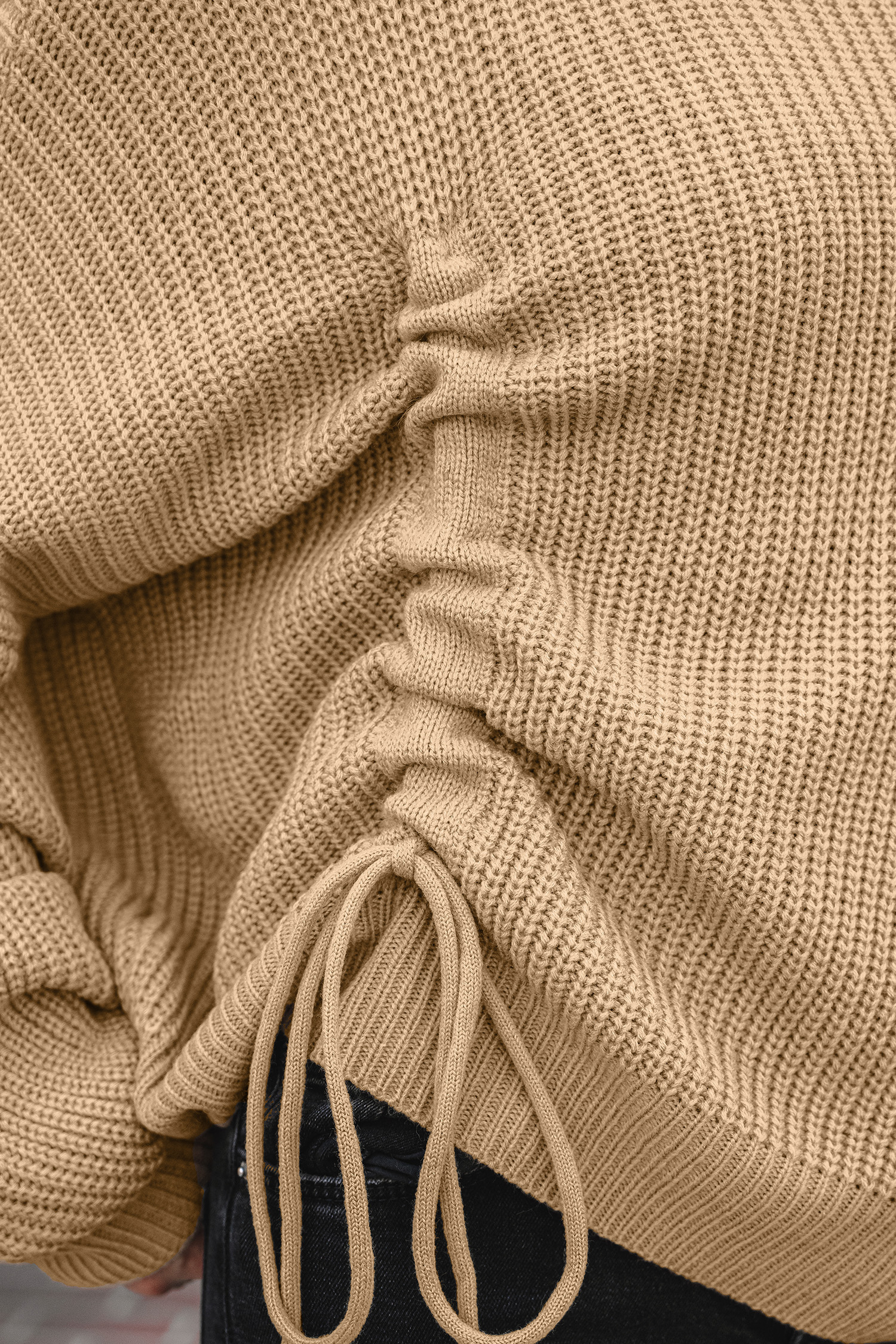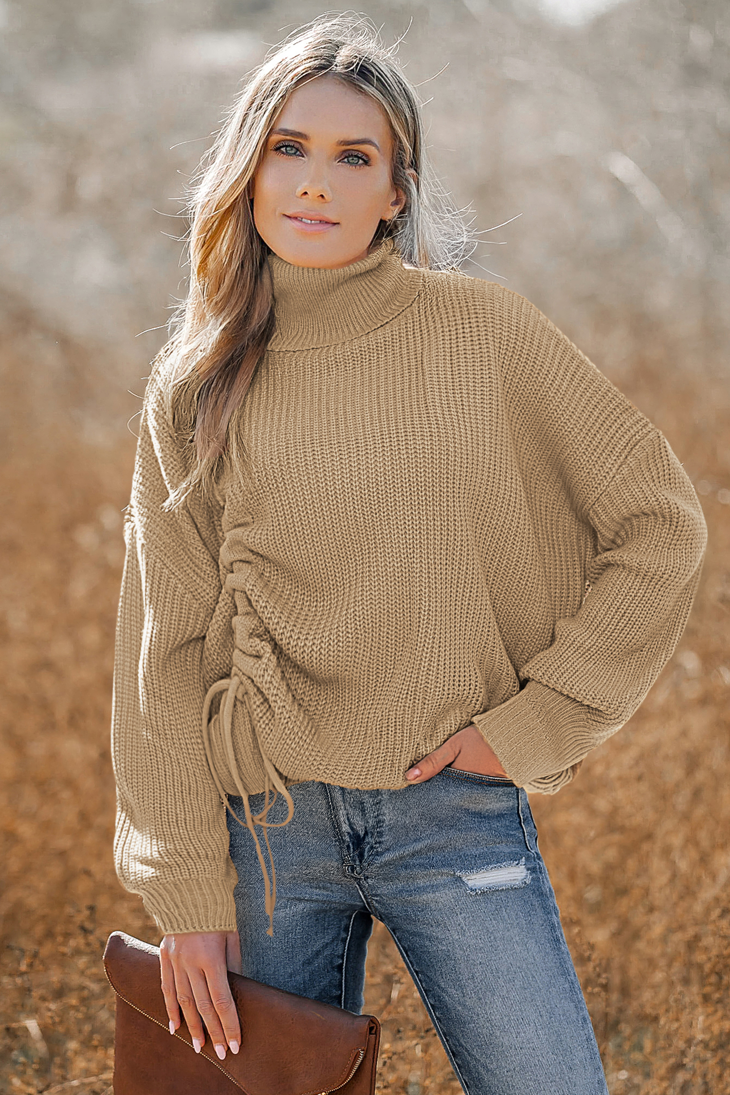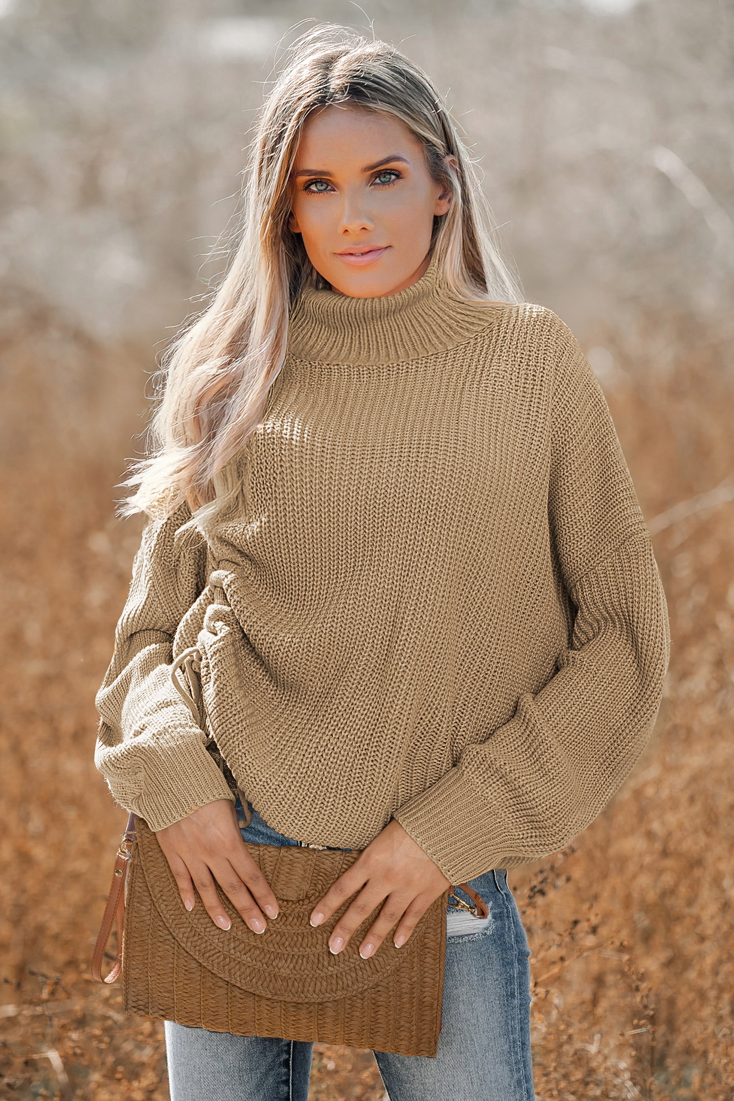 Suéter de cuello alto con hombros caídos en color marrón claro