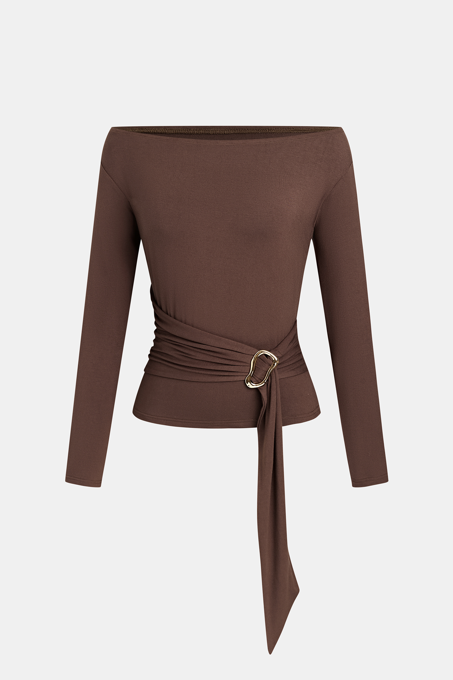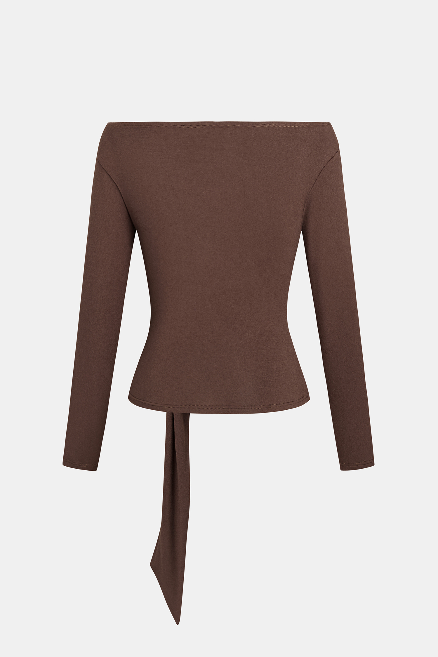 El top marrón Minimal Muse le da a cualquier look un toque de elegancia natural. Su escote con hombros descubiertos, mangas largas y un lazo en la cintura completan su silueta moderna.