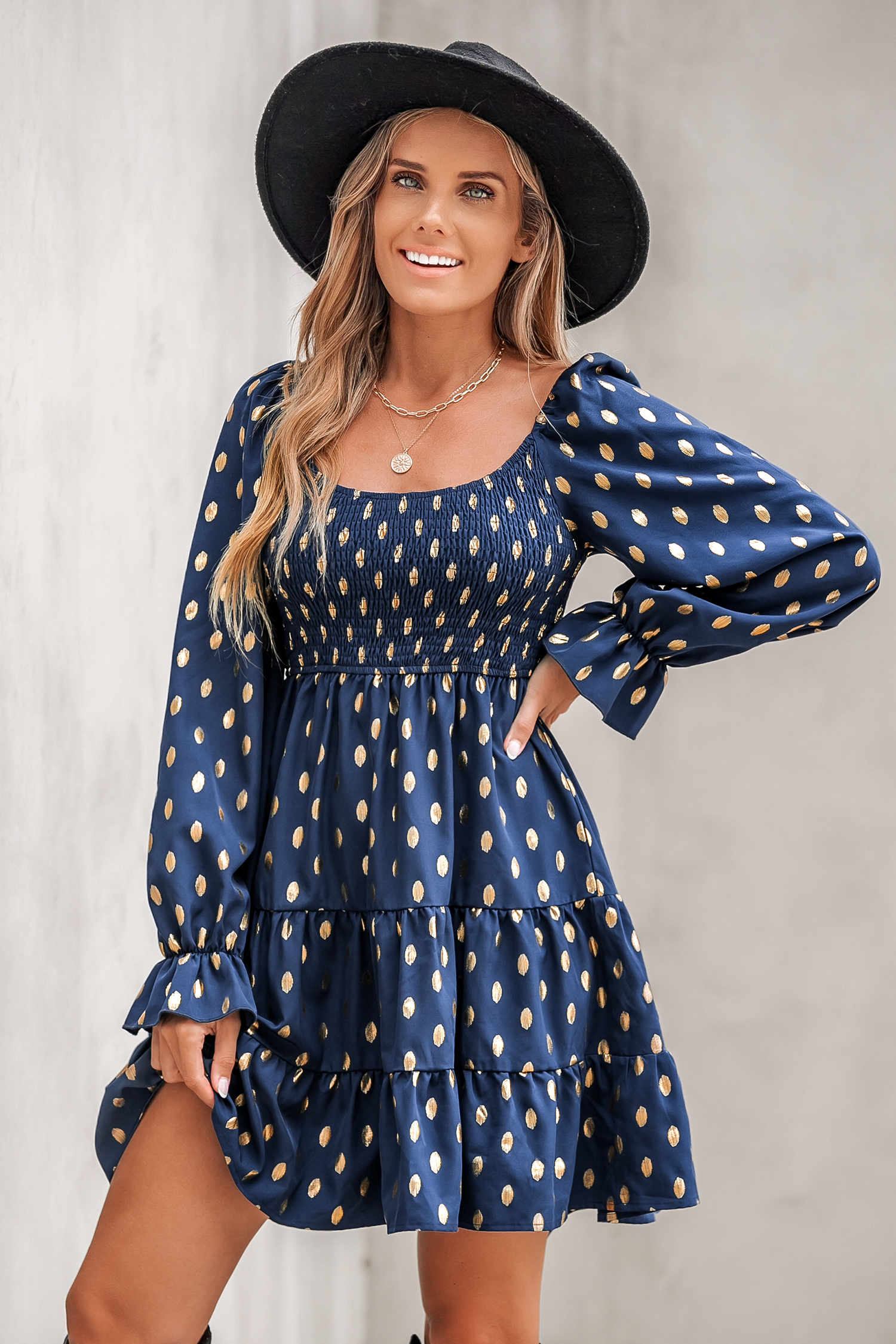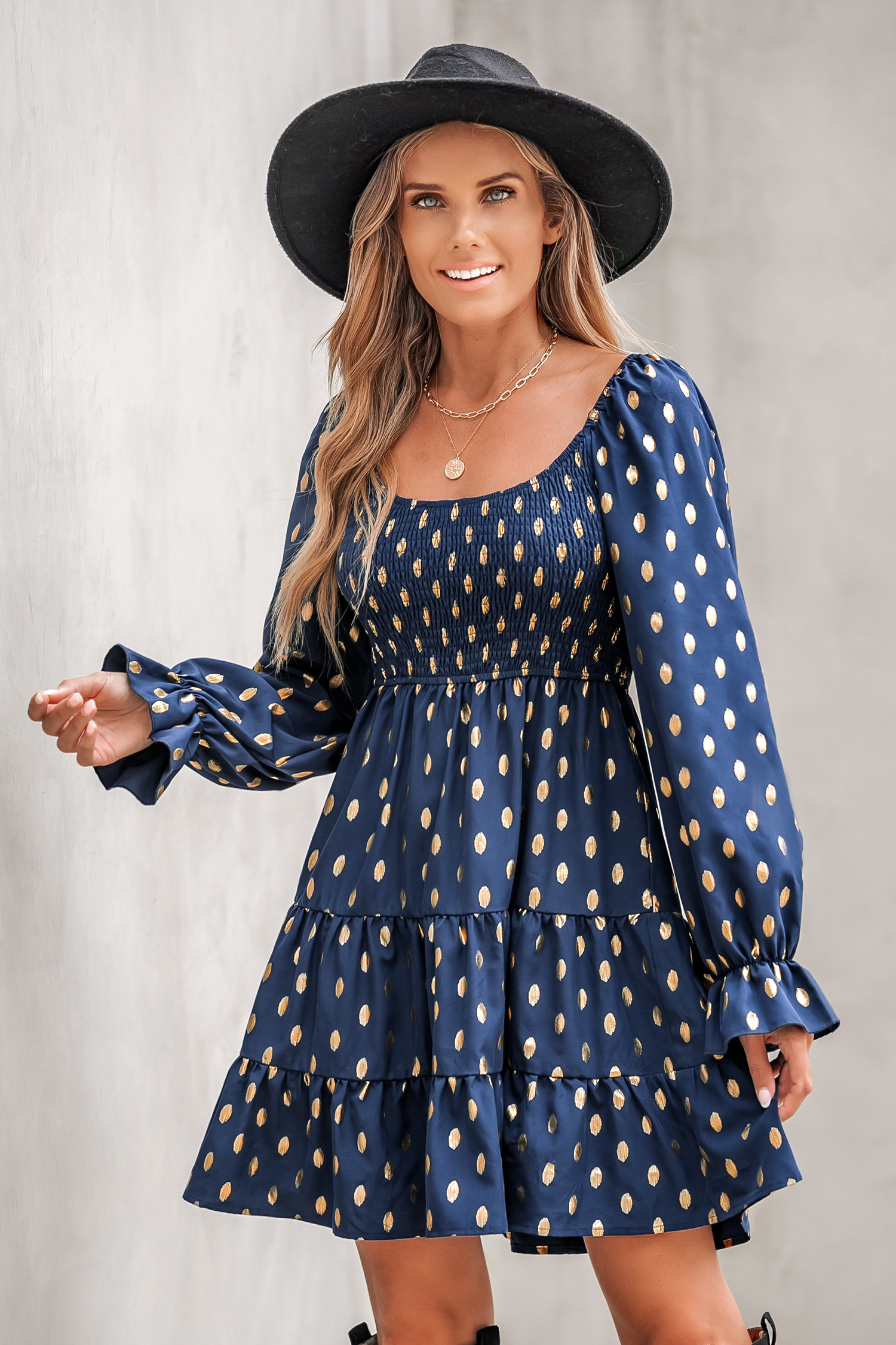 Minivestido fruncido con volantes y estampado geométrico