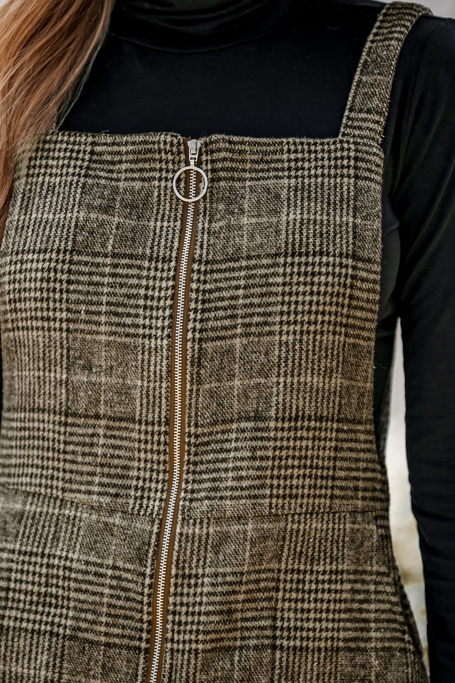 Agregue un toque de encanto con nuestro mini vestido tipo delantal con cremallera y anilla en forma de cuadros escoceses. El patrón clásico de cuadros escoceses y el elegante detalle de cremallera con junta tórica se unen sin esfuerzo para crear un vestido que es tan versátil como elegante, lo que lo convierte en un elemento esencial de vestuario.