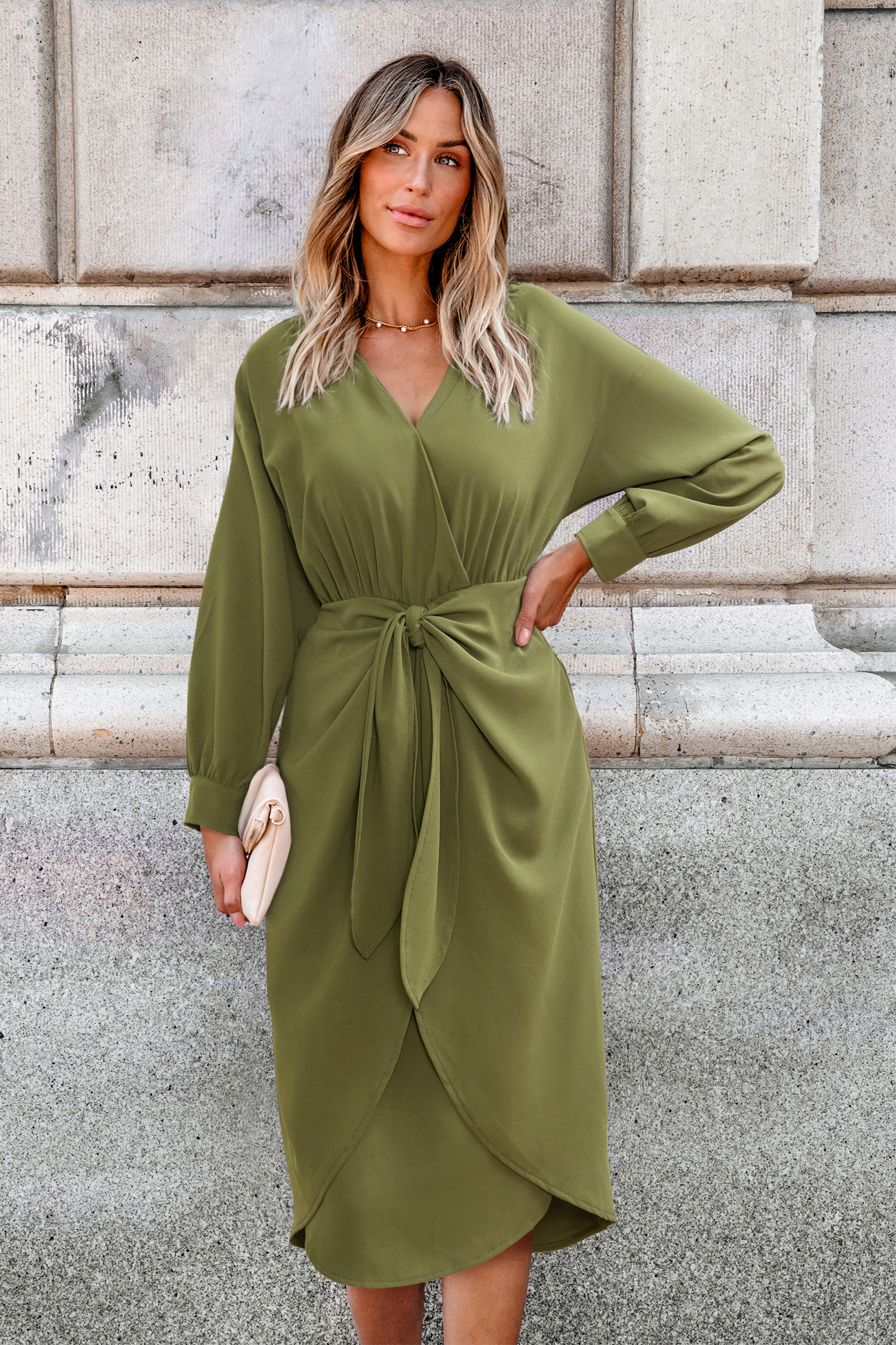 El vestido midi verde Odessa te da un look elegante y seguro. Su escote con cuello, mangas largas y lazo en la cintura le dan a este vestido midi un look elegante, divertido y listo para todo.