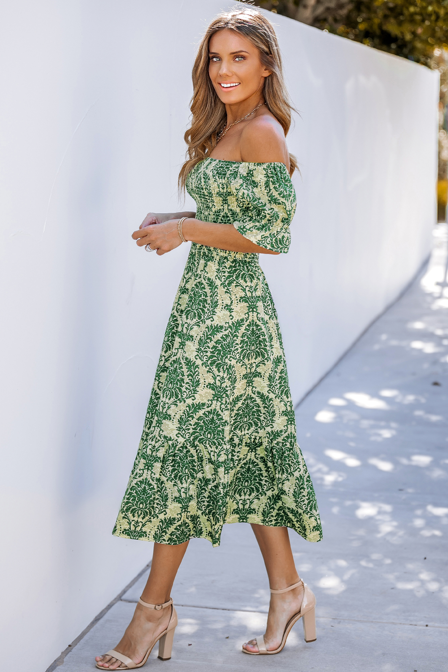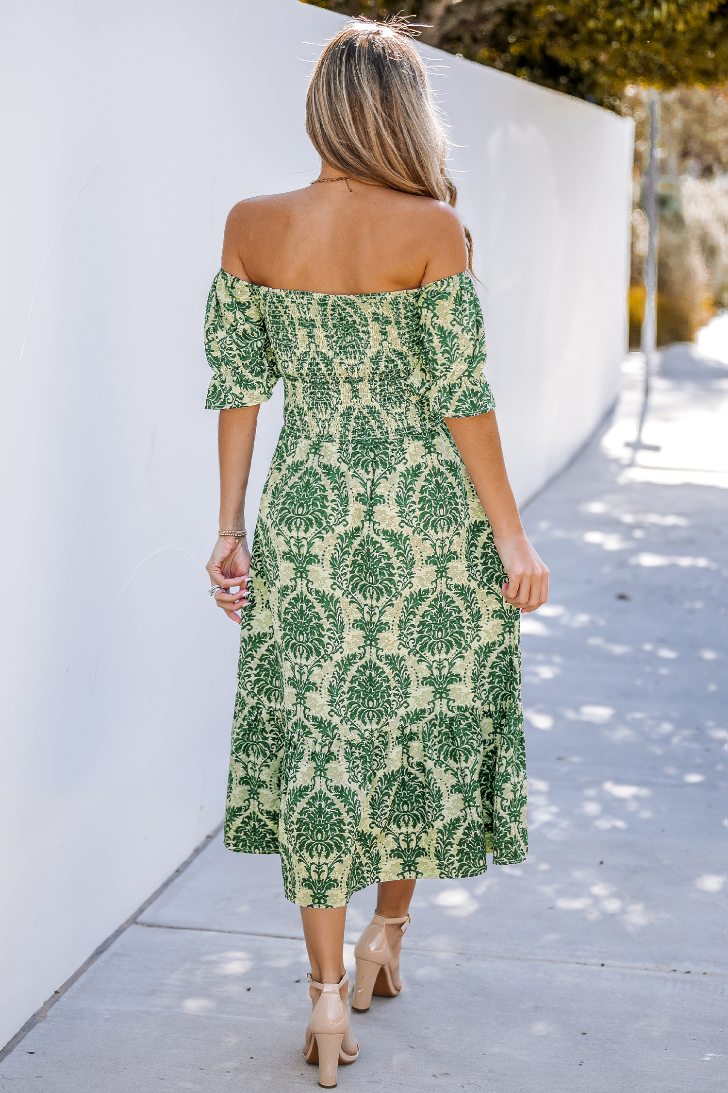 Vestido midi fruncido con hombros descubiertos