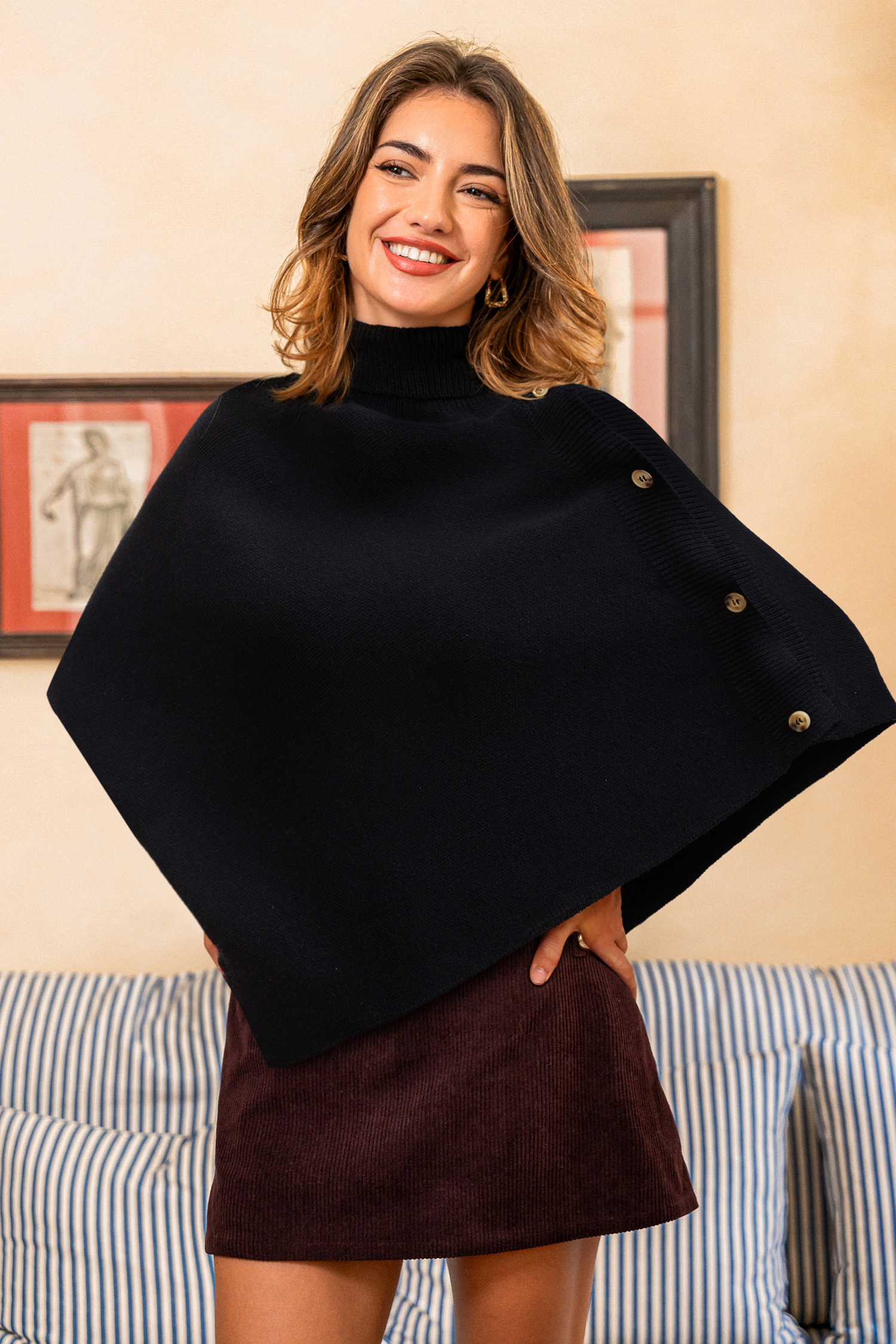 El suéter poncho negro Off the Grid es tu prenda ideal para un estilo acogedor y divertido. El cuello alto te mantiene abrigada, mientras que el dobladillo estilo pañuelo le da un toque fluido y encantador.
