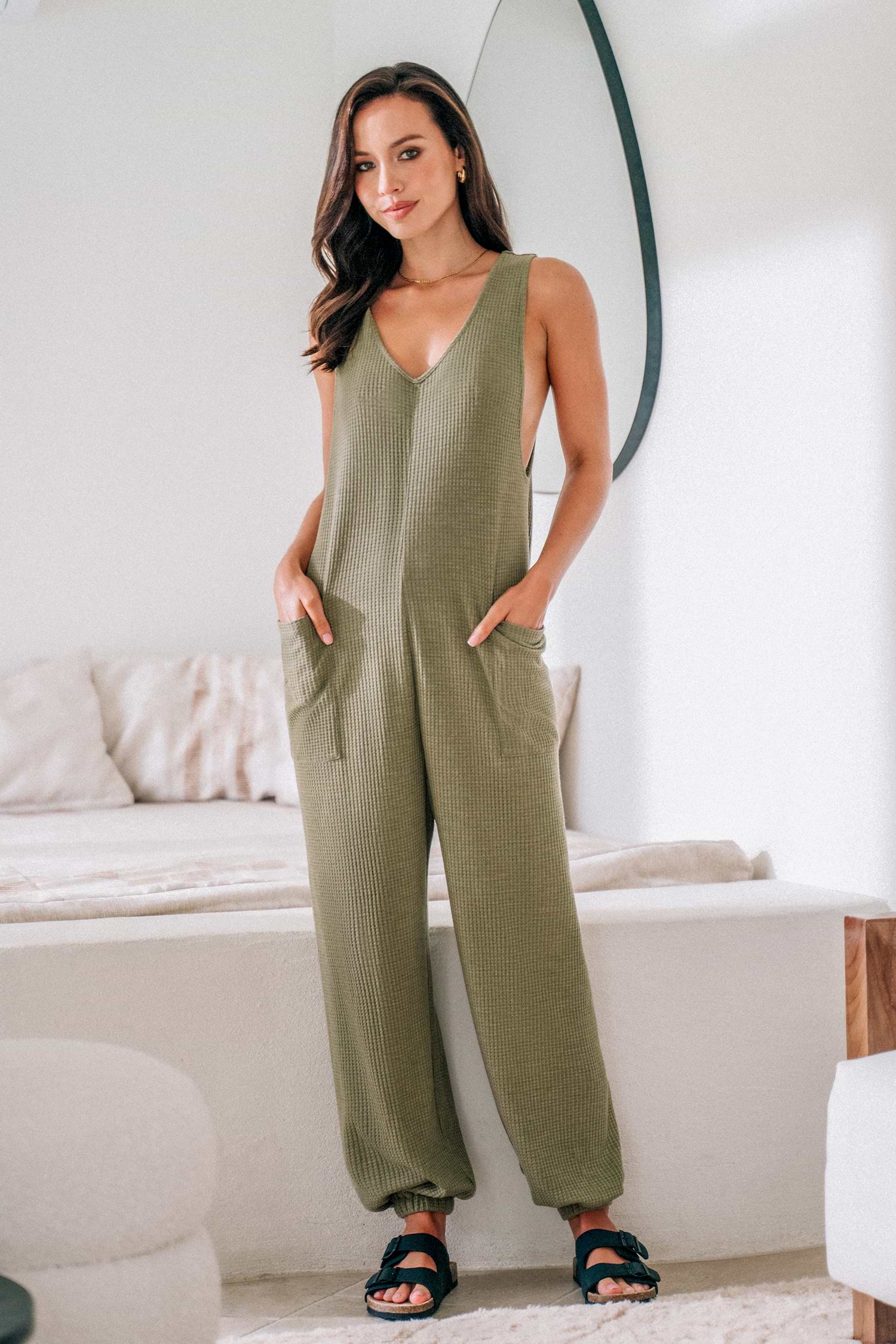 Mono con bolsillo de parche sin mangas de punto tipo gofre verde oliva