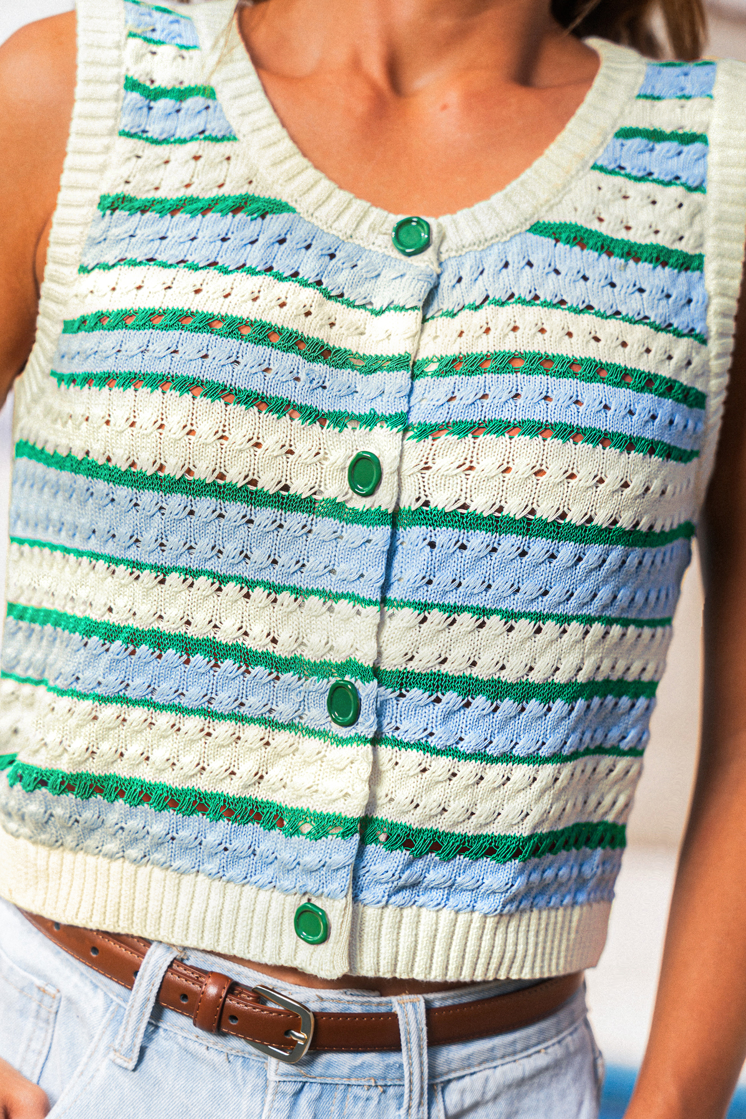 El chaleco de rayas One More Thing le da el toque perfecto de diversión a tu look. Con cuello redondo, corte cropped y sin mangas, es la prenda que lo completa todo.