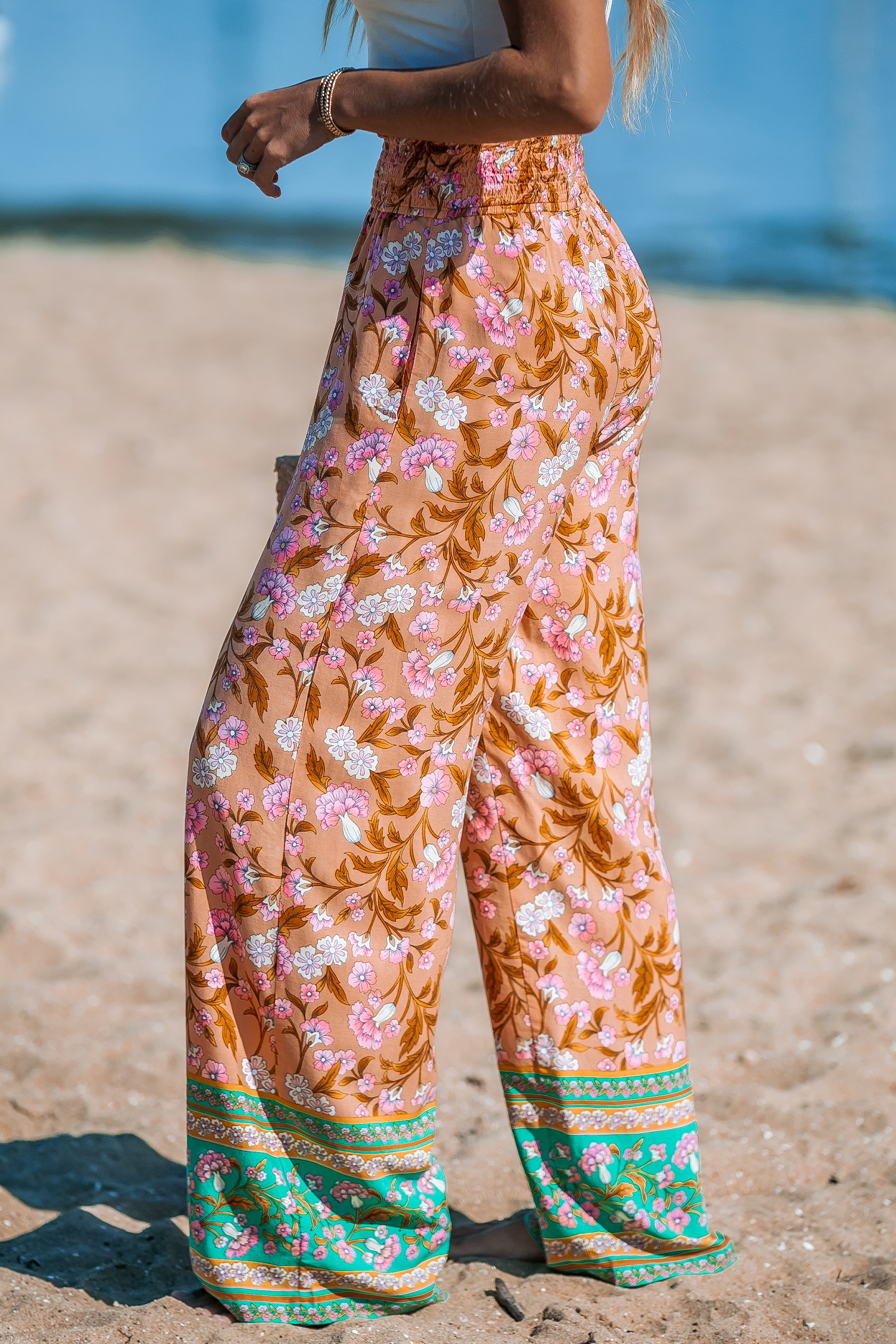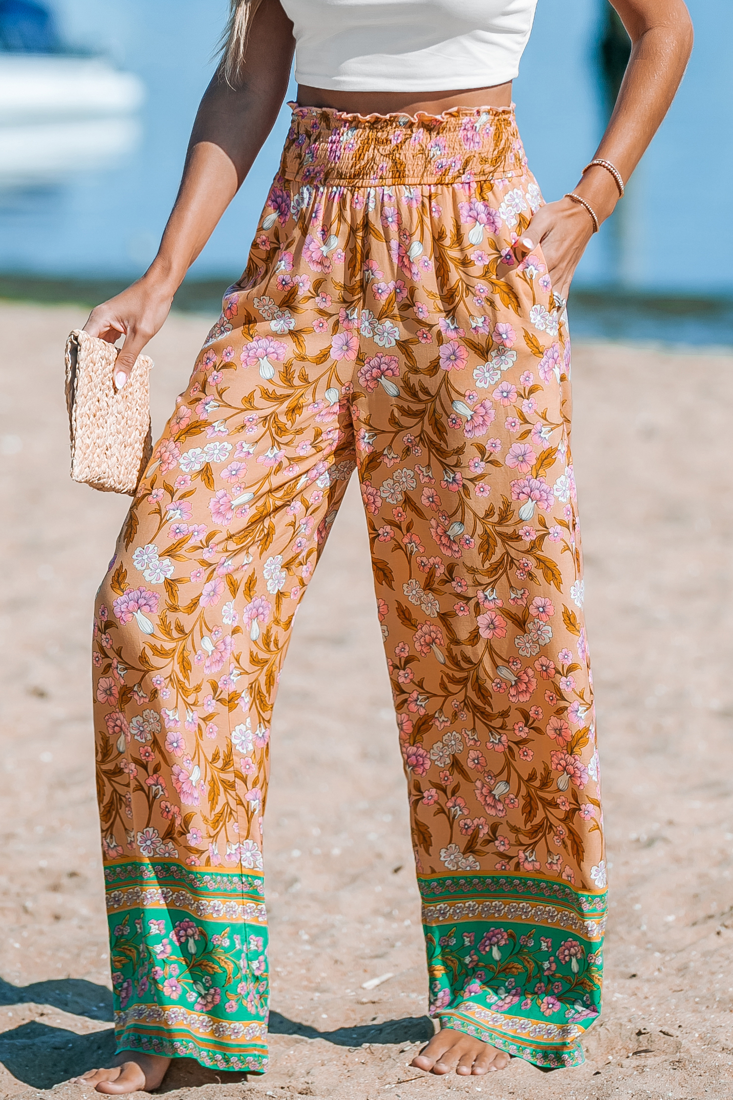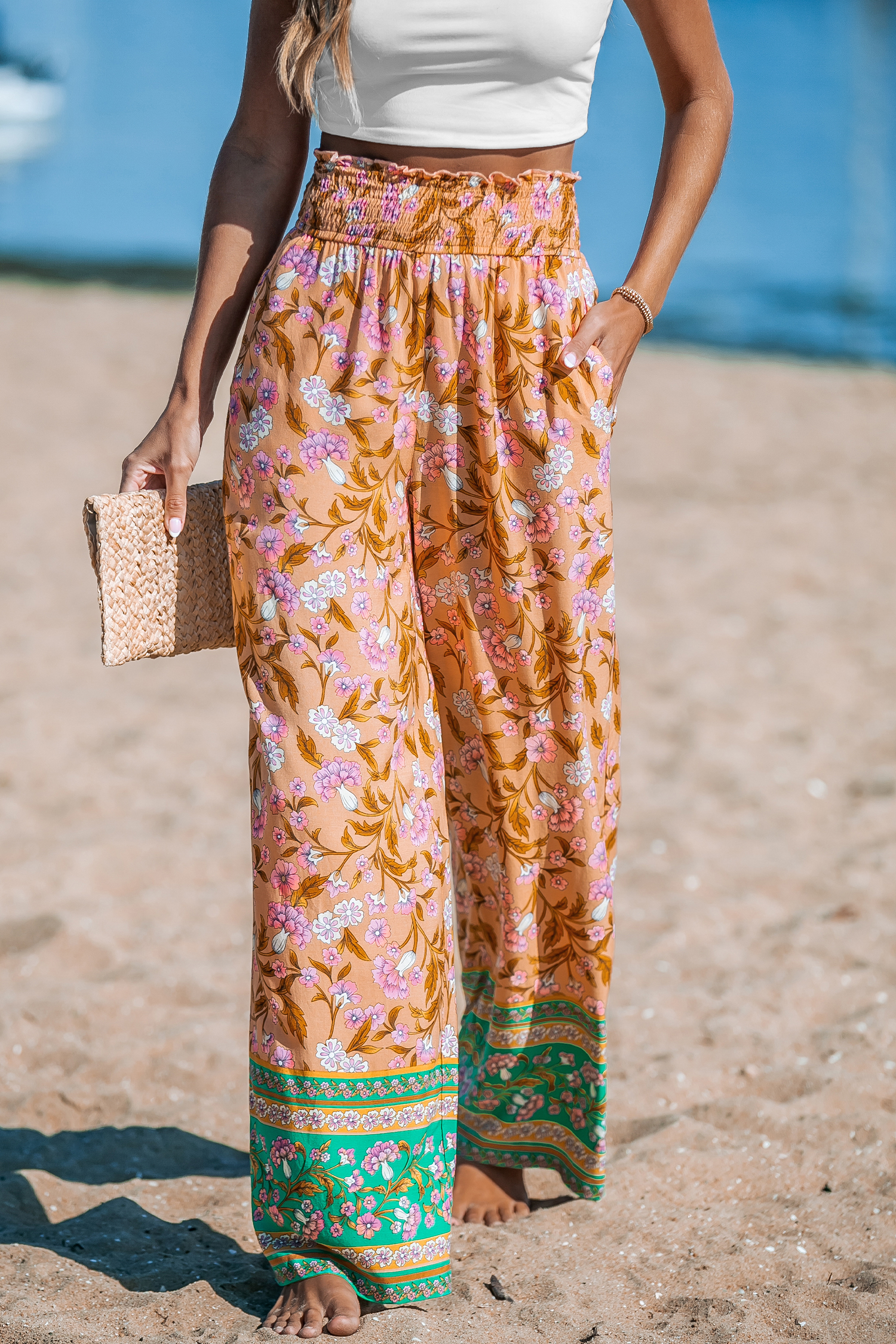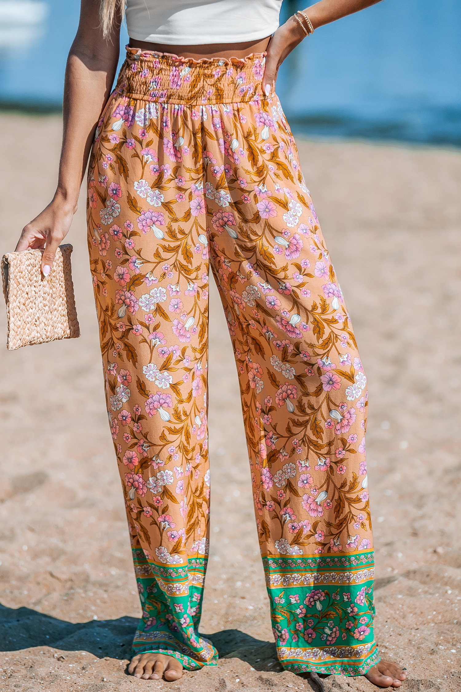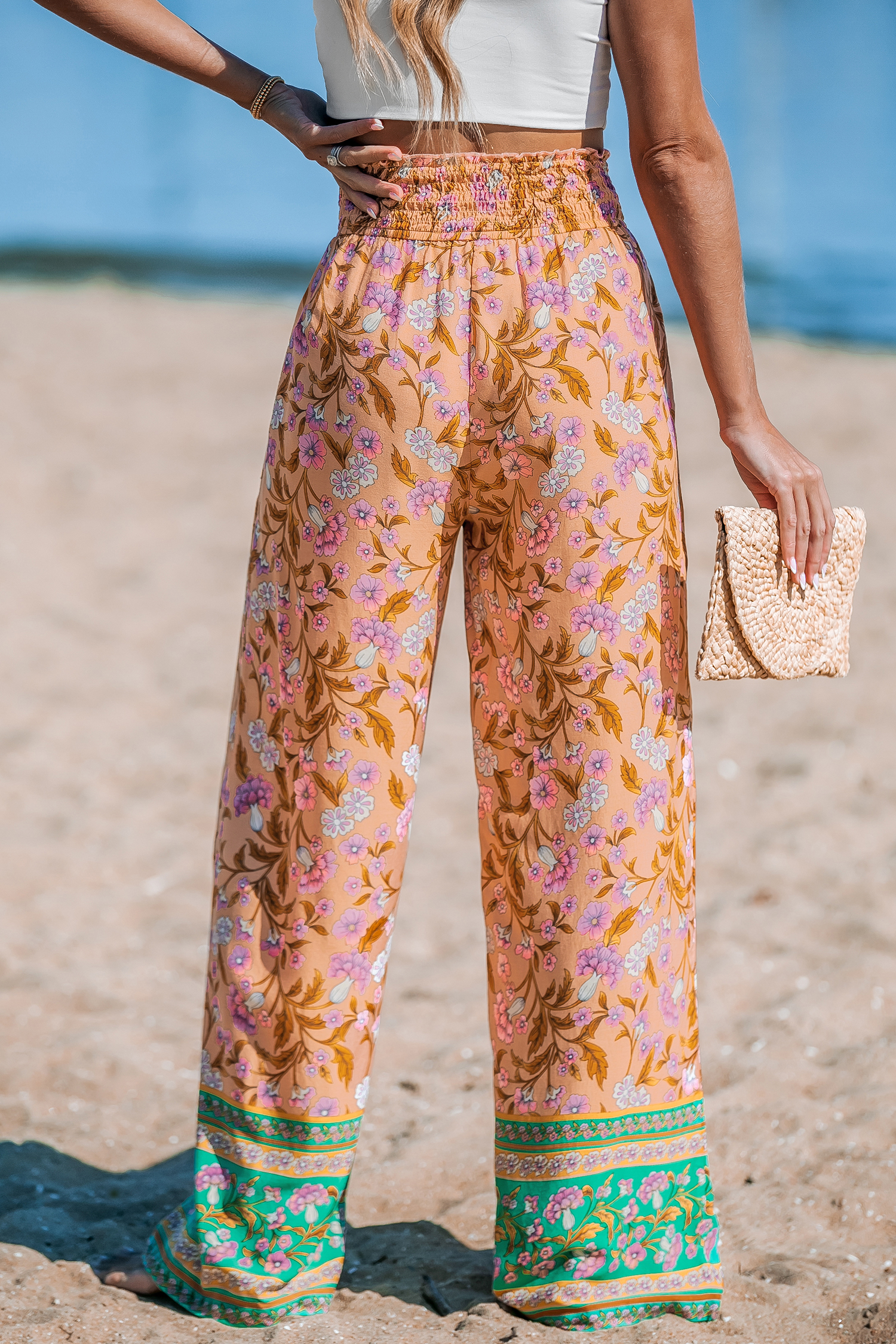 Pantalones rectos con cintura fruncida y estampado floral naranja