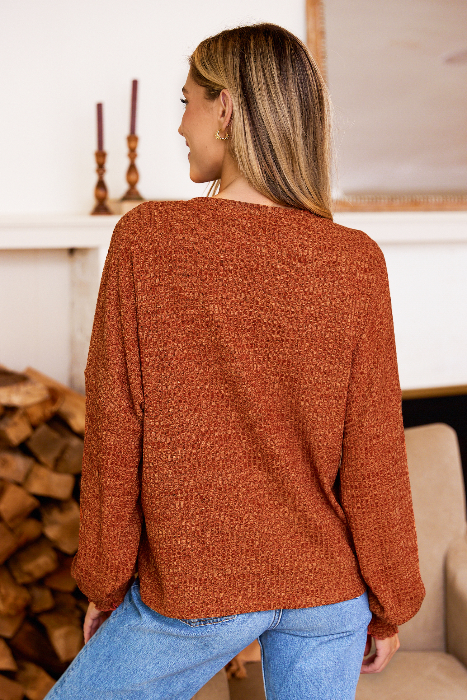 Suéter naranja de cuello redondo manga larga y puños con volantes