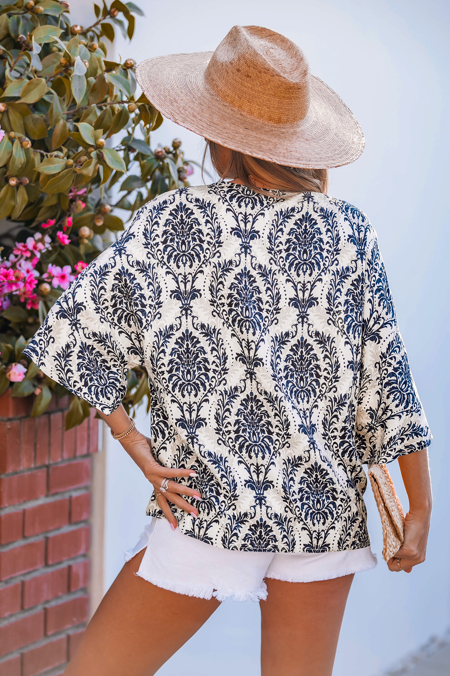 Realza tu estilo playero con la blusa playera con escote en V adornado. Con escote en V y media manga, esta blusa le aporta un toque de elegancia a tu look de verano.