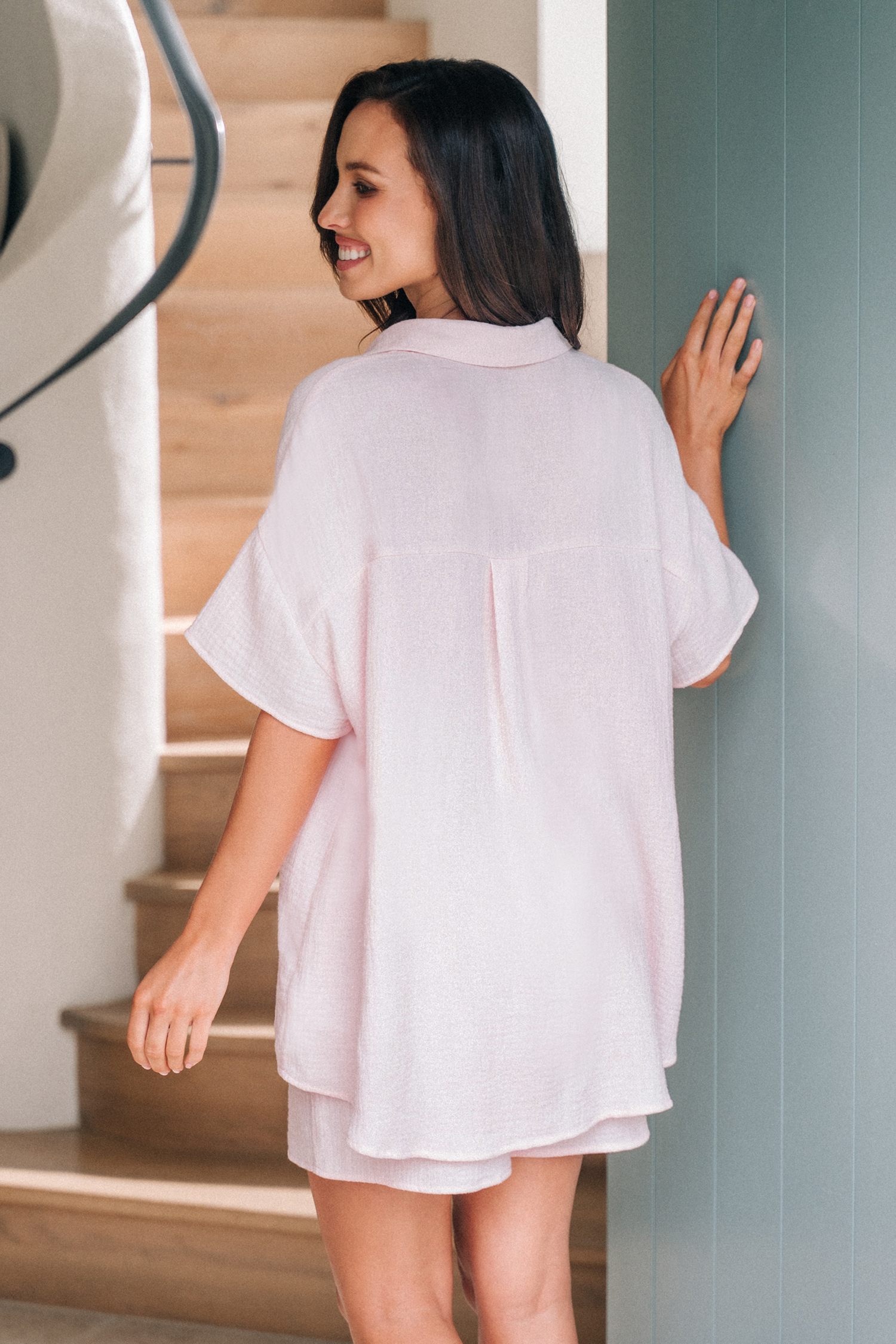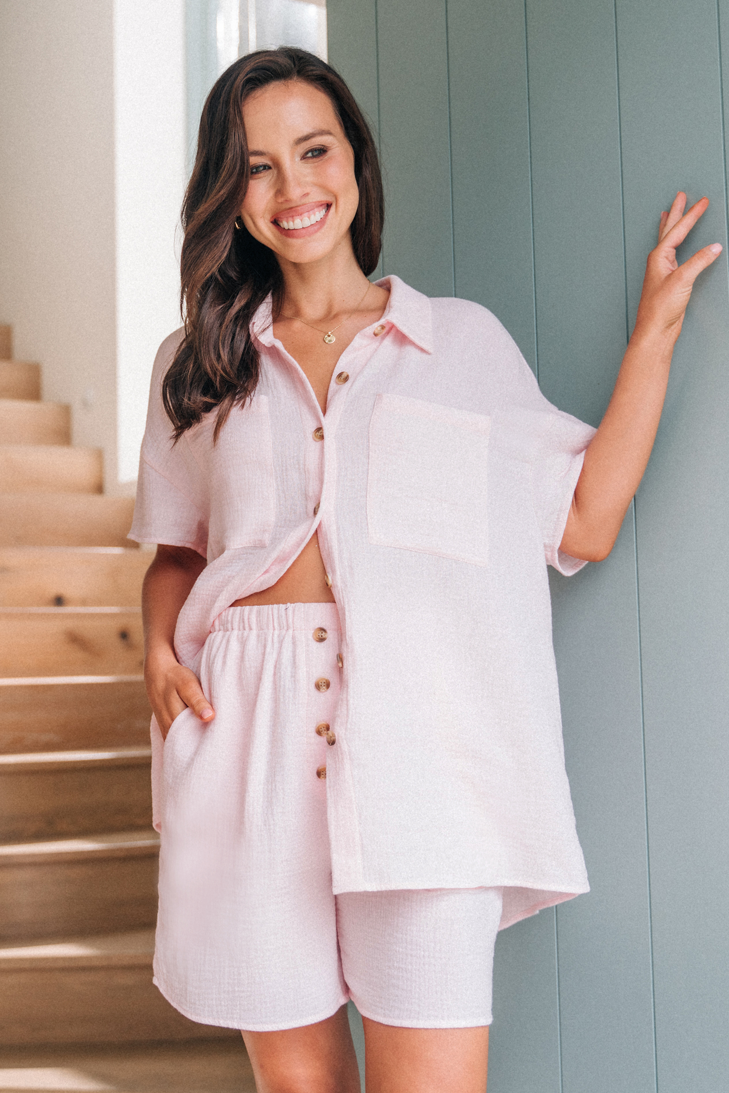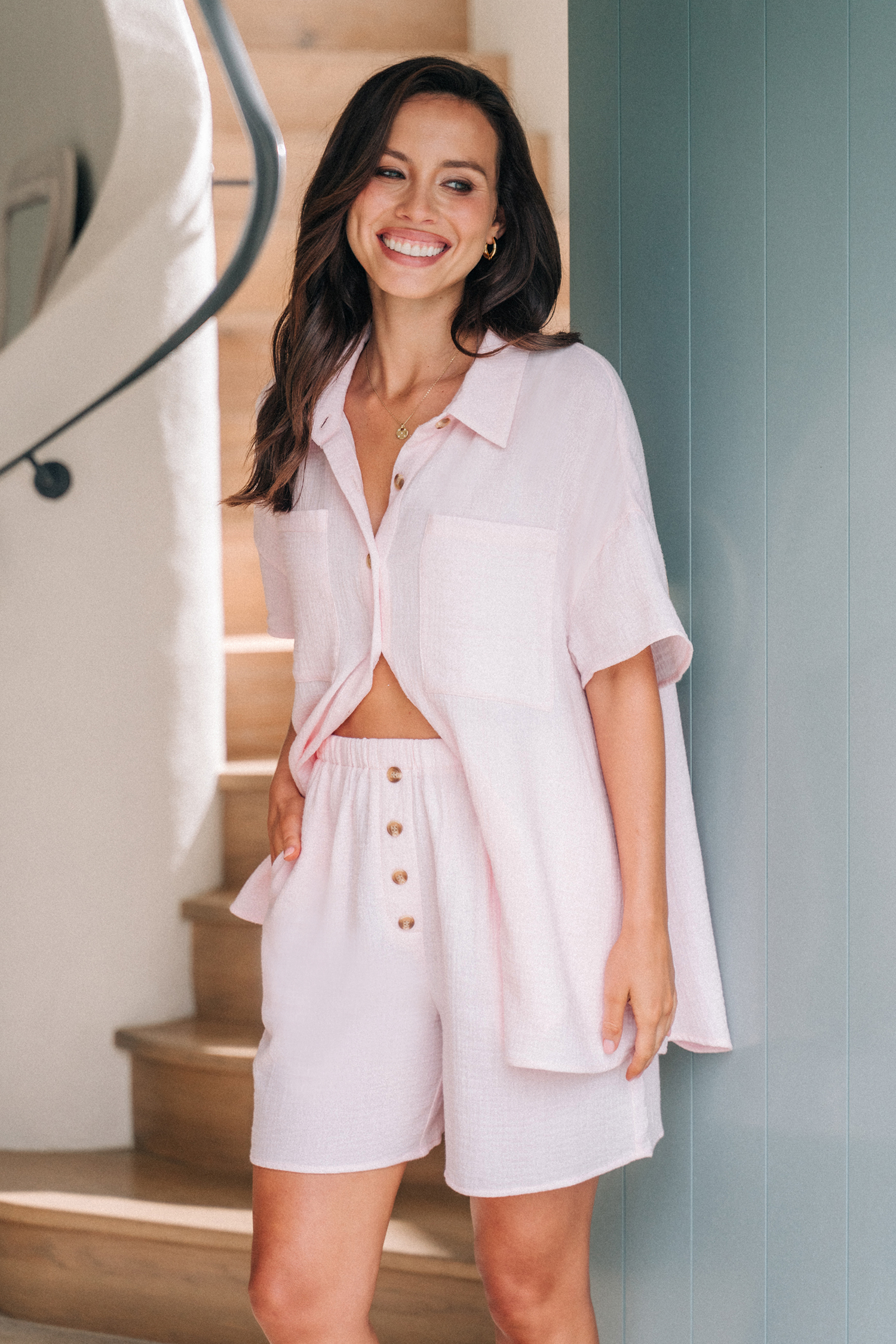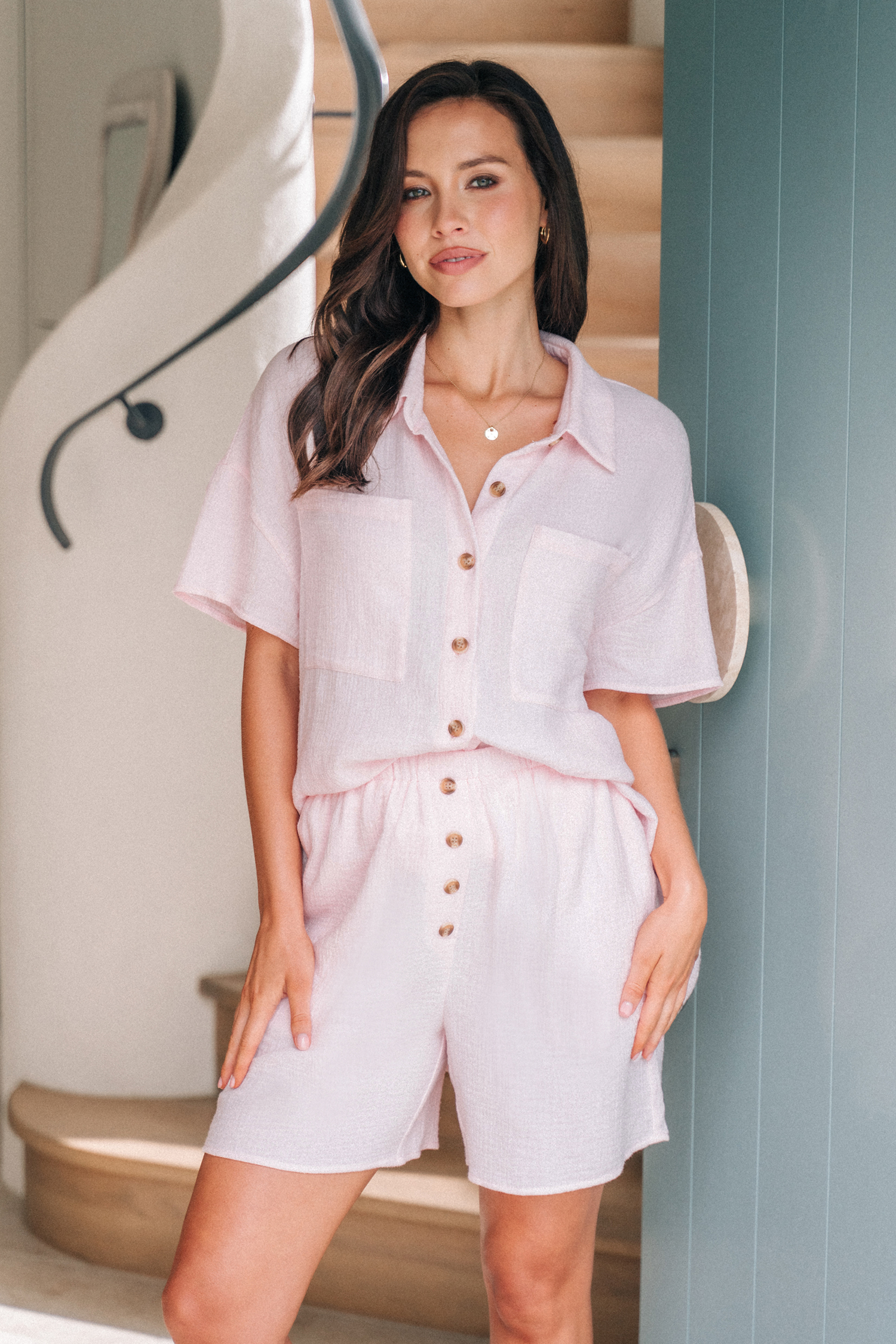 Conjunto de camisa con botones y pantalones cortos en rosa