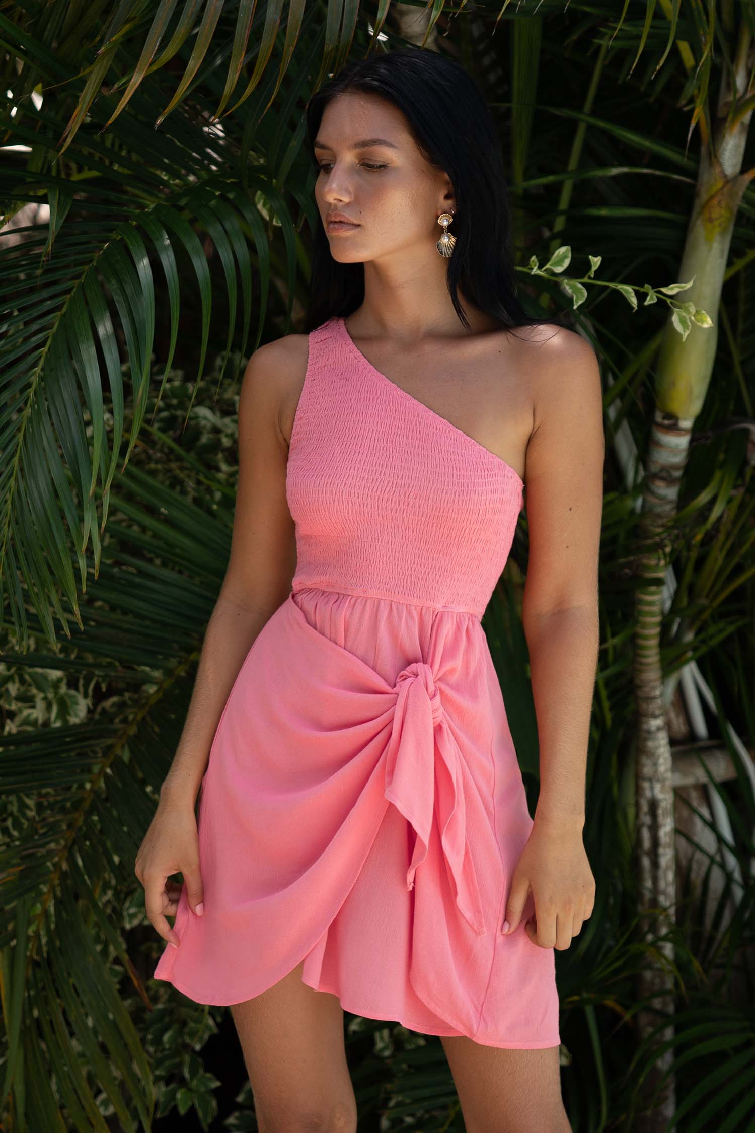 Minivestido rosa con corpiño fruncido y un solo hombro