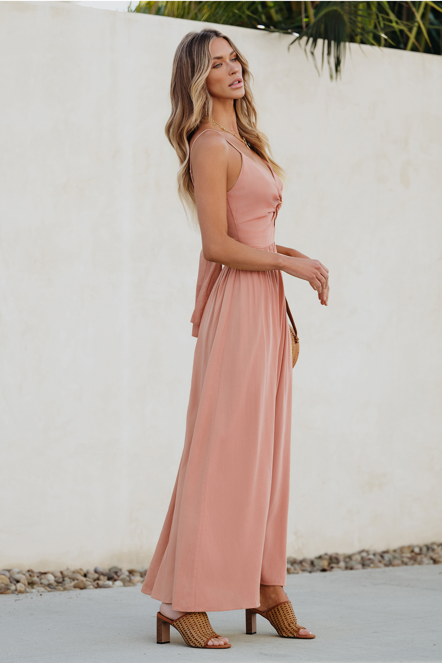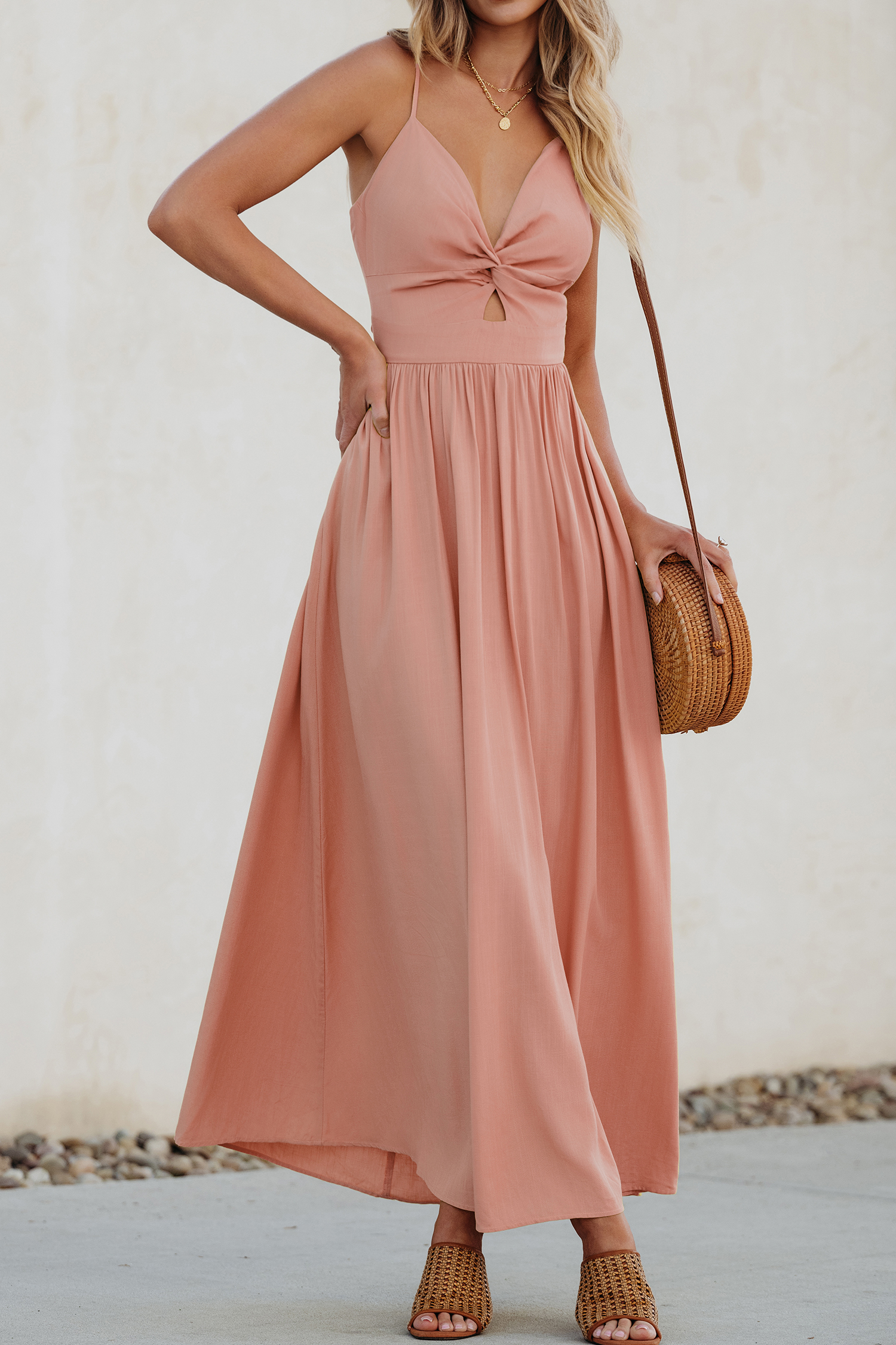 Vestido largo rosa con escote en forma de corazón y abertura en la parte delantera
