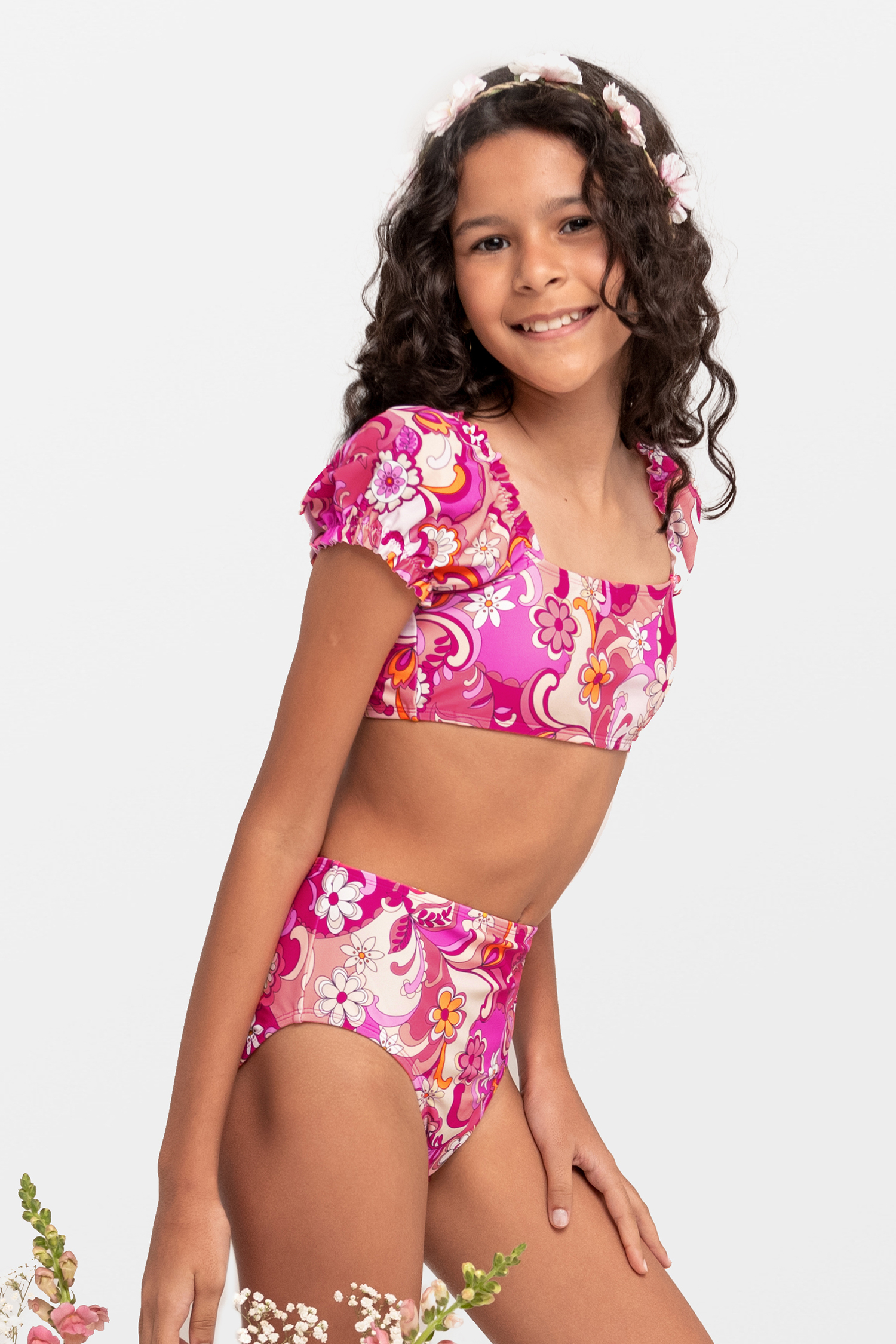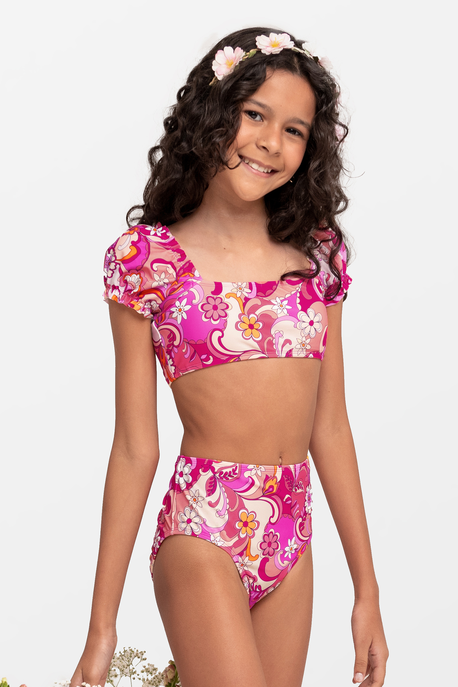 Conjunto de dos piezas con mangas abullonadas y flores psicodélicas para niñas