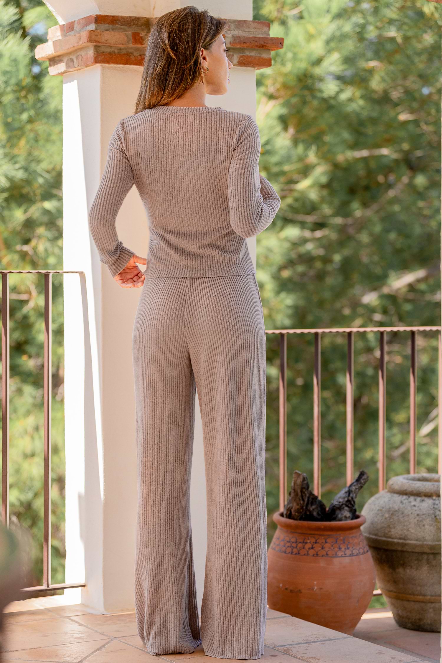 El conjunto de pijama caqui Quiet Glow te permite relajarte con elegancia. Confeccionado en tejido de punto suave, con cuello redondo, mangas largas y botones, es tu prenda ideal para noches acogedoras en casa.