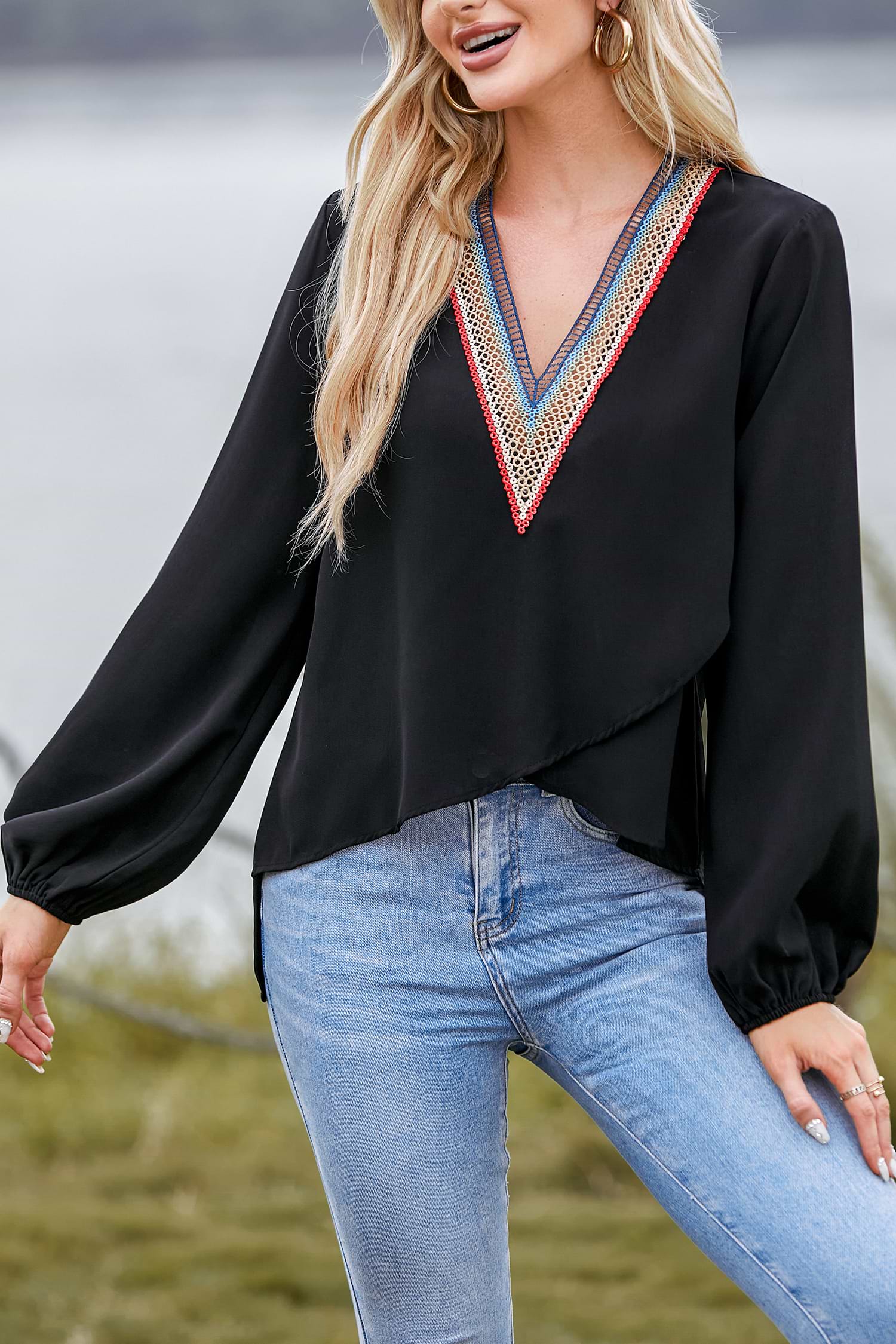 Top con cuello en V y ribete de encaje arcoíris
