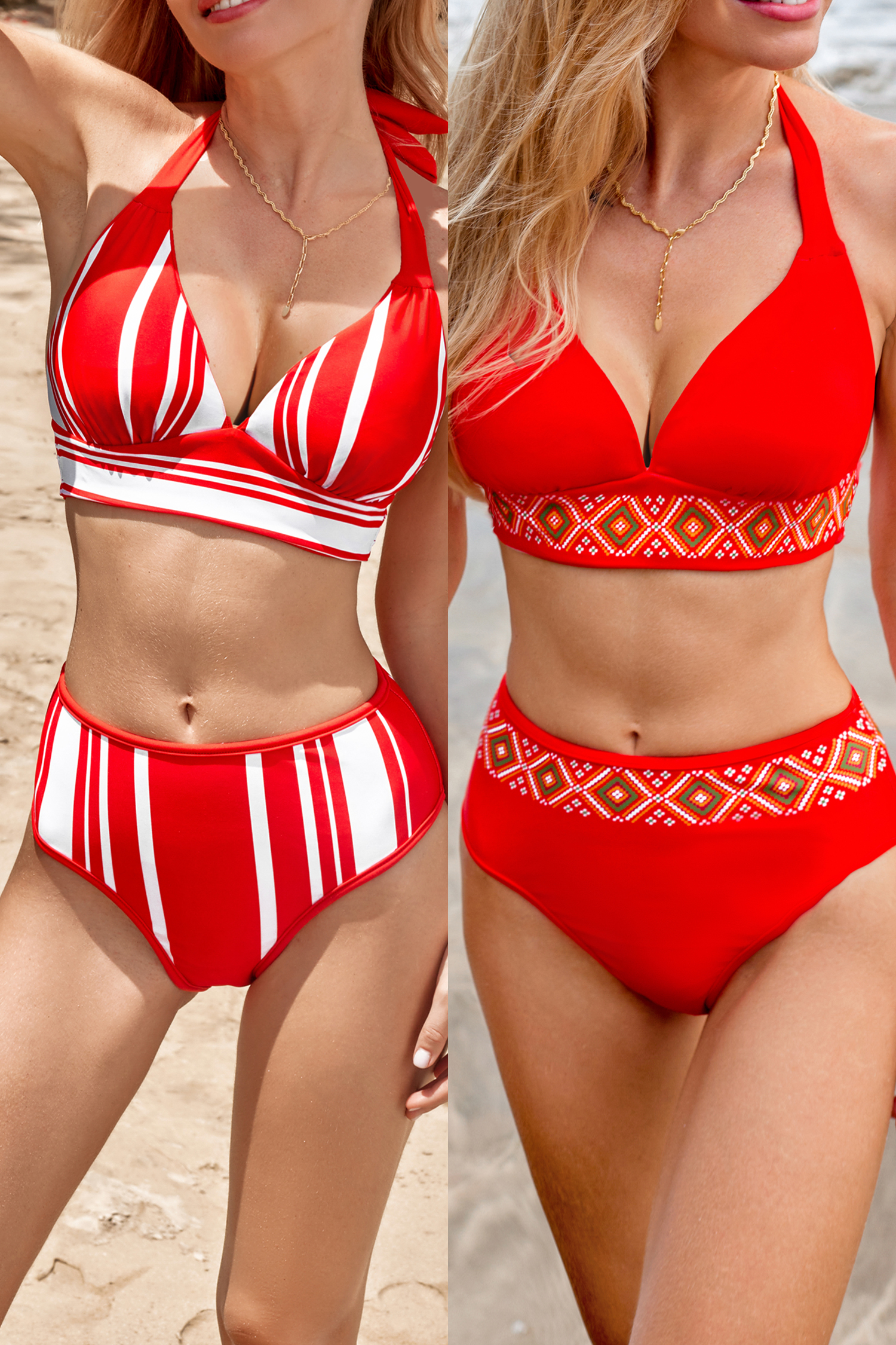 Conjunto de top de bikini con escote halter y braguitas atrevidas en rojo Geo