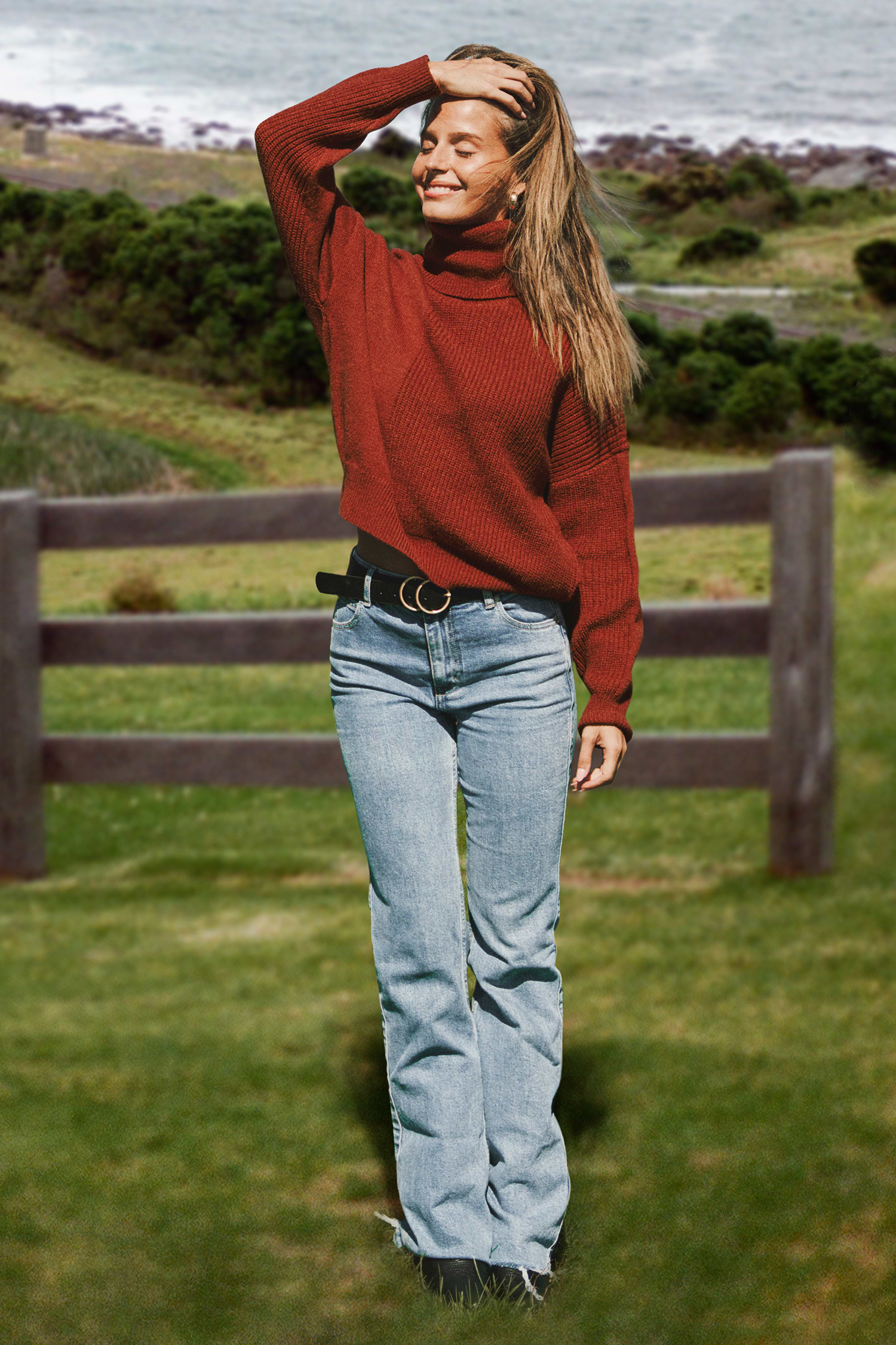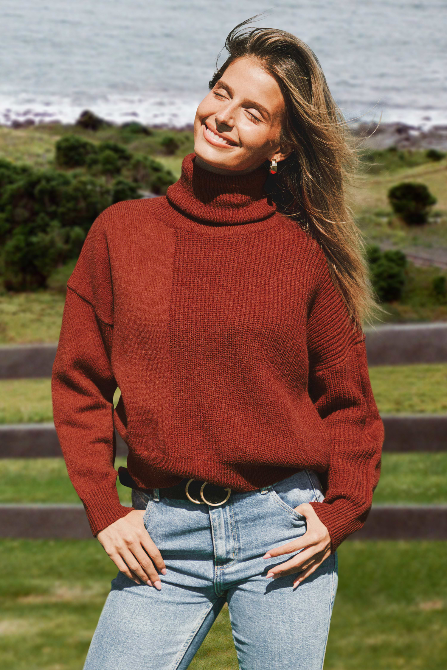 InicioSuéter rojo de cuello alto y manga larga