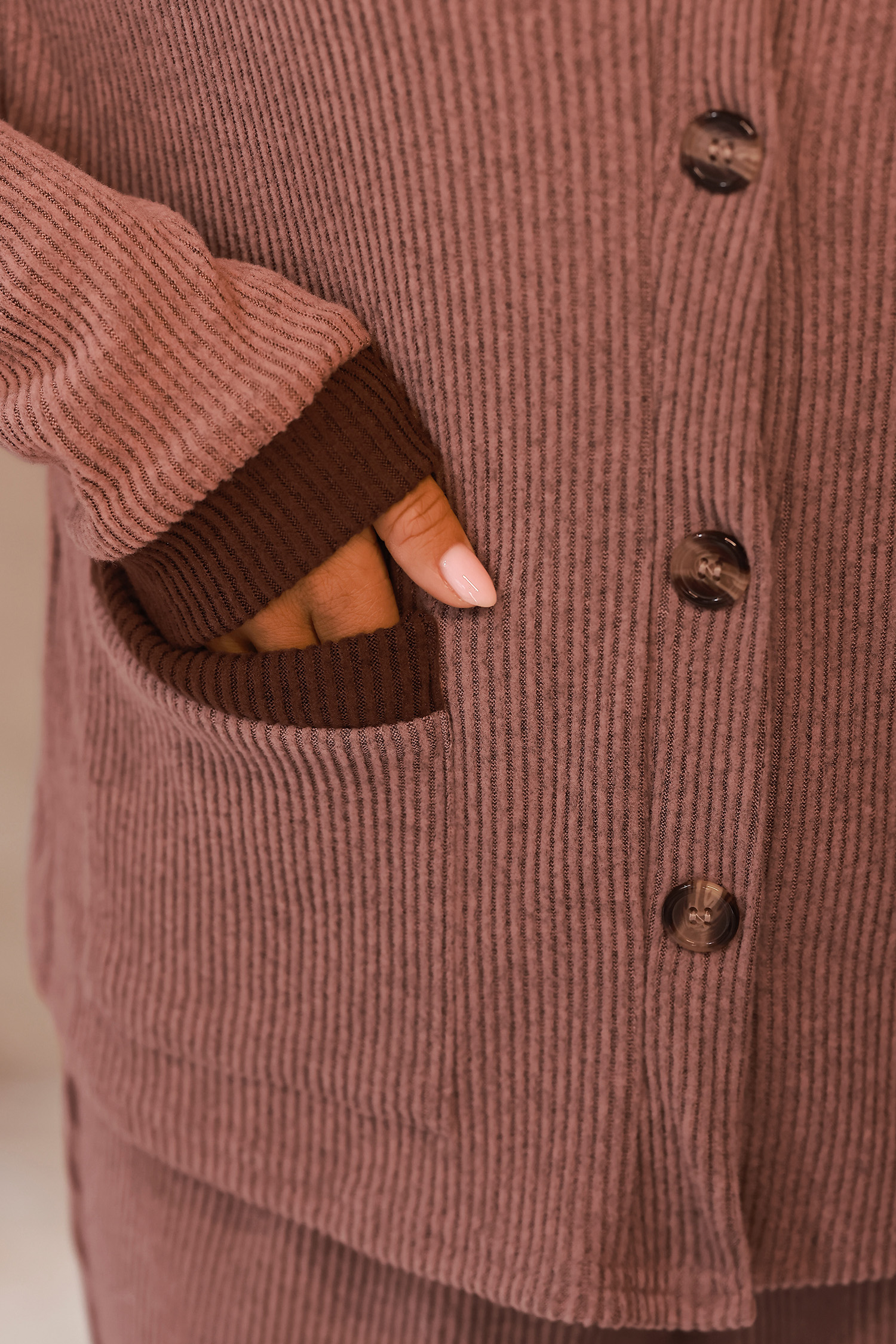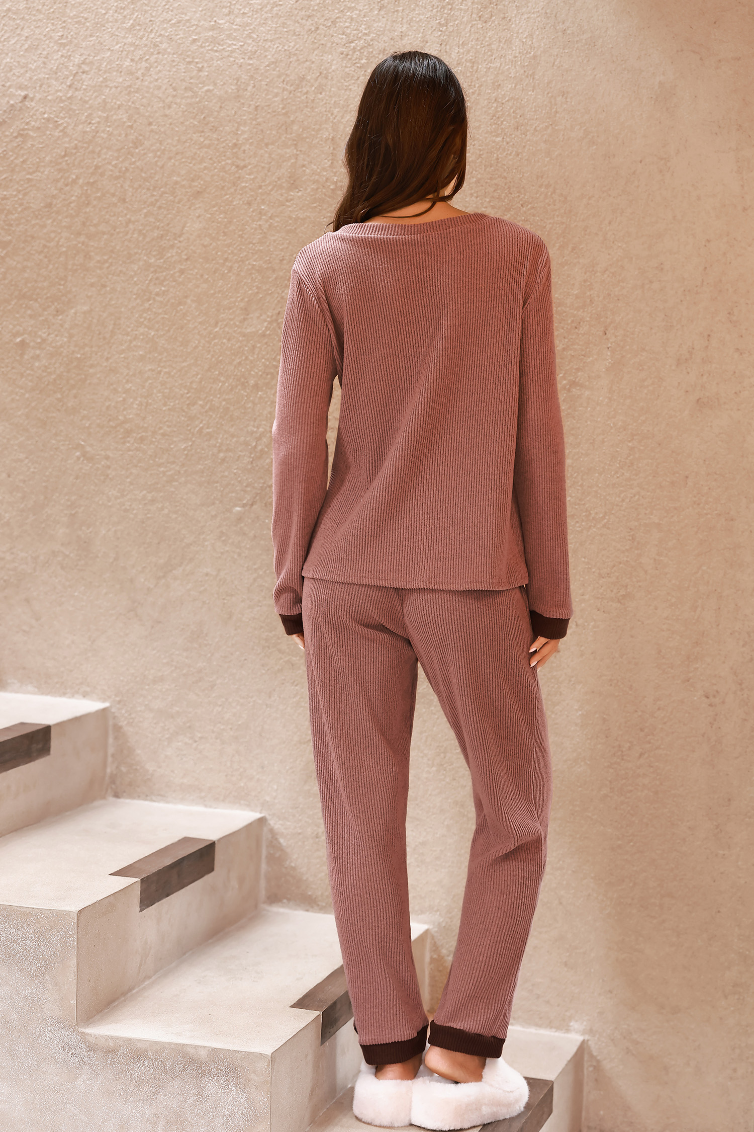 El conjunto de pijama con pantalón y blusa abotonada de canalé rojo es la combinación perfecta para una noche relajada y cómoda. No solo te relajas, sino que te ves bien.