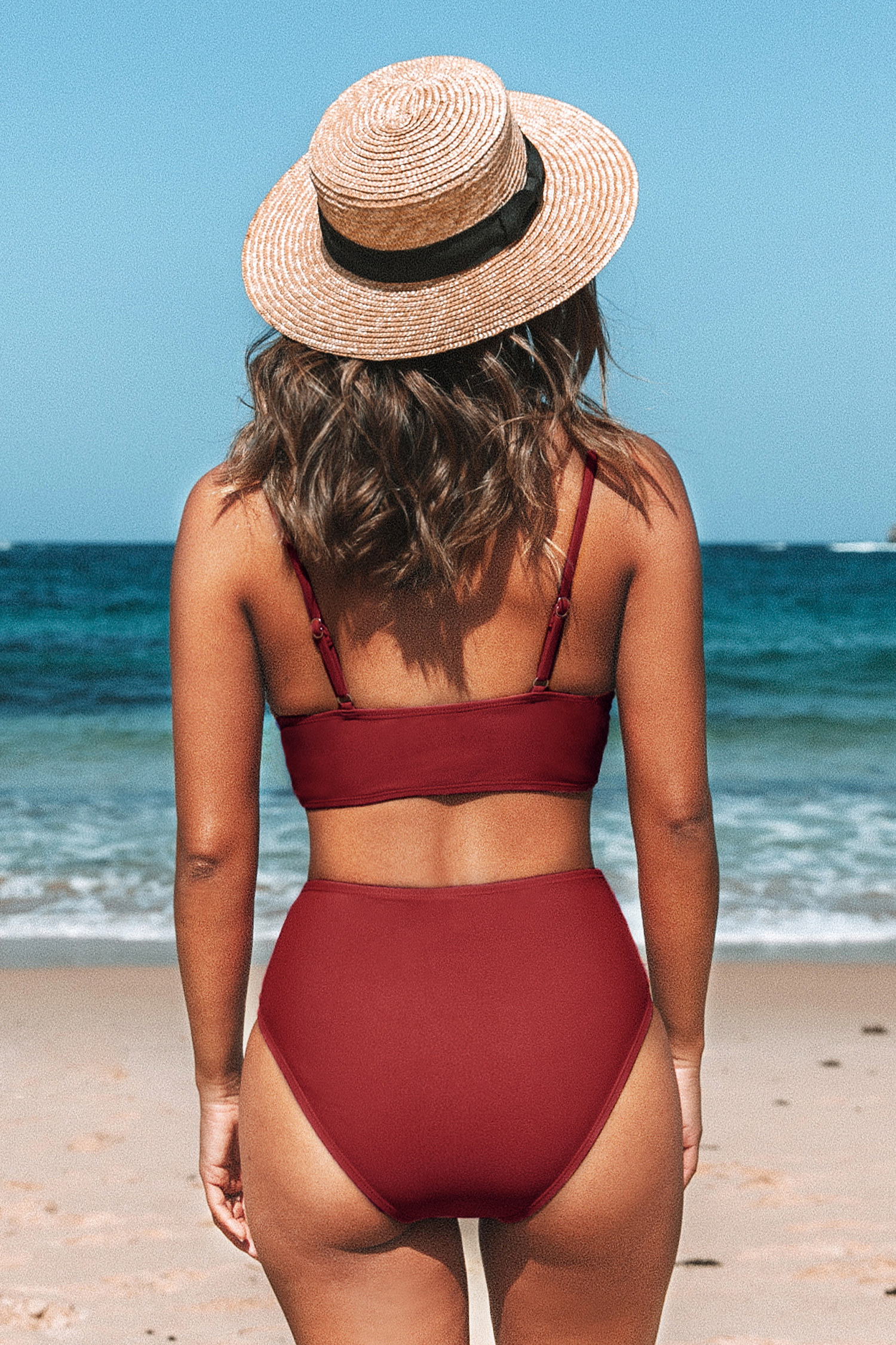 Conjunto de bikini rojo con parte superior retorcida y braguita de tiro alto