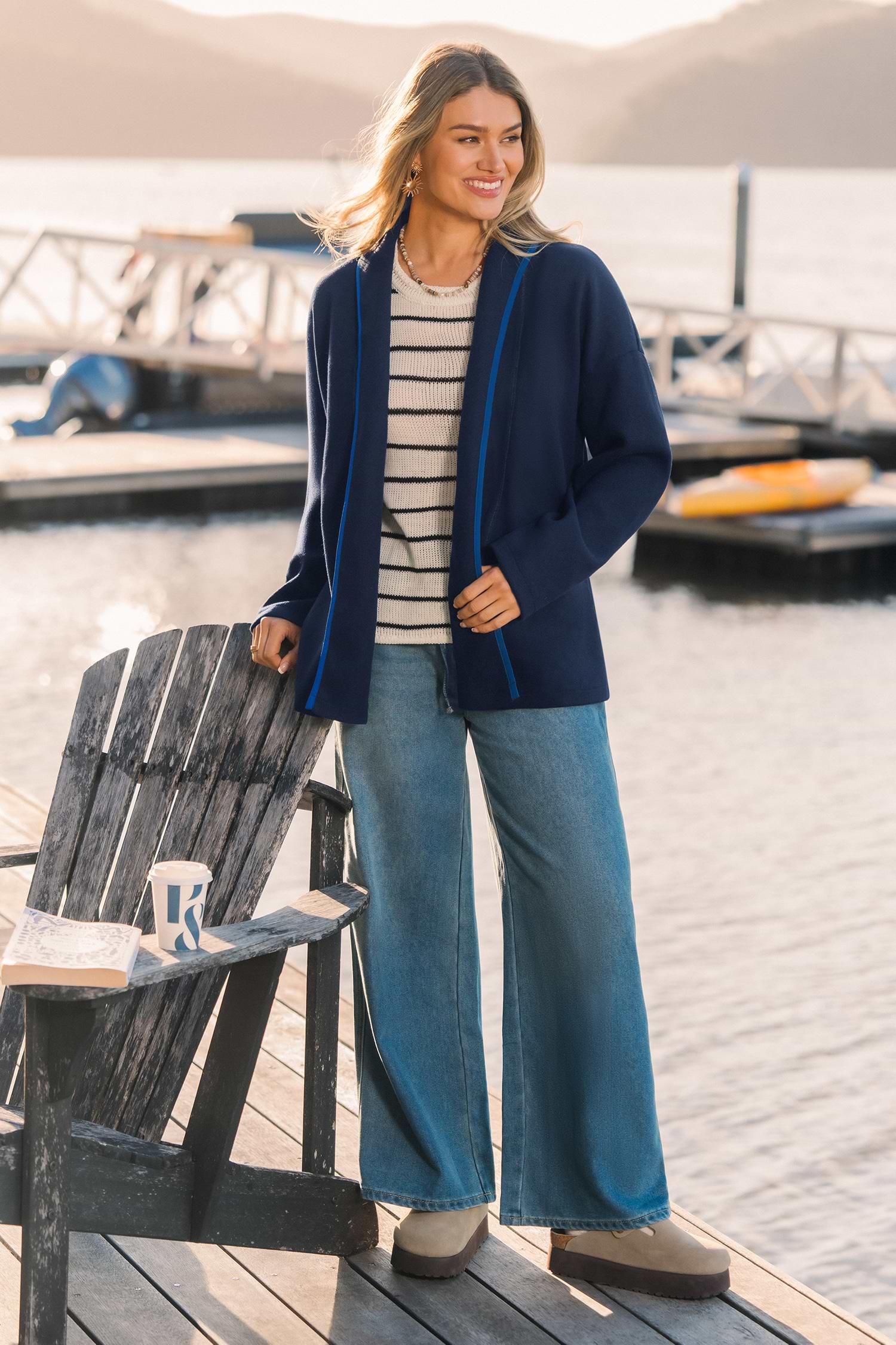 El abrigo azul Reel Talk es divertido y lleno de personalidad. Su cuello, mangas largas y detalles de peces bordados le dan un look llamativo, divertido y a la vez ponible.