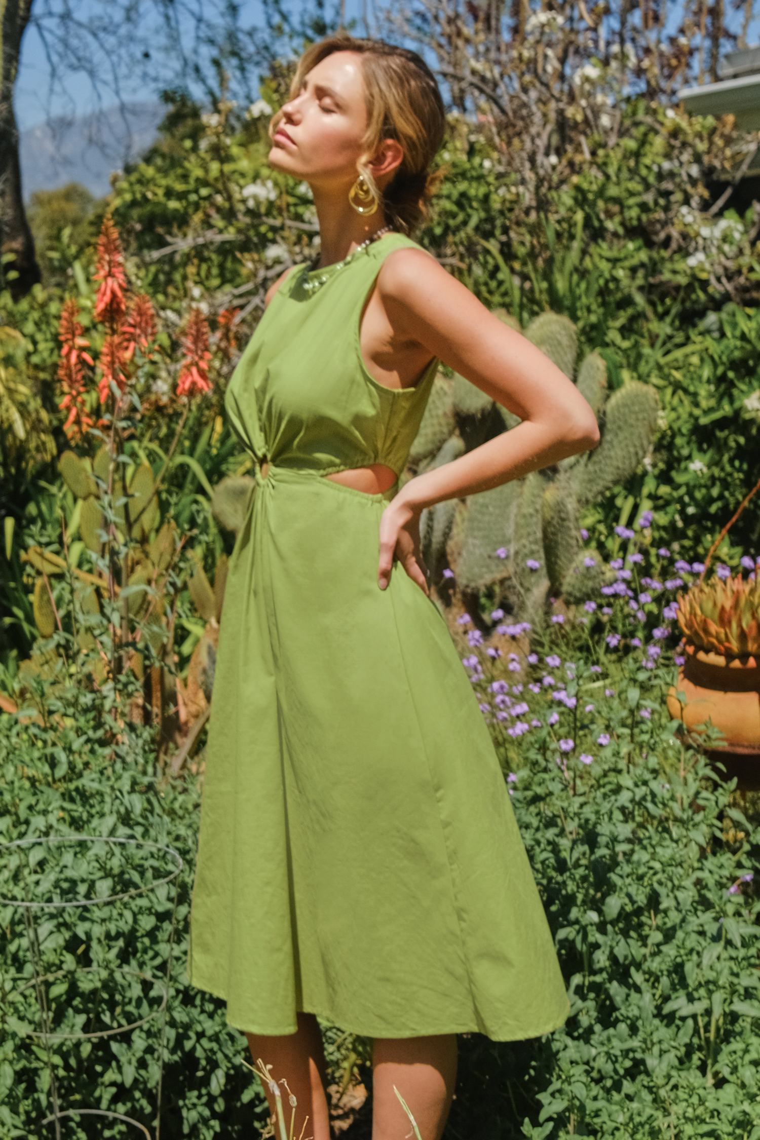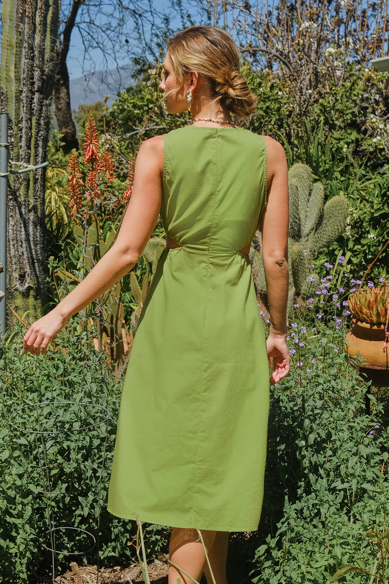Vestido midi con recortes sin mangas de lino verde lima retro
