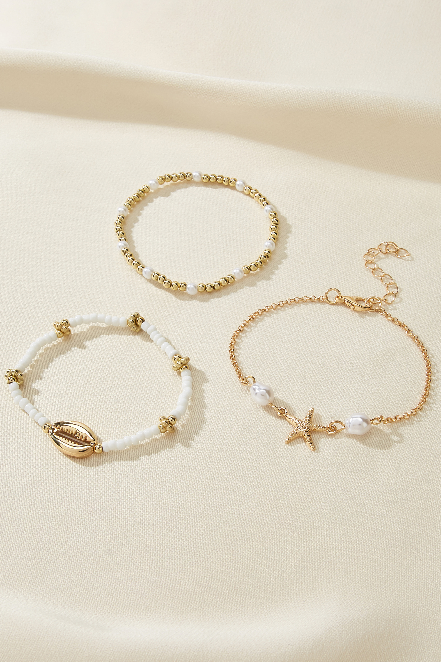 El conjunto de pulseras de cuentas Sea Foam Treasures es sinónimo de un sutil encanto playero. Tres pulseras presentan detalles de cuentas y dorados con delicados motivos playeros para un look con capas inspirado en el mar.