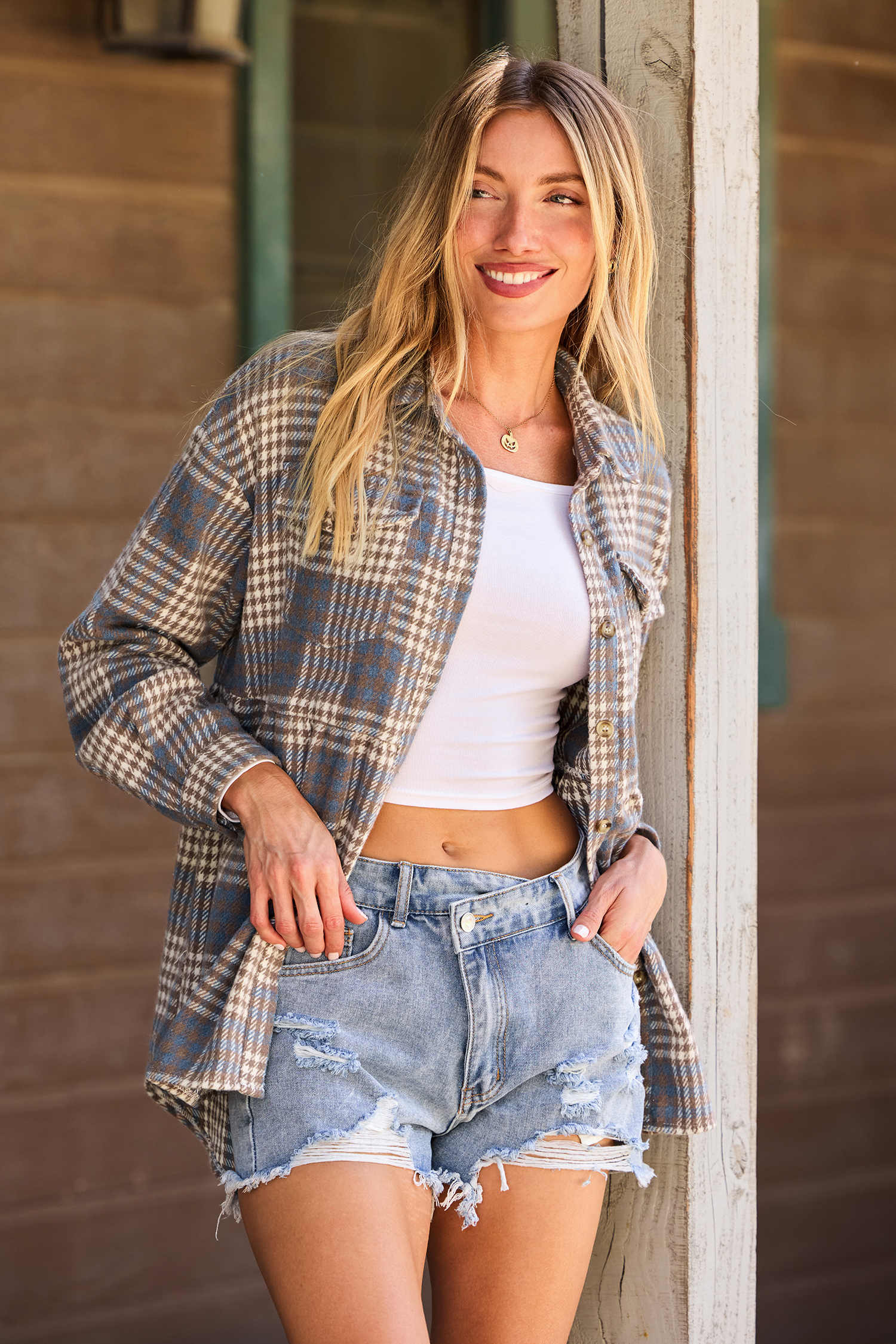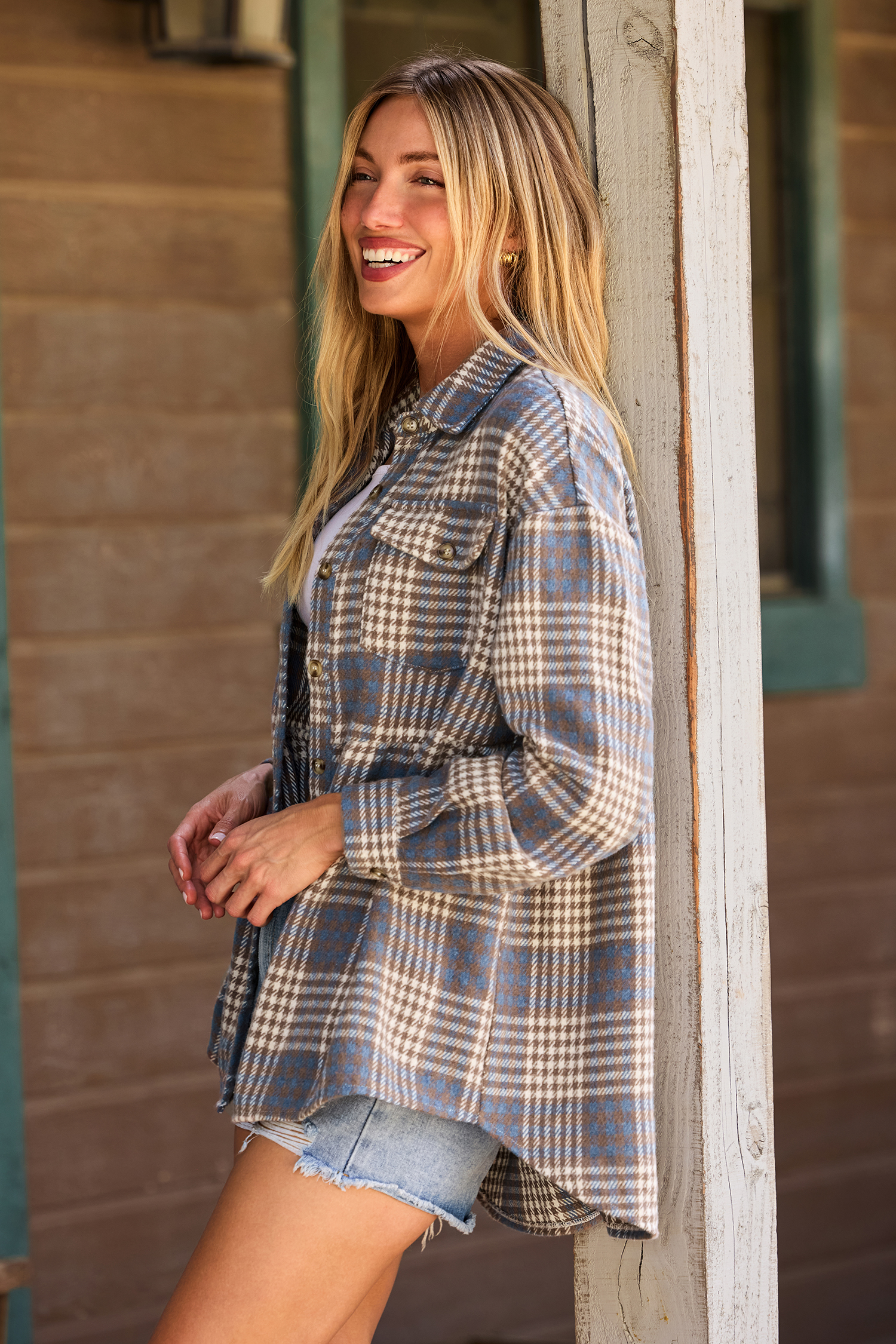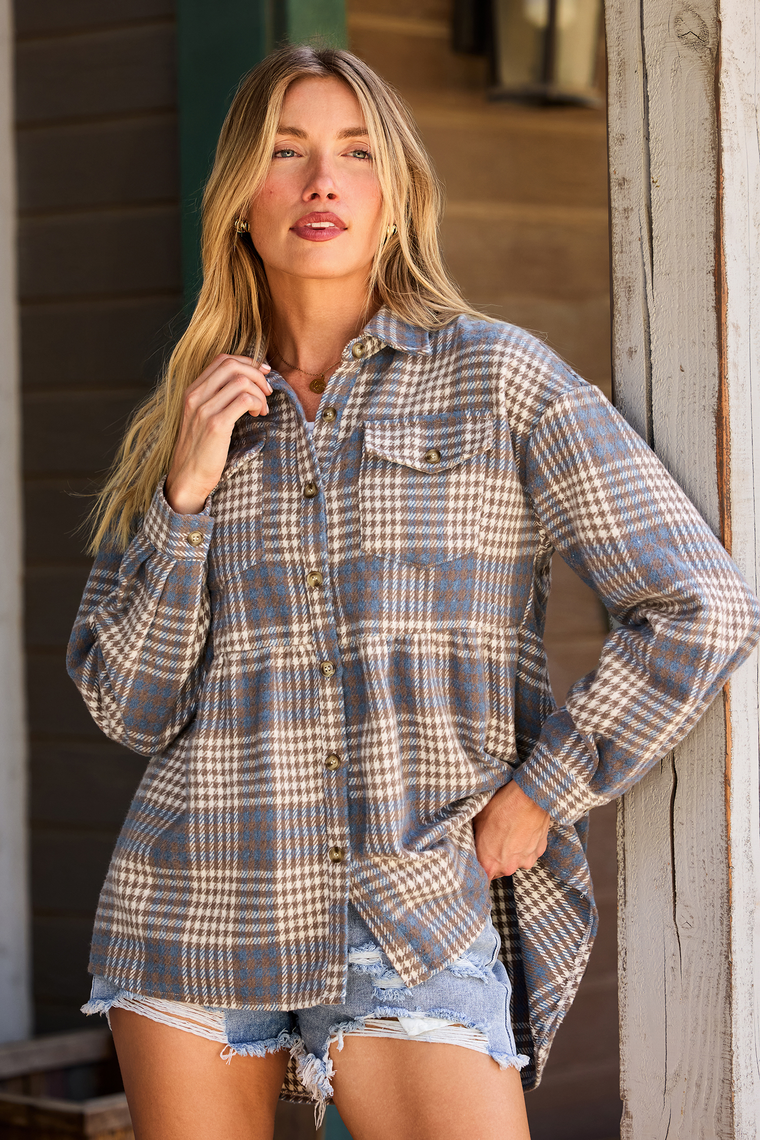 La camisa a cuadros Small Town es tu prenda ideal para un estilo relajado. Su acogedor cuello de tela, mangas largas y un práctico bolsillo la hacen perfecta para usarla en capas o sola.