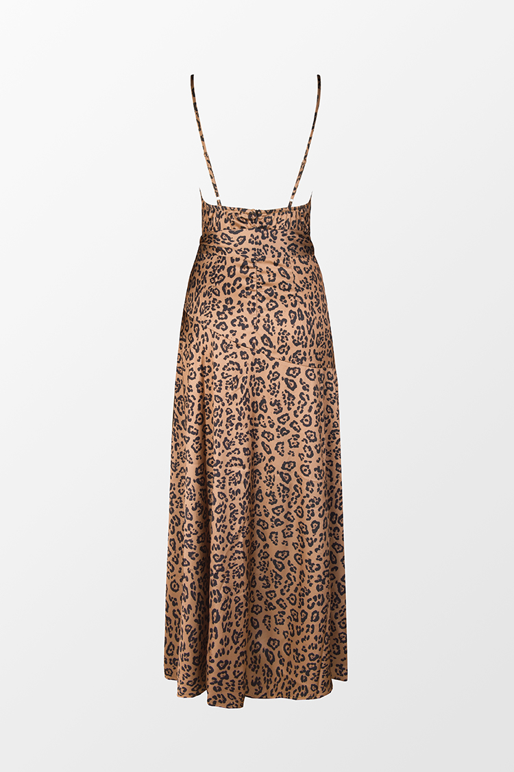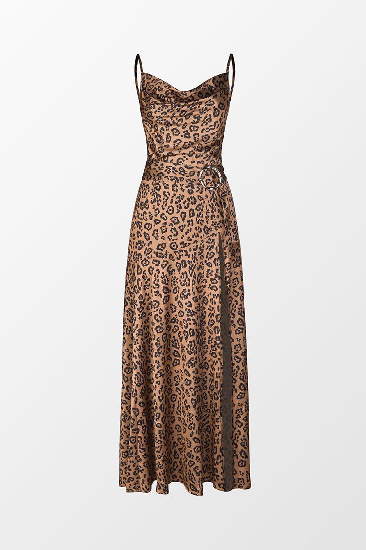 Spotlight Vestido de Satén con Cinturón de Leopardo