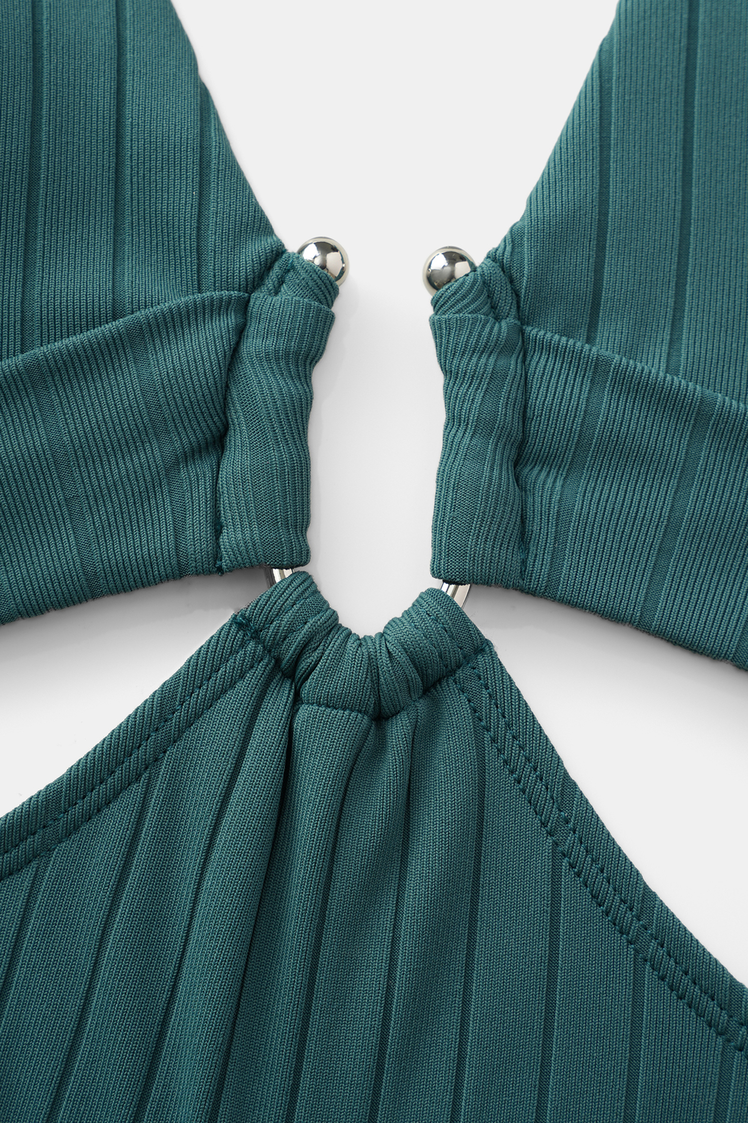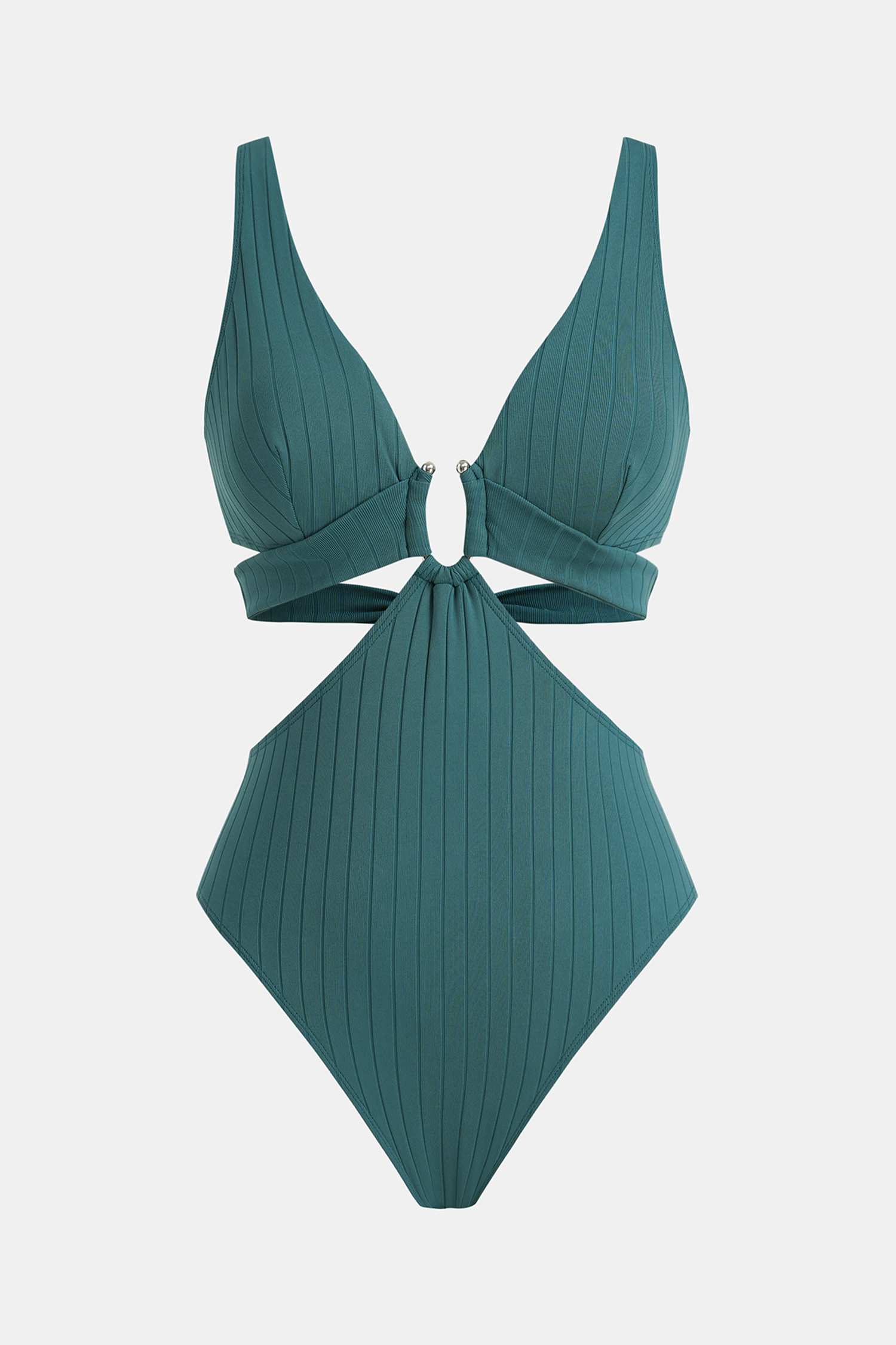 El bañador monokini Sultry Dive Green está diseñado para causar sensación. Su escote pronunciado, sus tirantes anchos y su detalle de aro en V le dan una silueta impactante, mientras que las copas suaves extraíbles y la sujeción media del busto garantizan comodidad. El corte alto de pierna y la moderna cobertura de glúteos le dan un toque contemporáneo, convirtiéndolo en un imprescindible para tu próxima aventura en la playa.