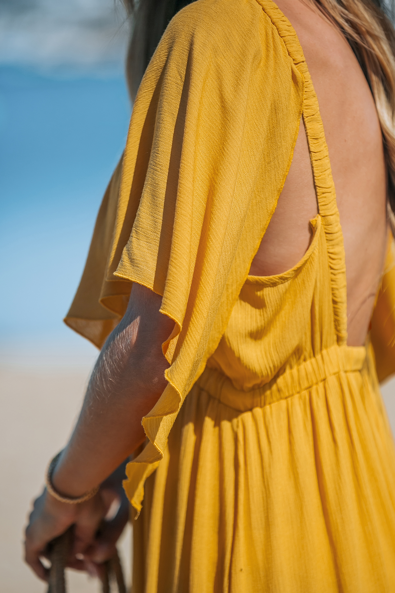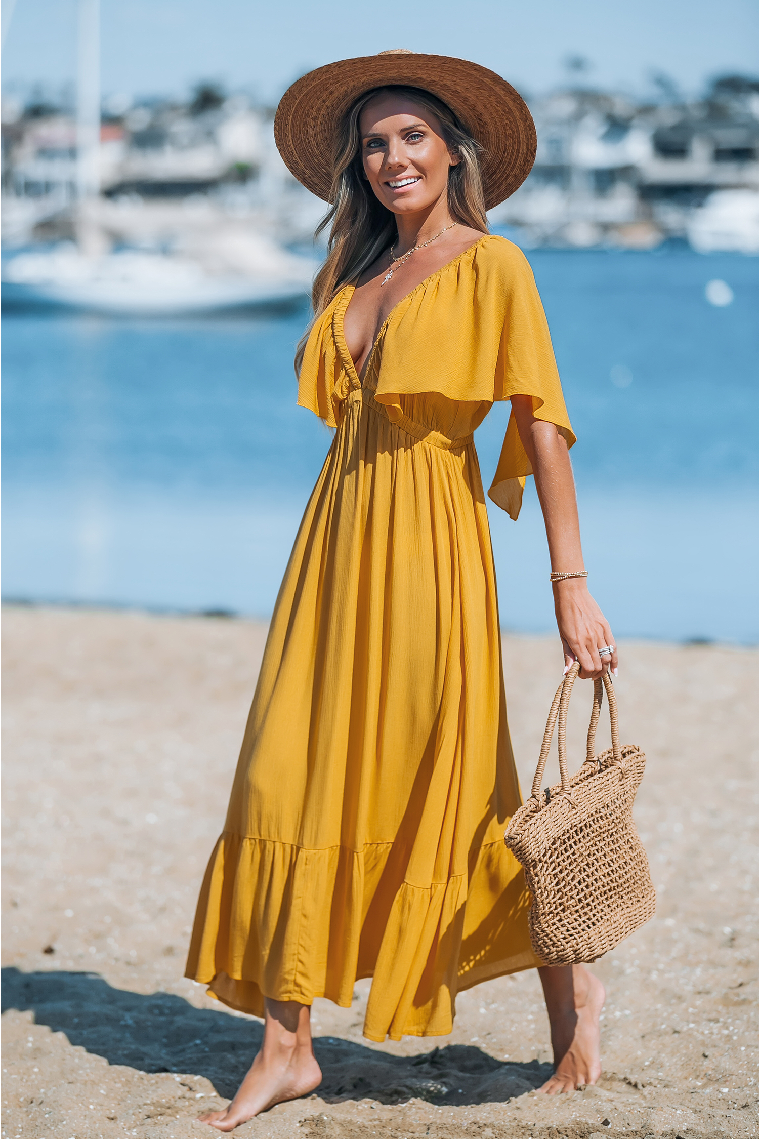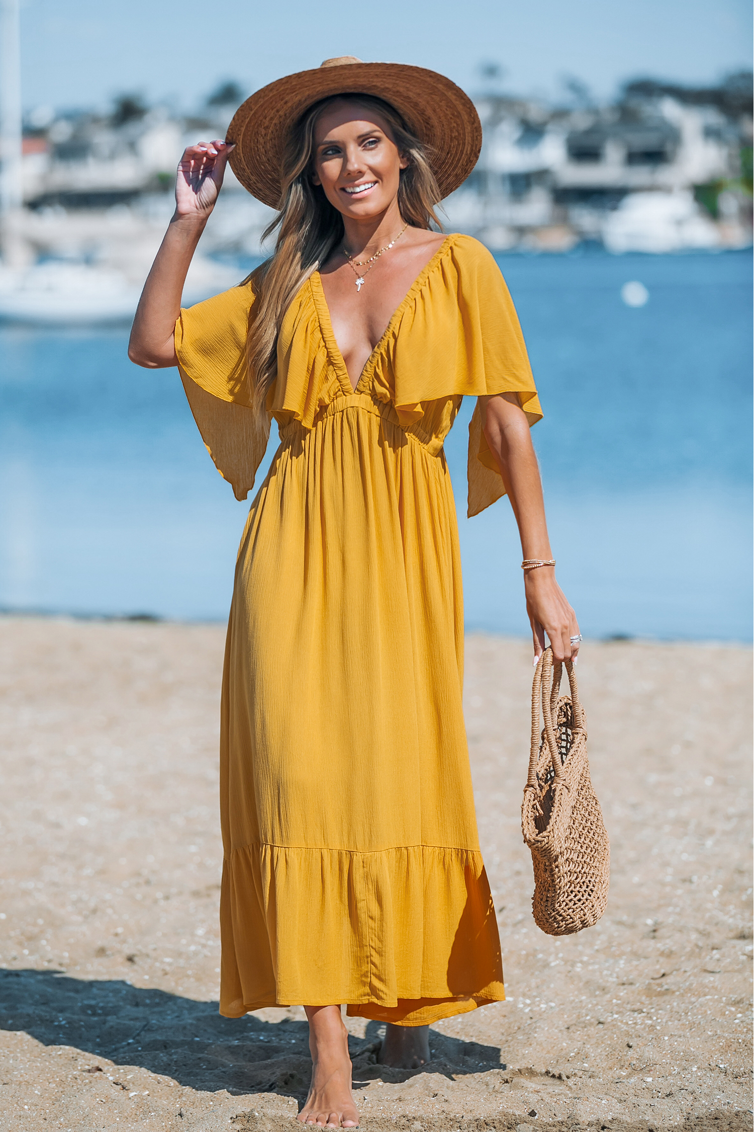Vestido midi con mangas de mariposa hundidas en amarillo girasol