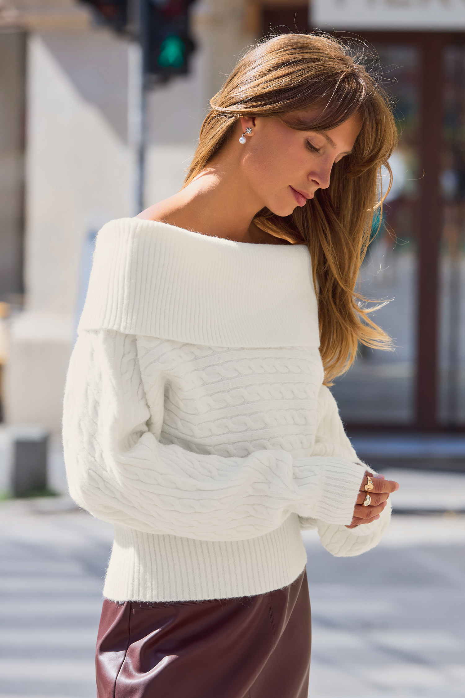 El suéter Take Notice Cream aporta un toque de coquetería y seguridad a tu armario de invierno. Con escote con hombros descubiertos, mangas largas y detalle de vuelta, es perfecto para un look elegante y sin esfuerzo.