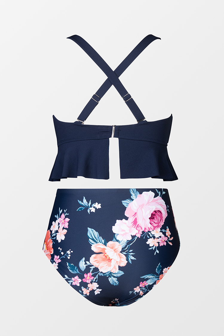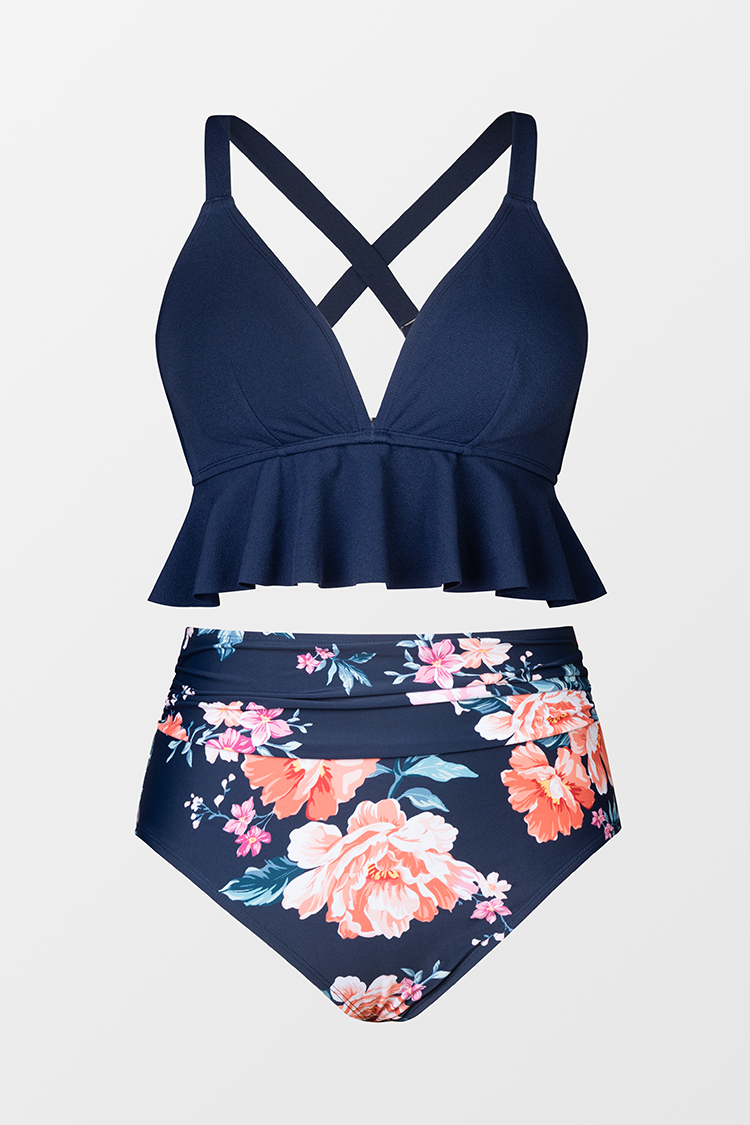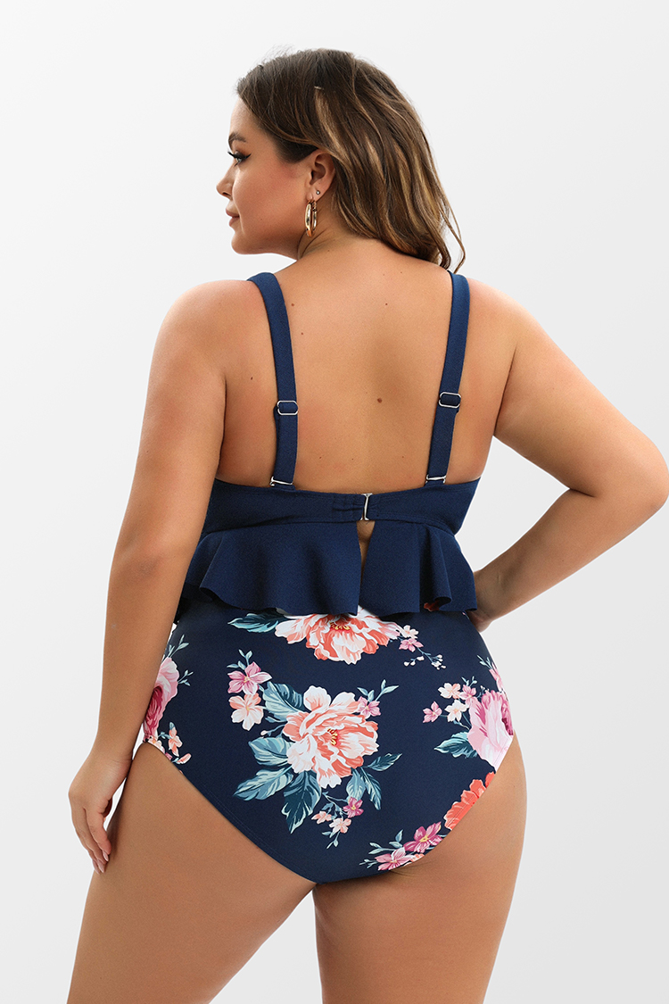 Tankini con volantes y cuello en V y cintura alta con estampado floral de talla grande
