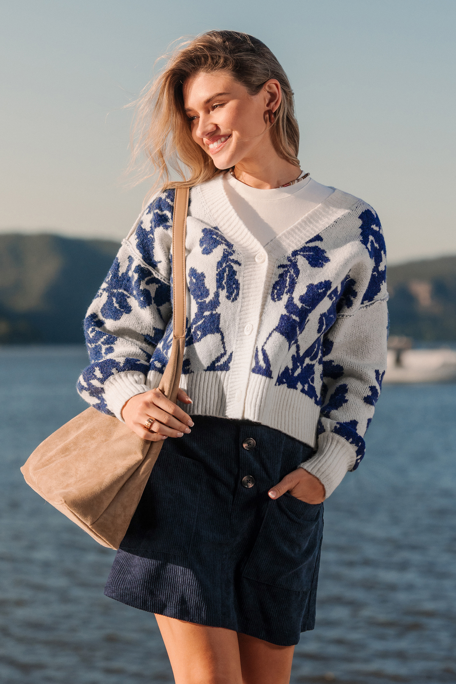 El cárdigan floral Tea & Petals es suave, femenino y elegante. Su escote en V y mangas largas crean una silueta relajada, perfecta para combinar con tus blusas o vestidos favoritos y lograr un look acogedor y coqueto.