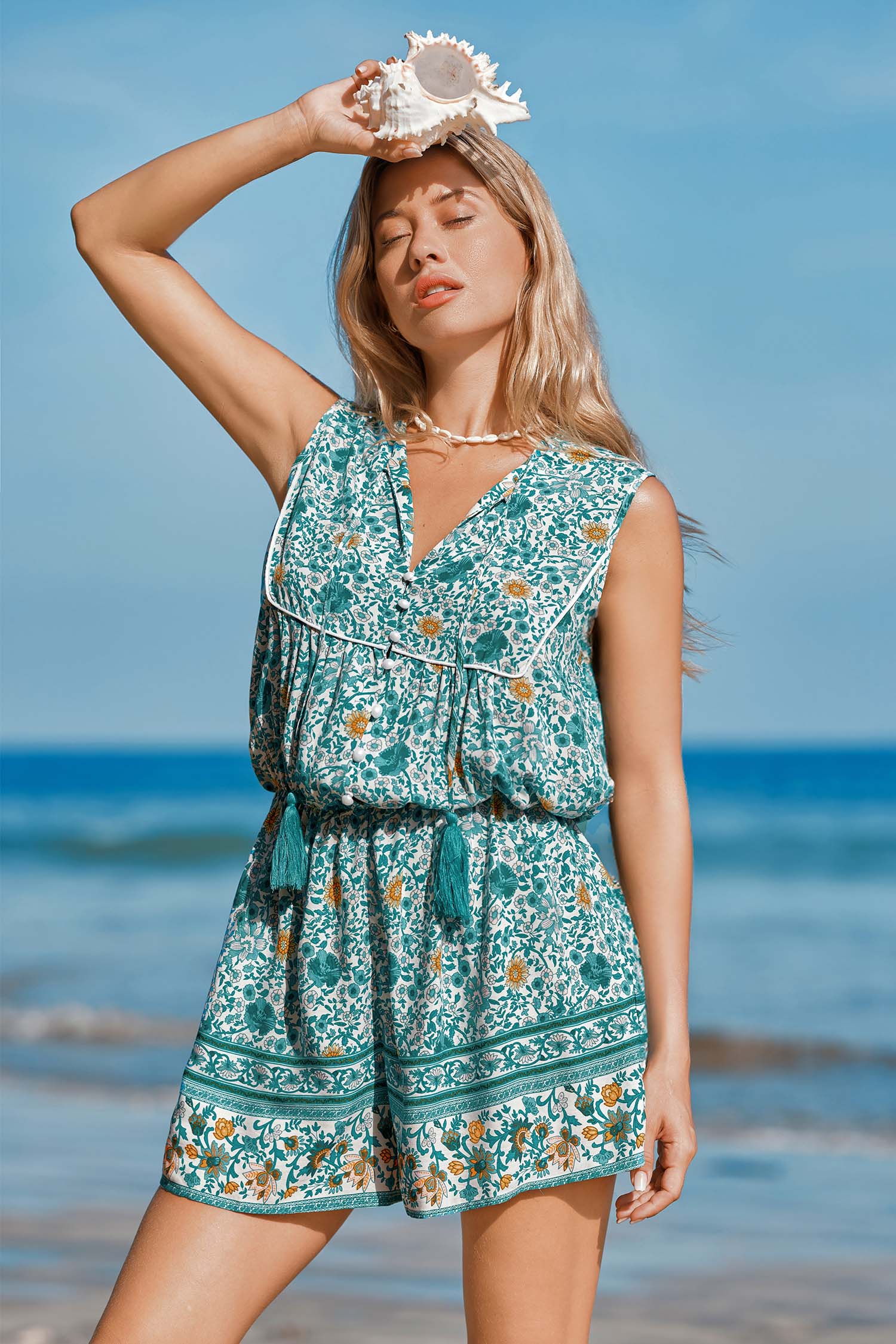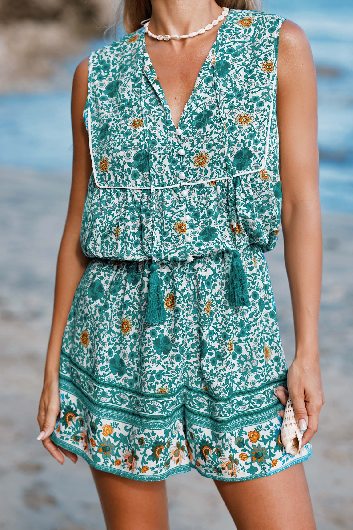 InicioMameluco floral y borlas en verde azulado