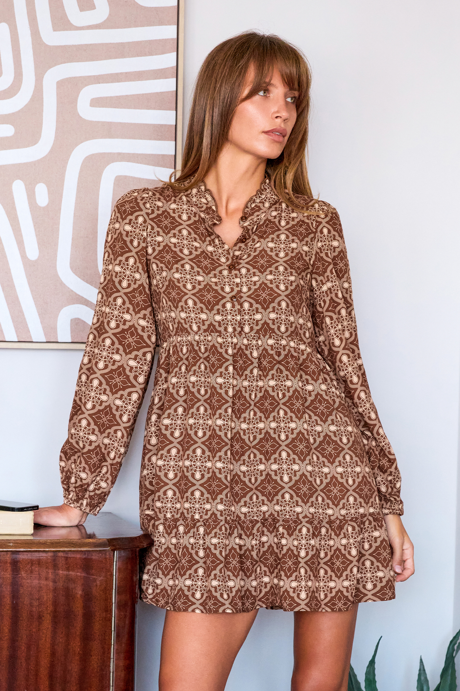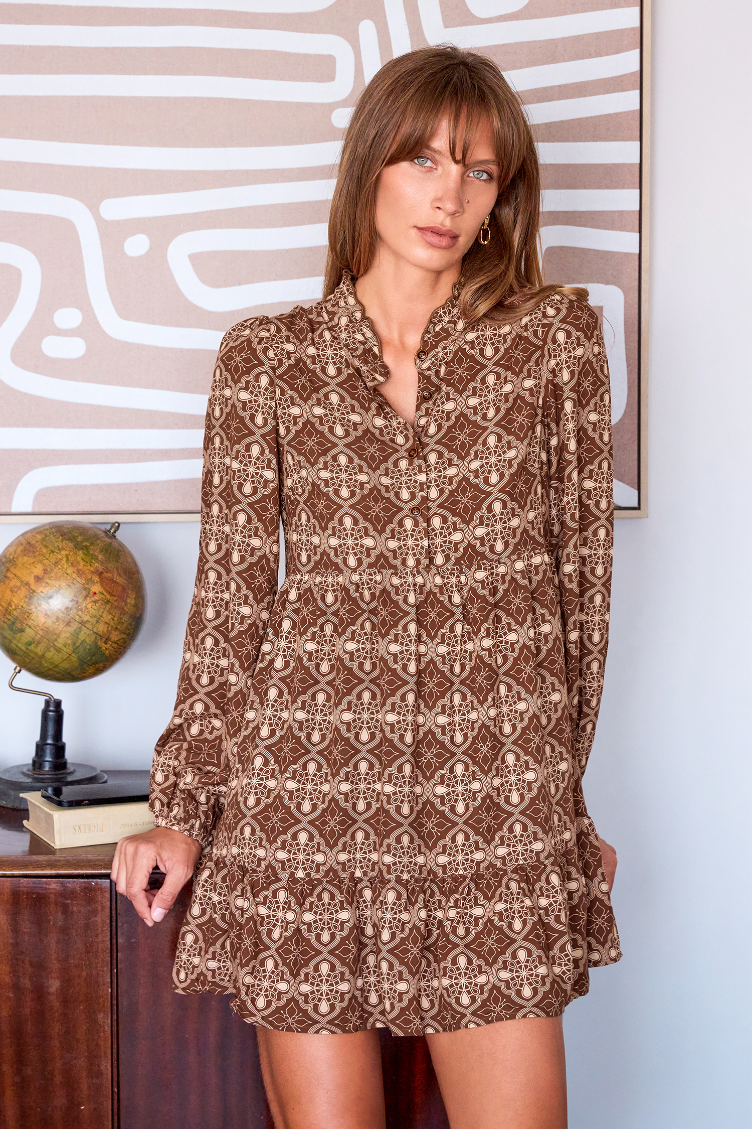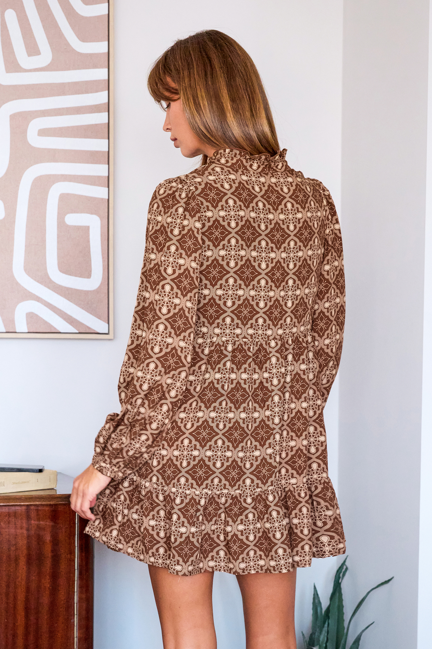 El minivestido adornado en caramelo tostado es femenino y coqueto, perfecto para los días de otoño y las noches más acogedoras. Su escote alto, mangas largas y largo mini lo convierten en una prenda destacada para las salidas de temporada.
