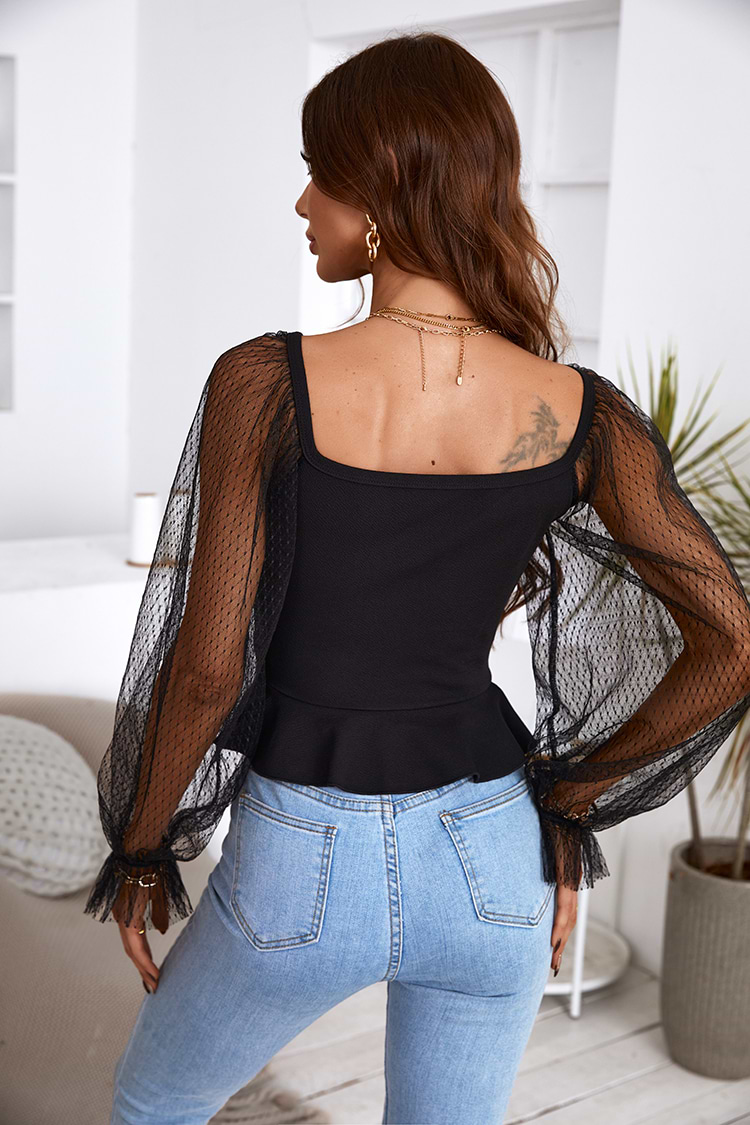 Top de Encaje de Escote Pronunciado de Manga Larga en Contraste