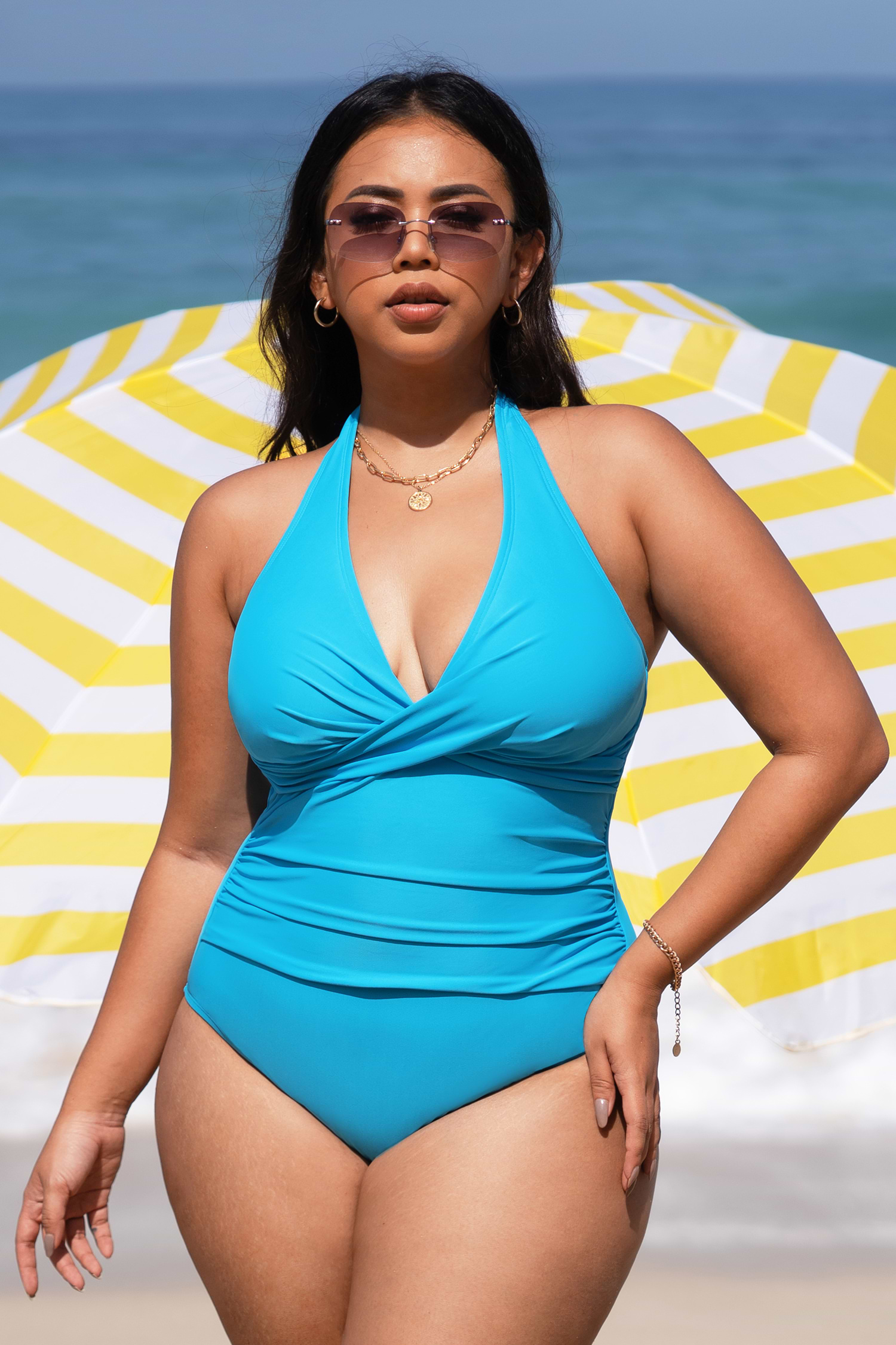 Traje de baño de una pieza de talla grande fruncido con cuello halter cruzado
