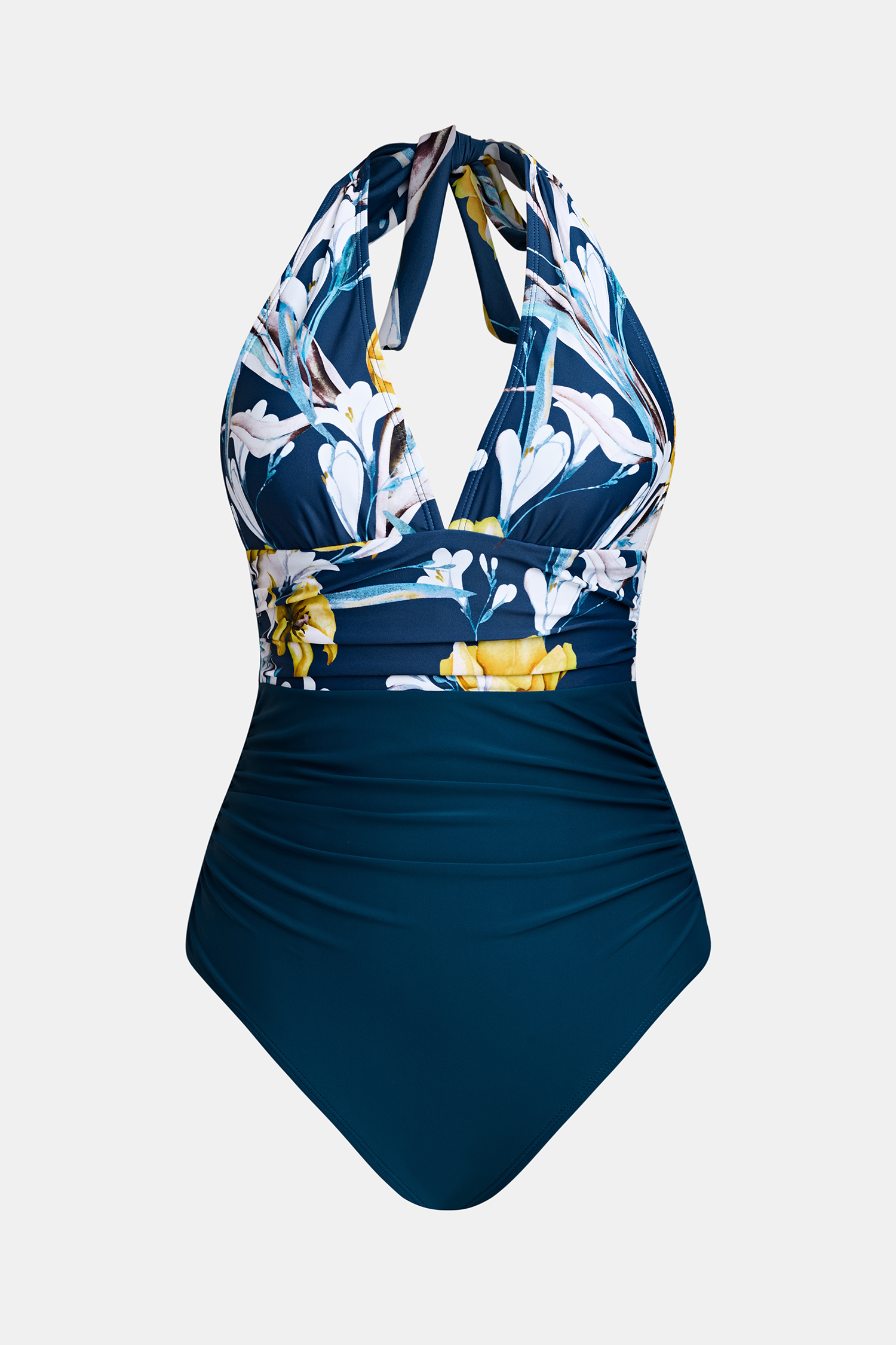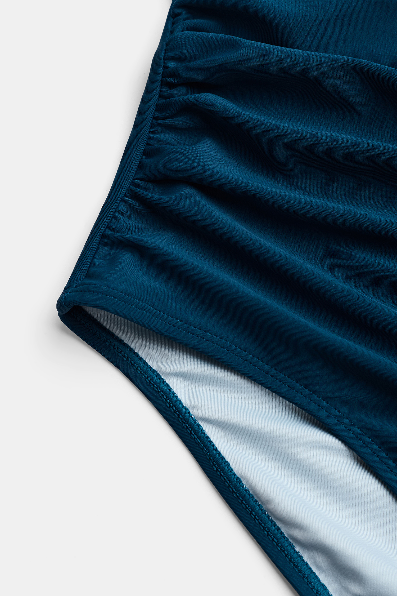 ¡Ponte este clásico traje de baño de una pieza y sumérgete! El fruncido femenino le da a este traje de baño un ajuste favorecedor, mientras que el escote pronunciado y el diseño sin espalda añaden glamour a este traje de baño. Llévalo con elegantes chanclas o con accesorios a juego.