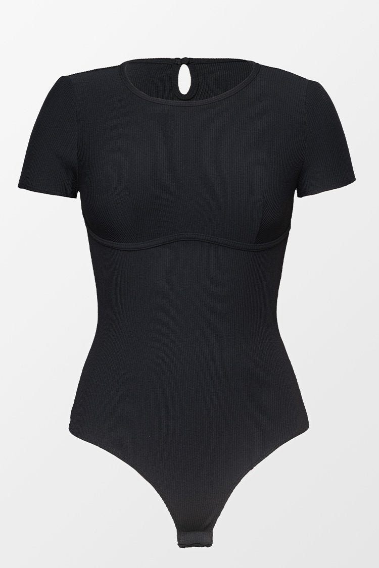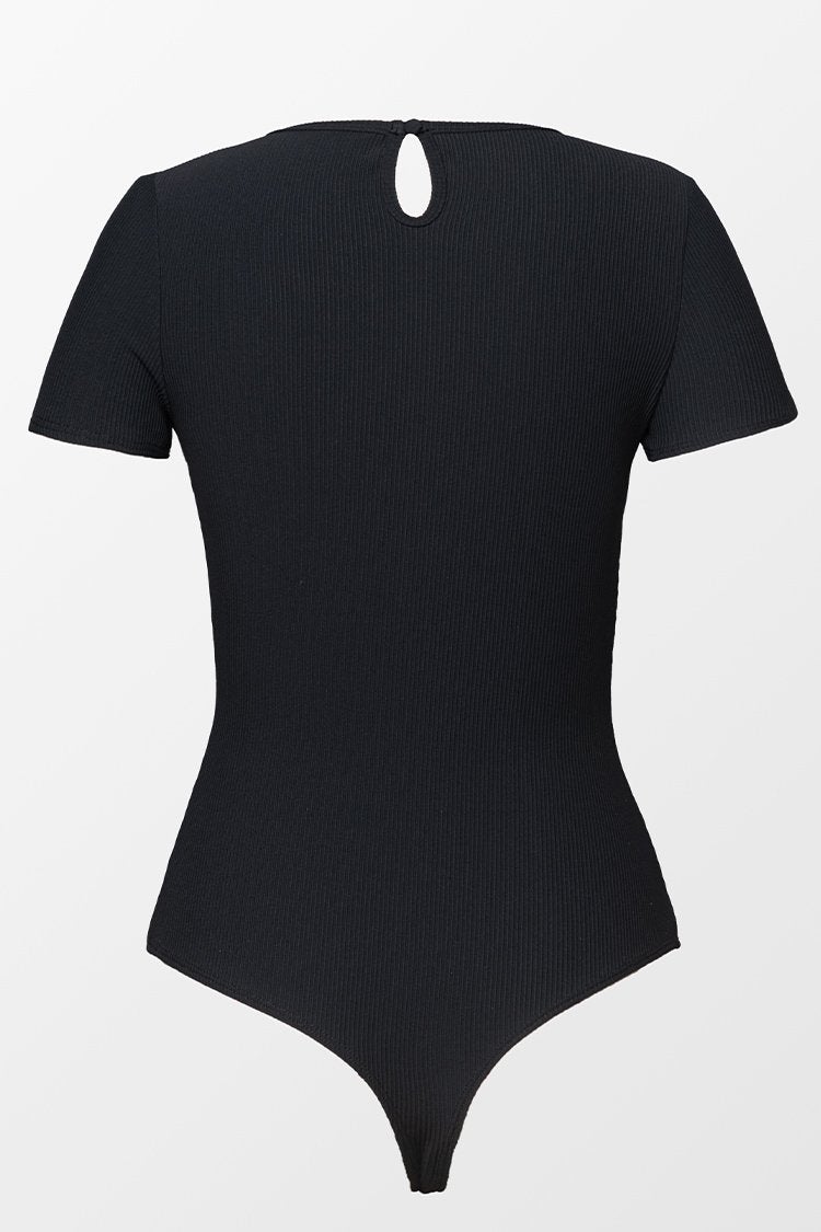 Traje tipo body atrevido de manga corta con cuello redondo negro Angelica