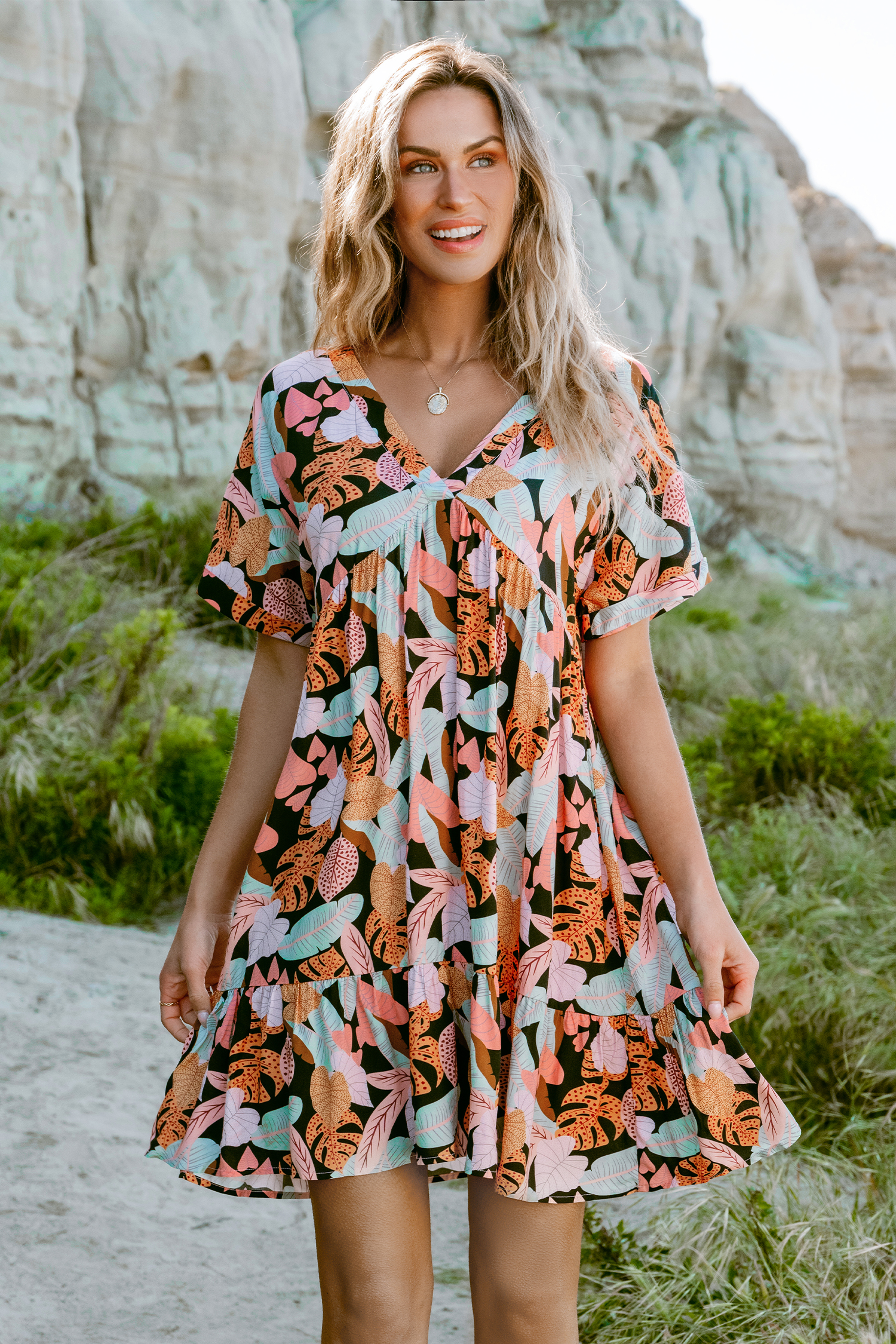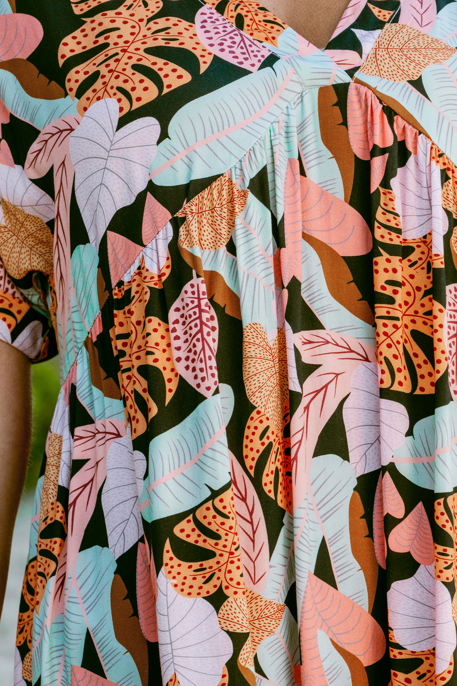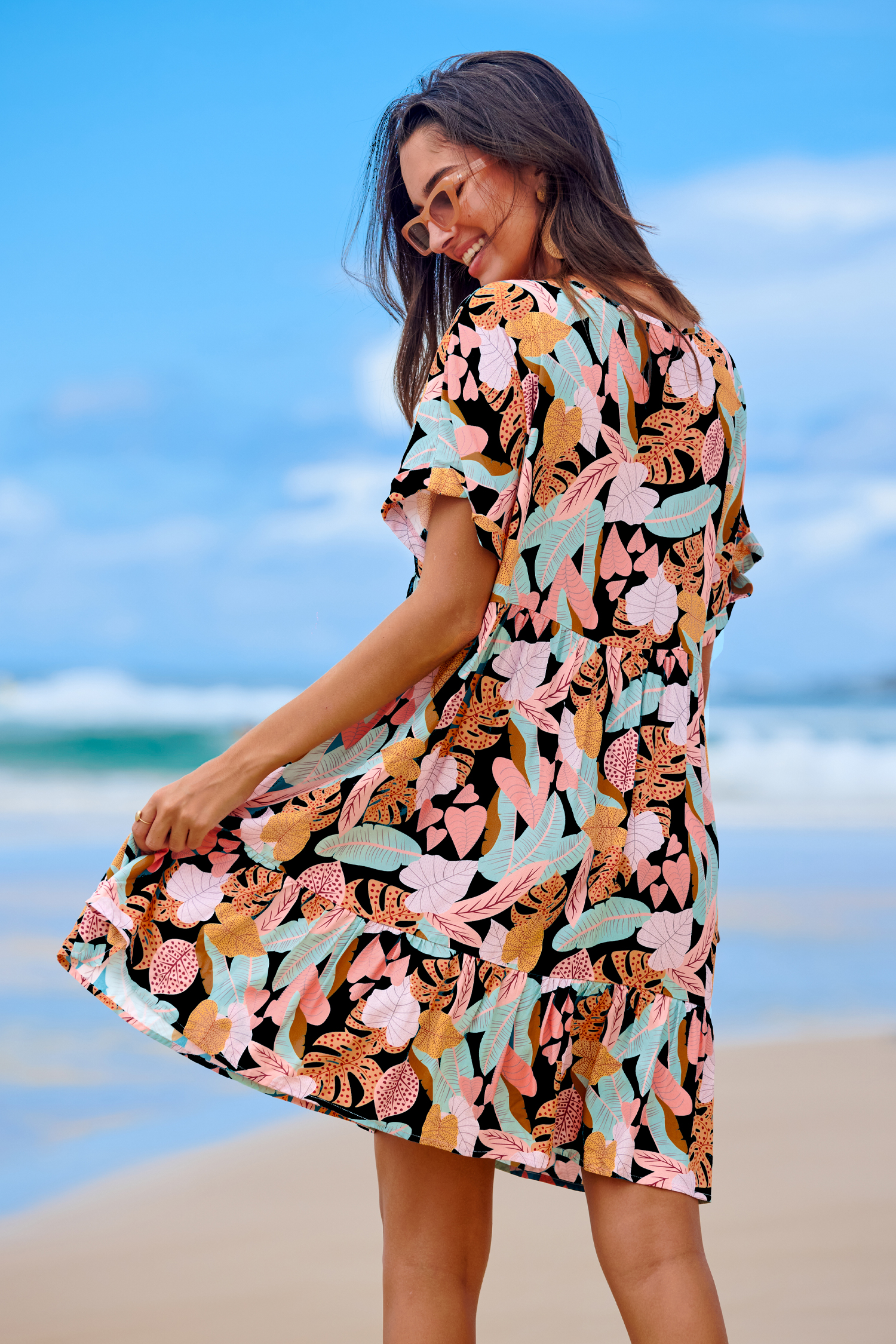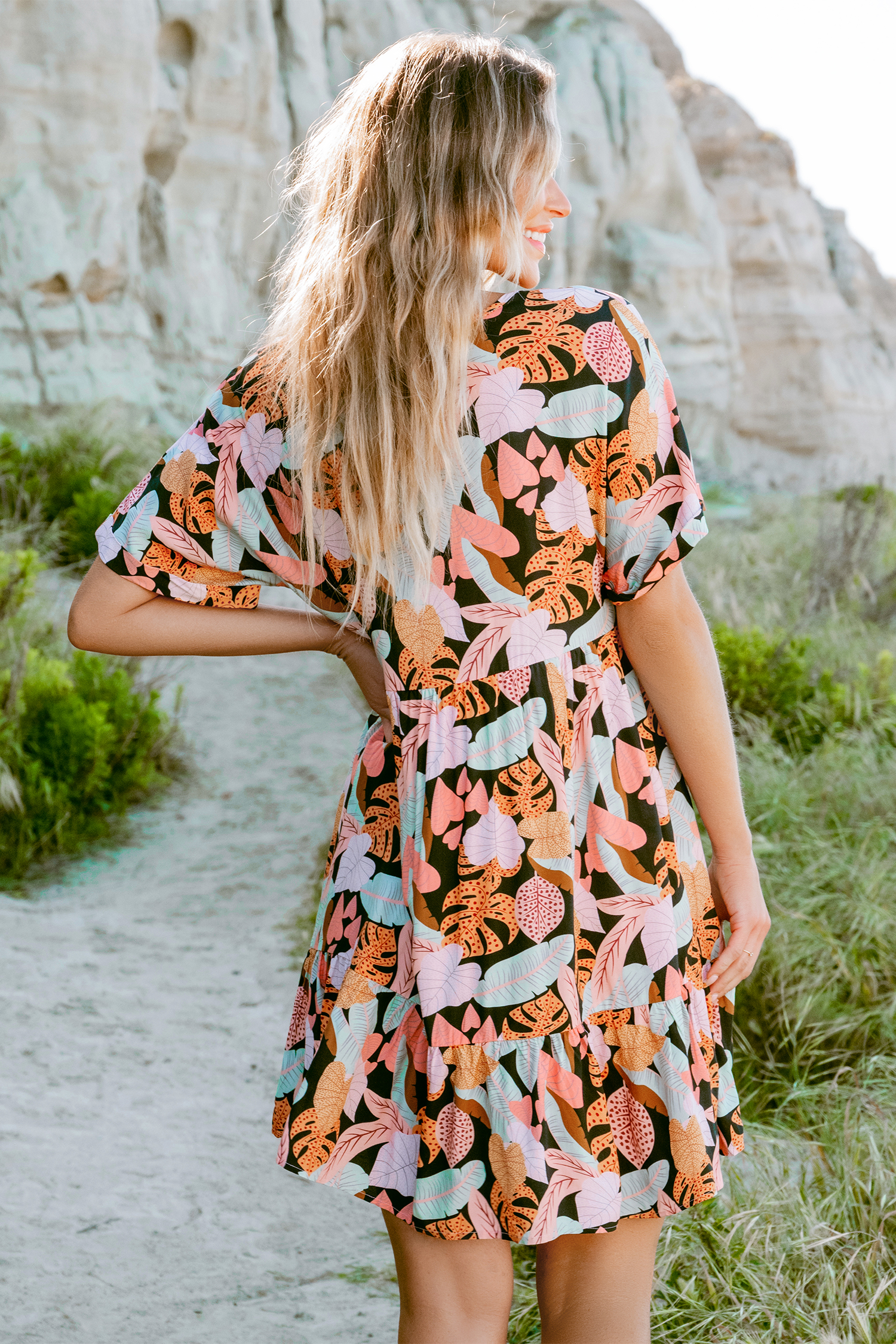 Minivestido de manga corta con dobladillo con volante y hojas tropicales
