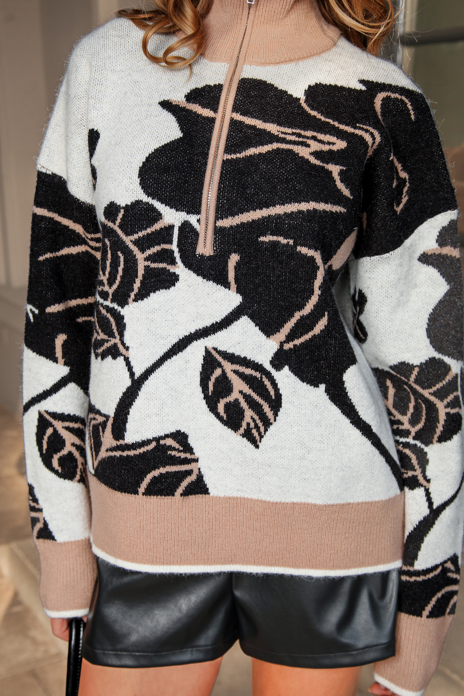 El suéter floral Trust Me será tu nuevo favorito para un look acogedor y adorable. Su cuello alto y mangas largas te mantendrán abrigado, mientras que la cremallera de un cuarto y el estampado floral le dan un toque divertido y coqueto.