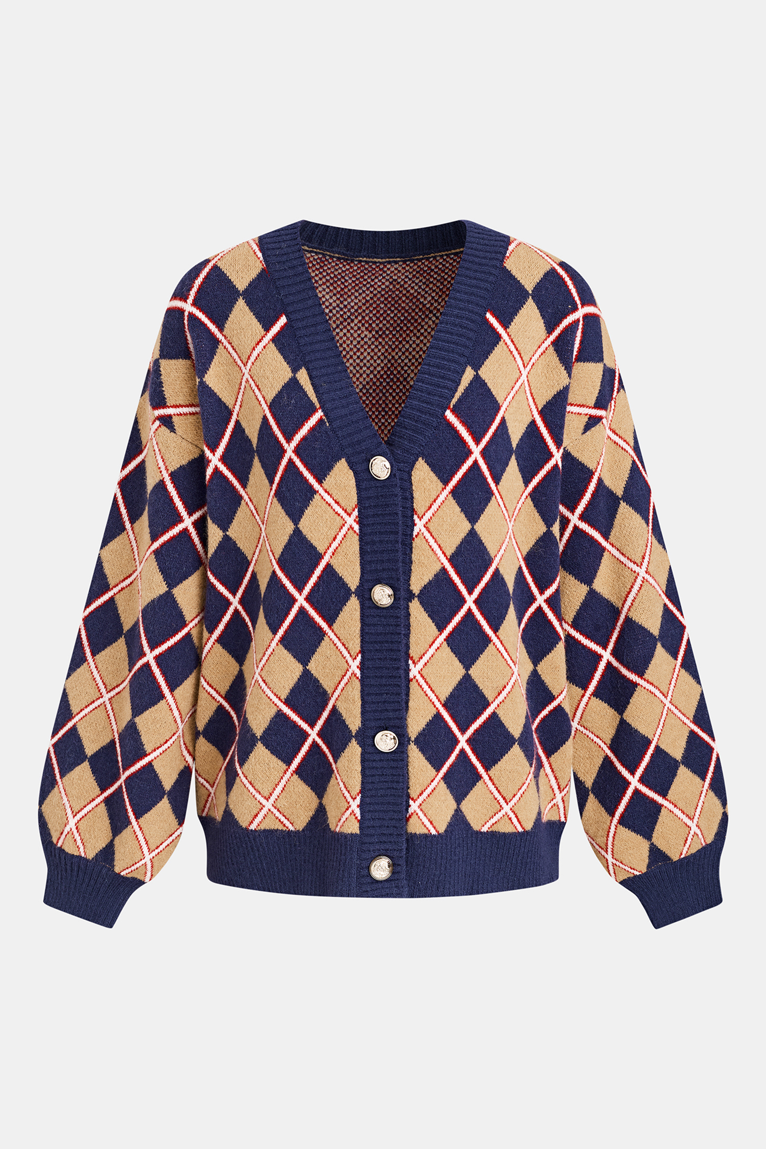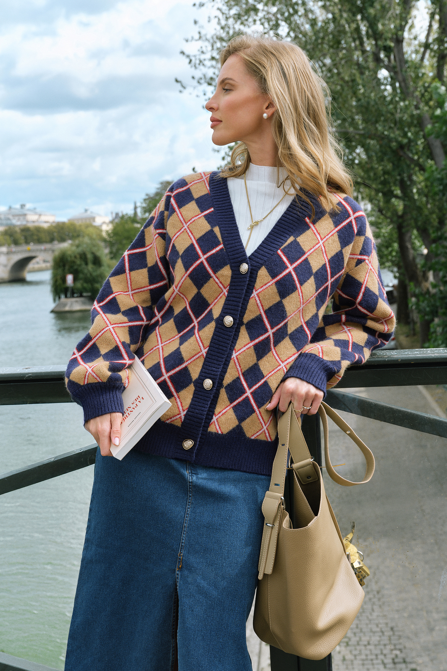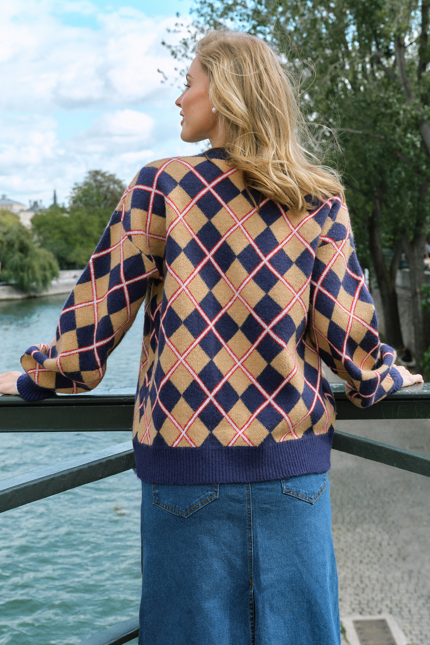 ¡El cárdigan de rombos Varsity Vibes es un toque divertido! Su escote en V y mangas largas lo hacen atemporal y cómodo.