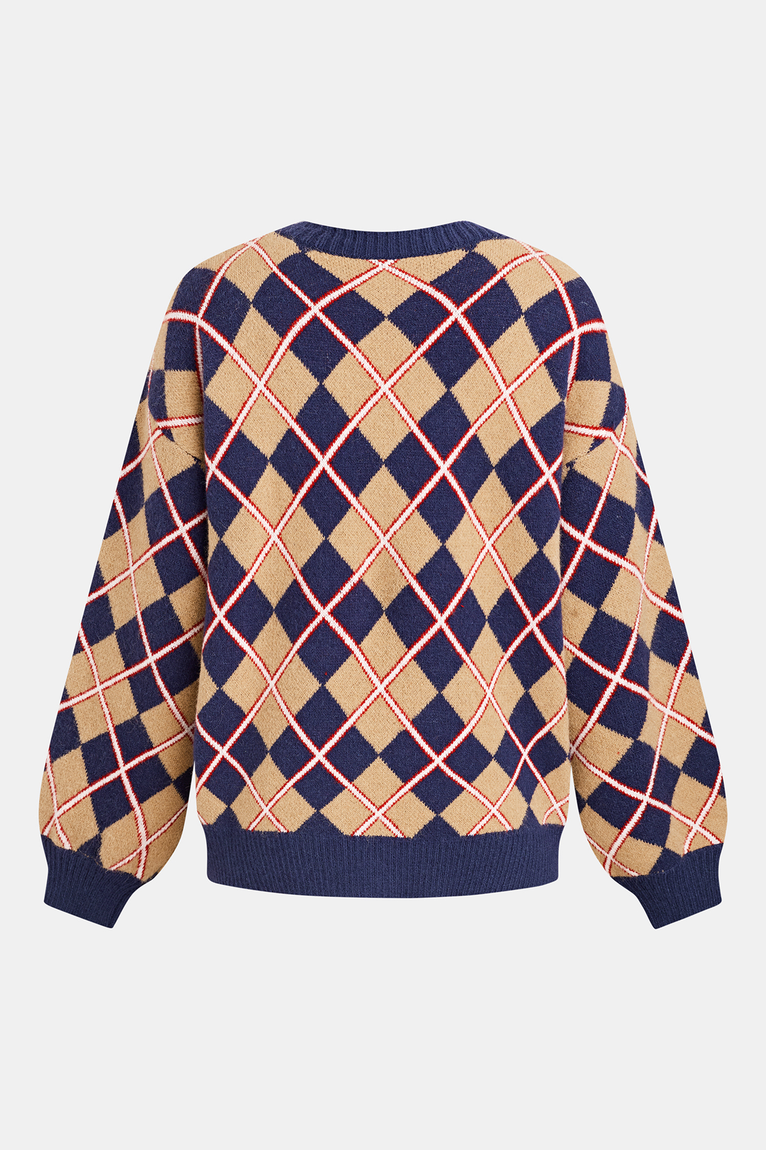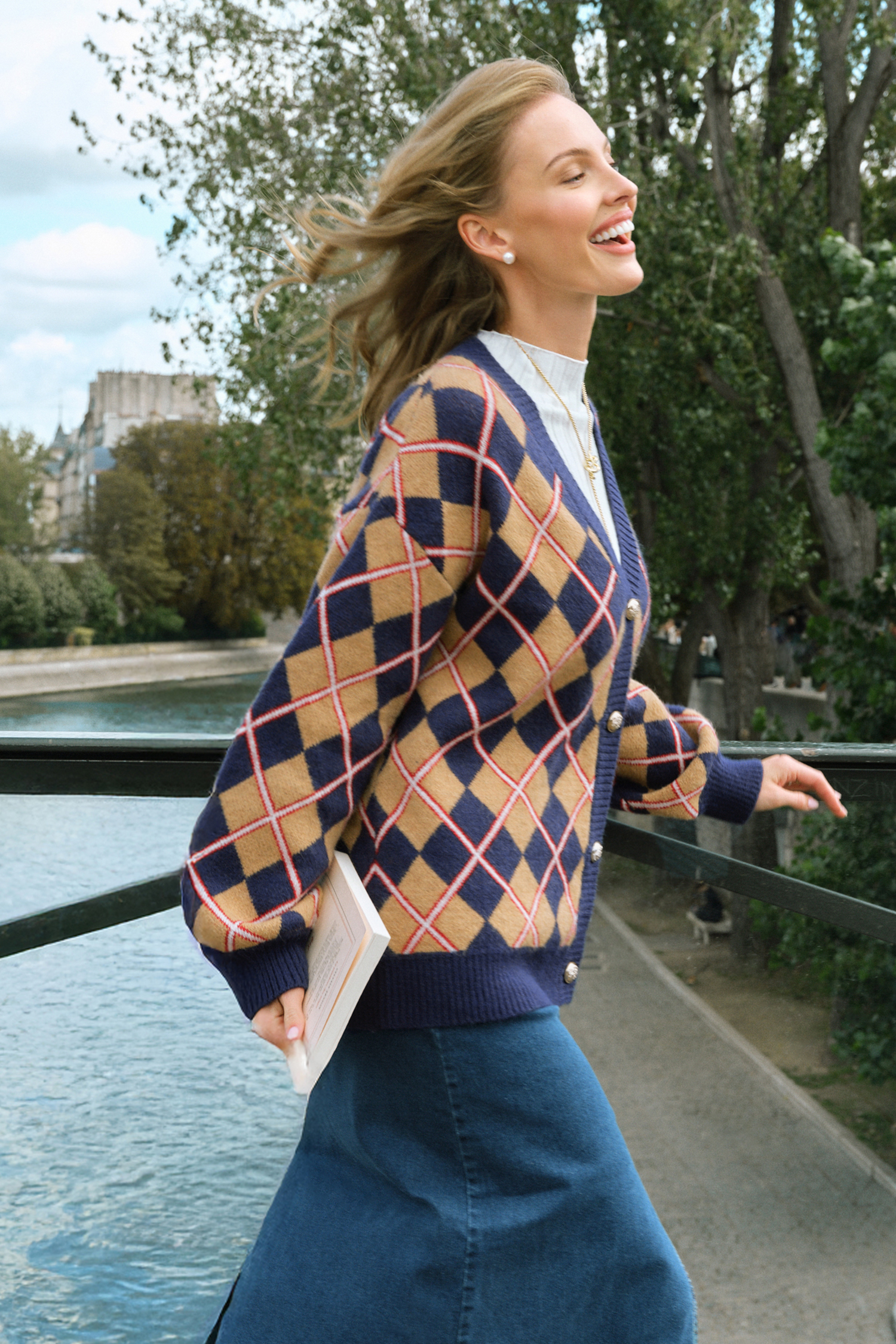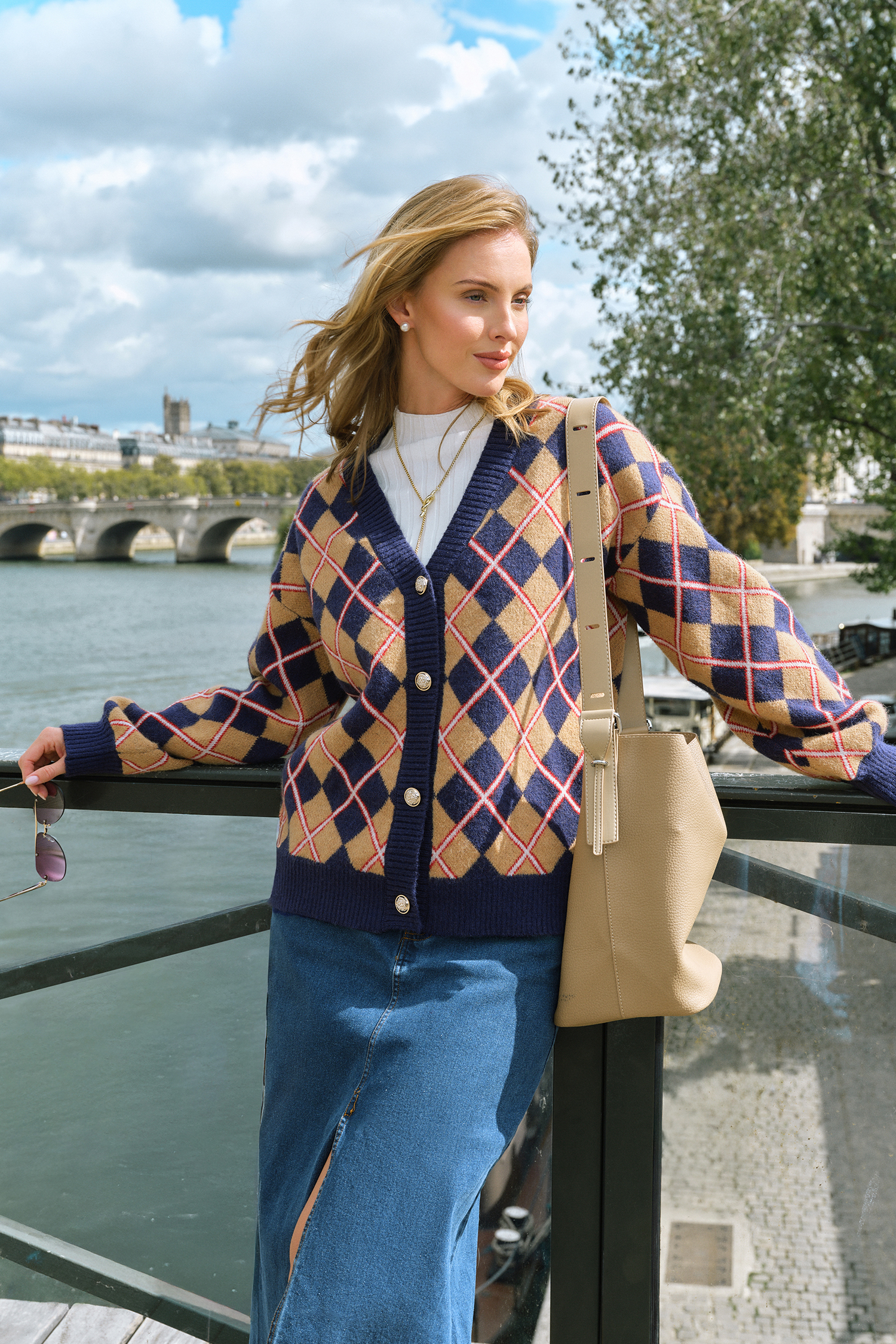 ¡El cárdigan de rombos Varsity Vibes es un toque divertido! Su escote en V y mangas largas lo hacen atemporal y cómodo.