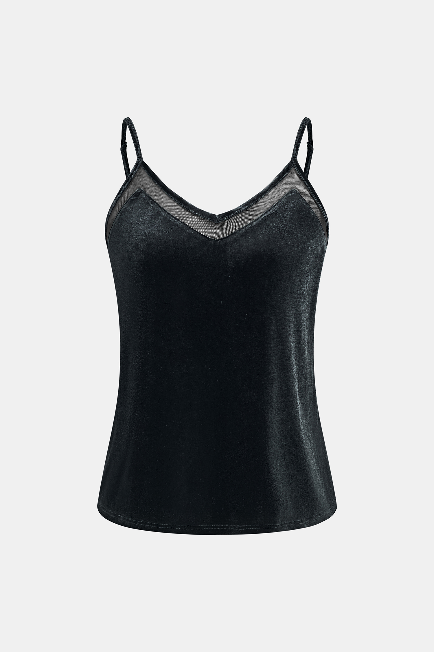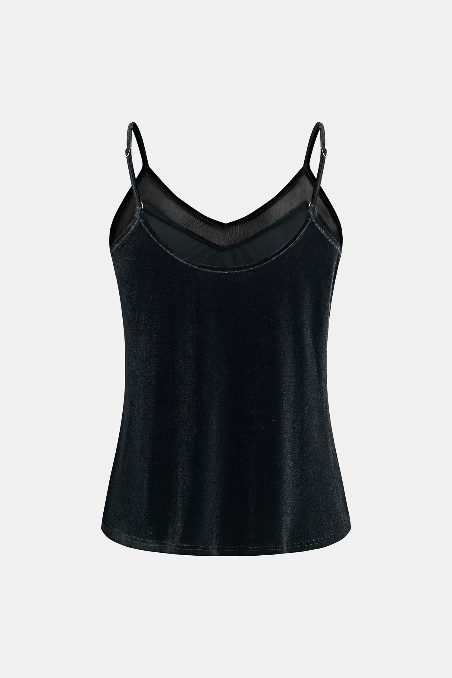 La camiseta de tirantes Velvet Allure Black aporta un toque lujoso y coqueto a cualquier look. Su escote en V y corte sin mangas la hacen perfecta para combinar con otras prendas en otoño.